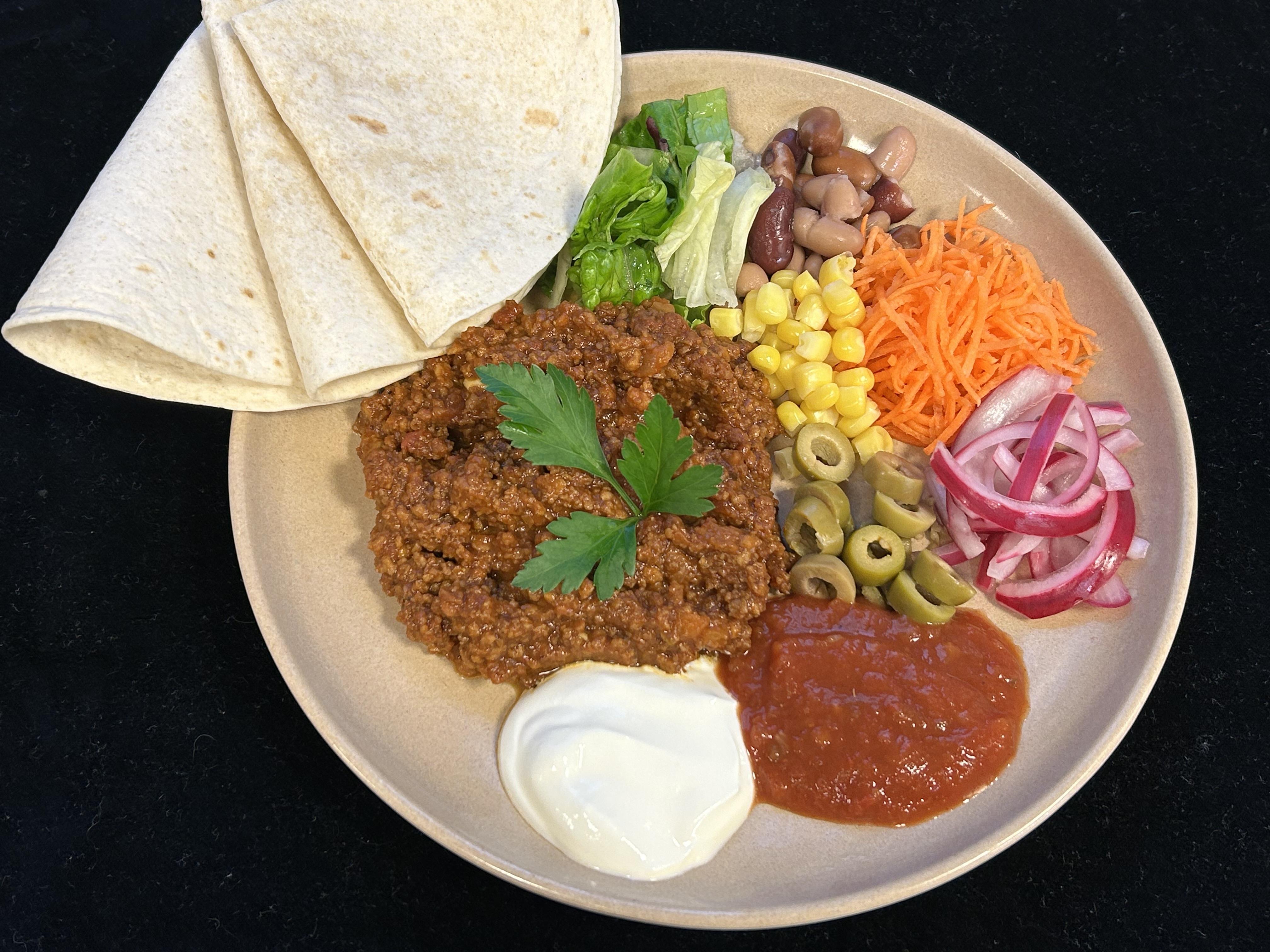Tacoröra på sojafärs serveras med tillbehör vintertacos