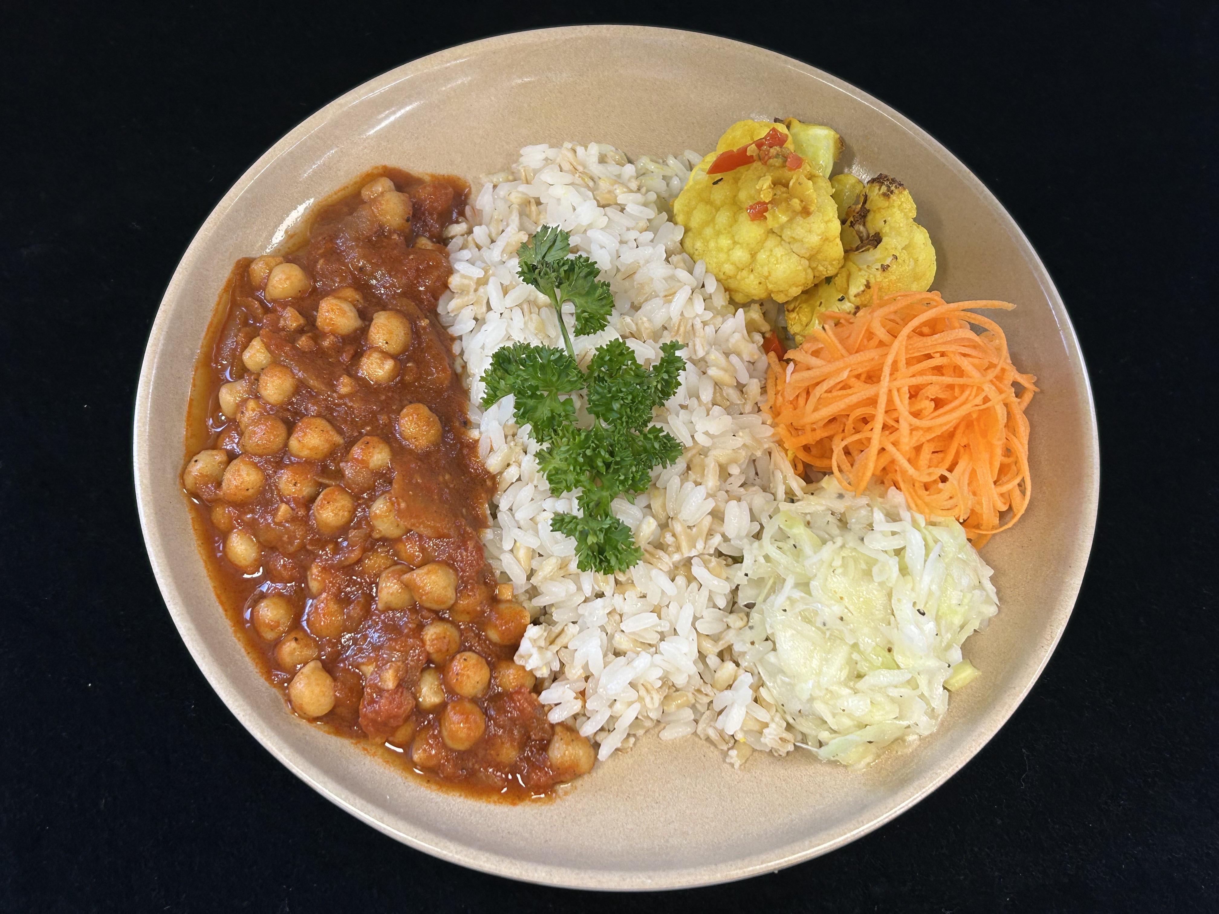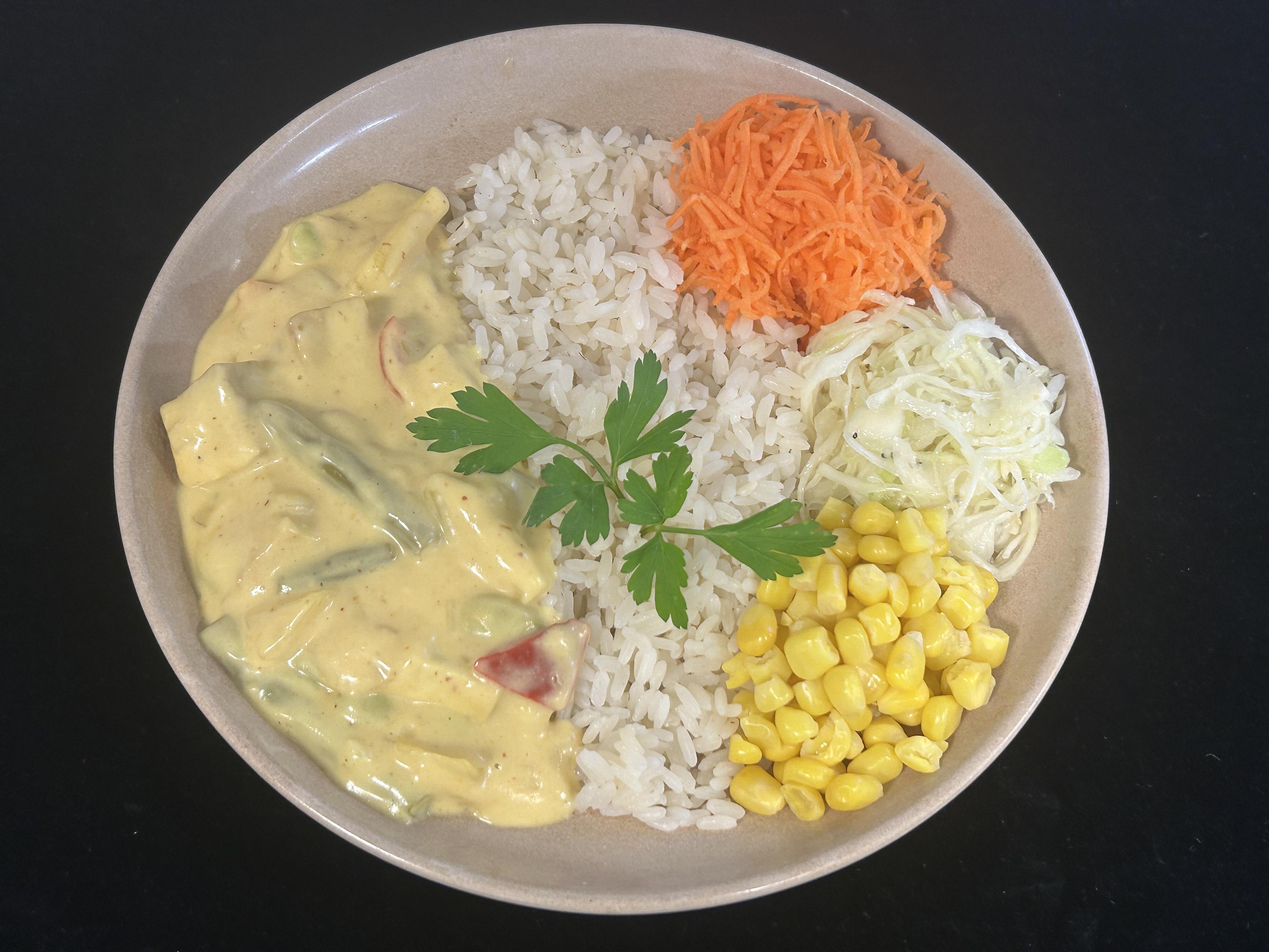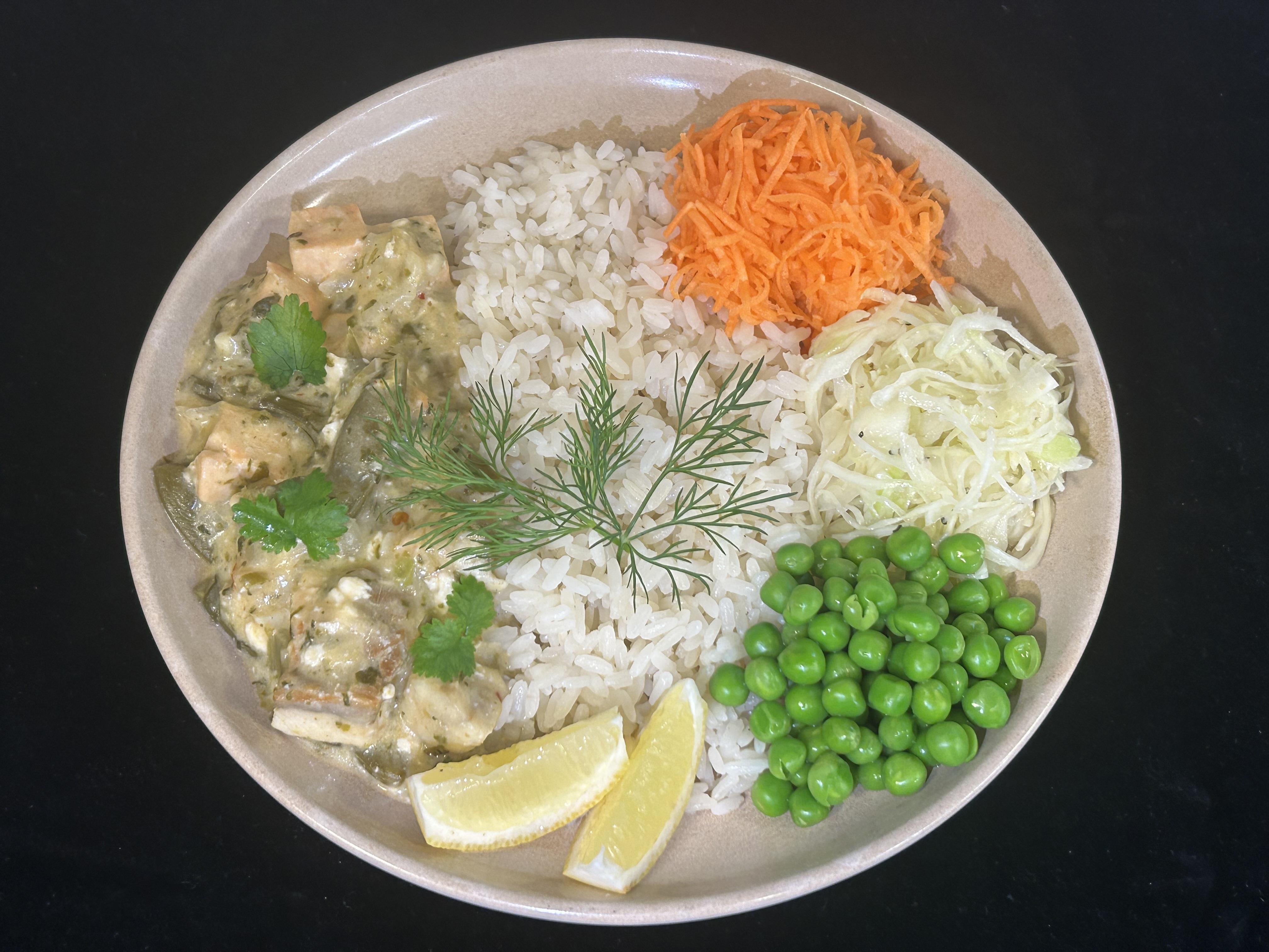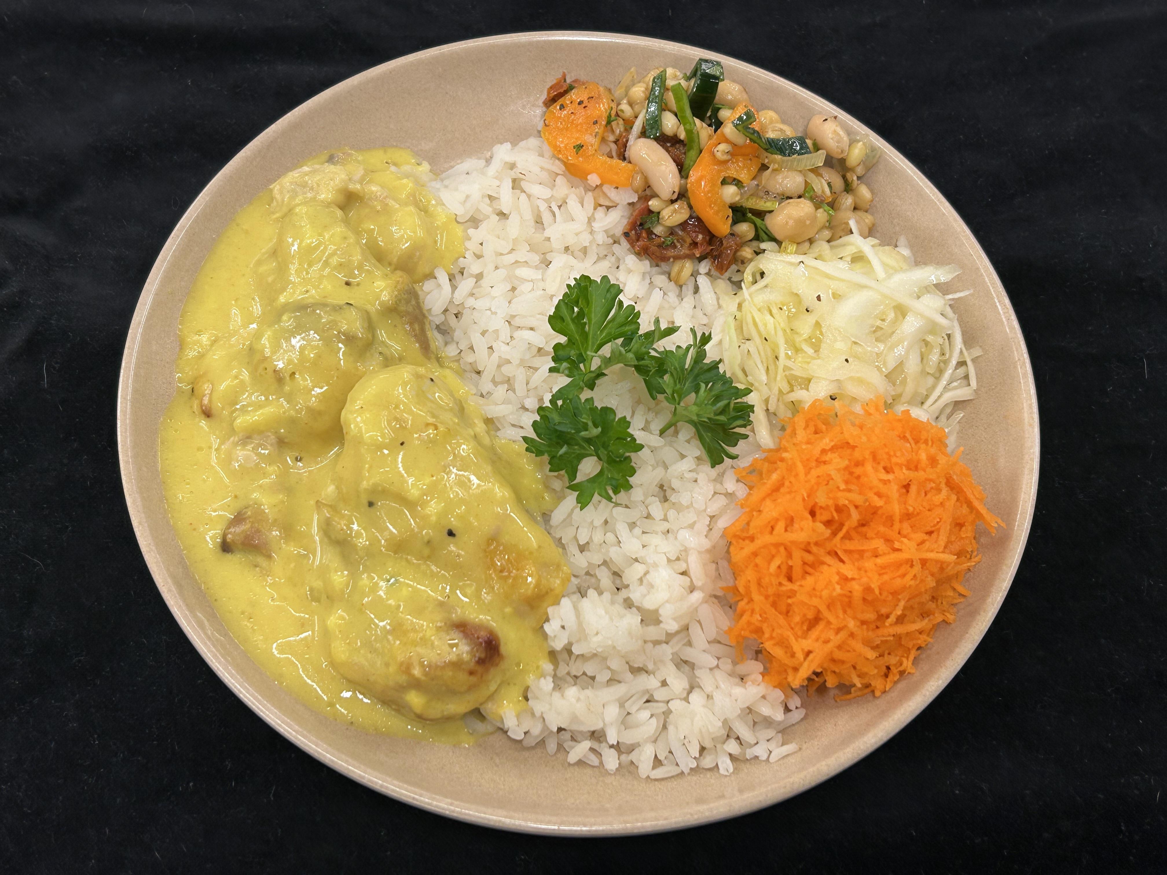 Kycklinggryta med apelsin serveras med ris- och havrerismix