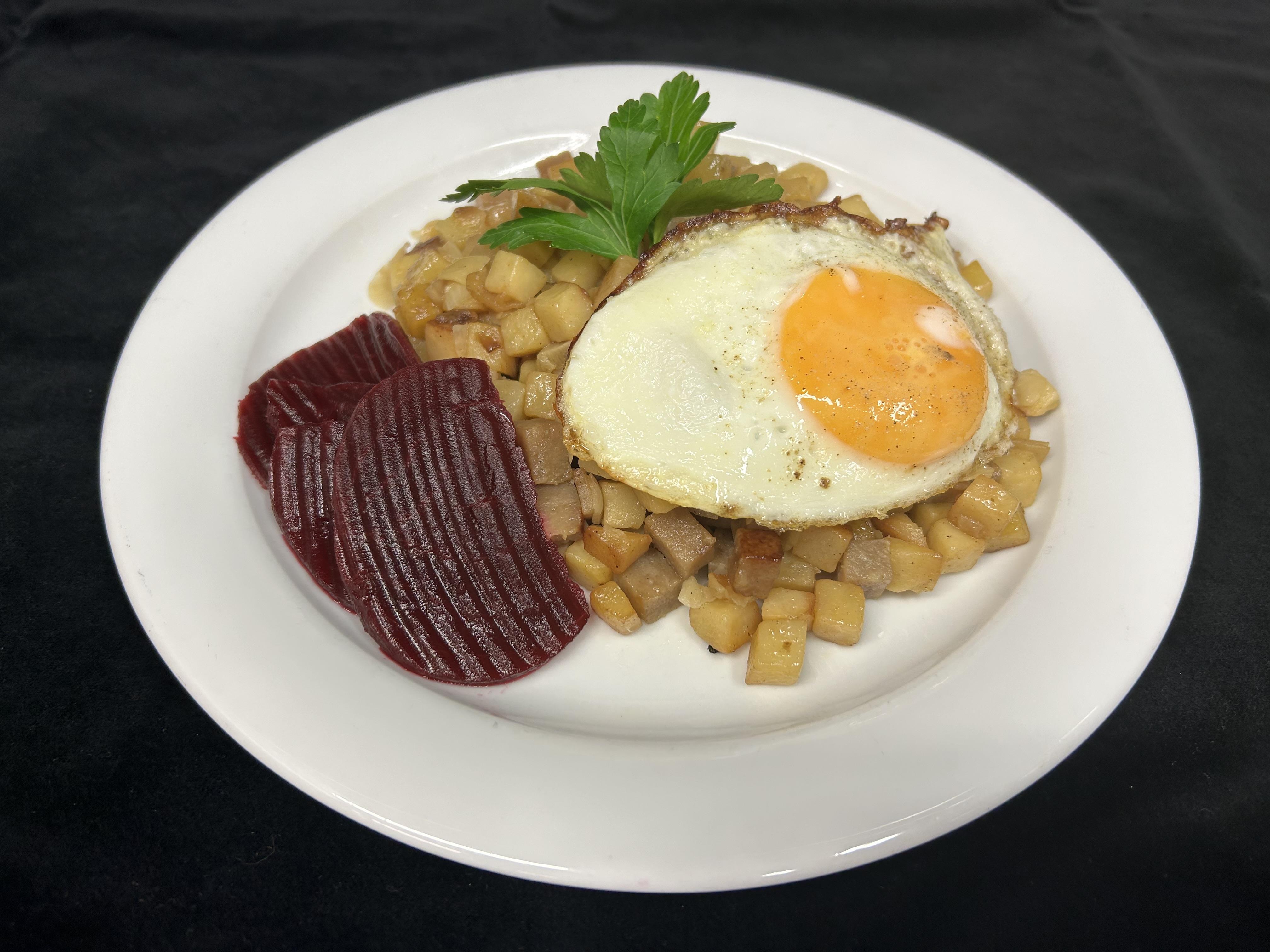 Pytt i panna (växbaserad) serveras med stekt ägg samt inlagda rödbetor
