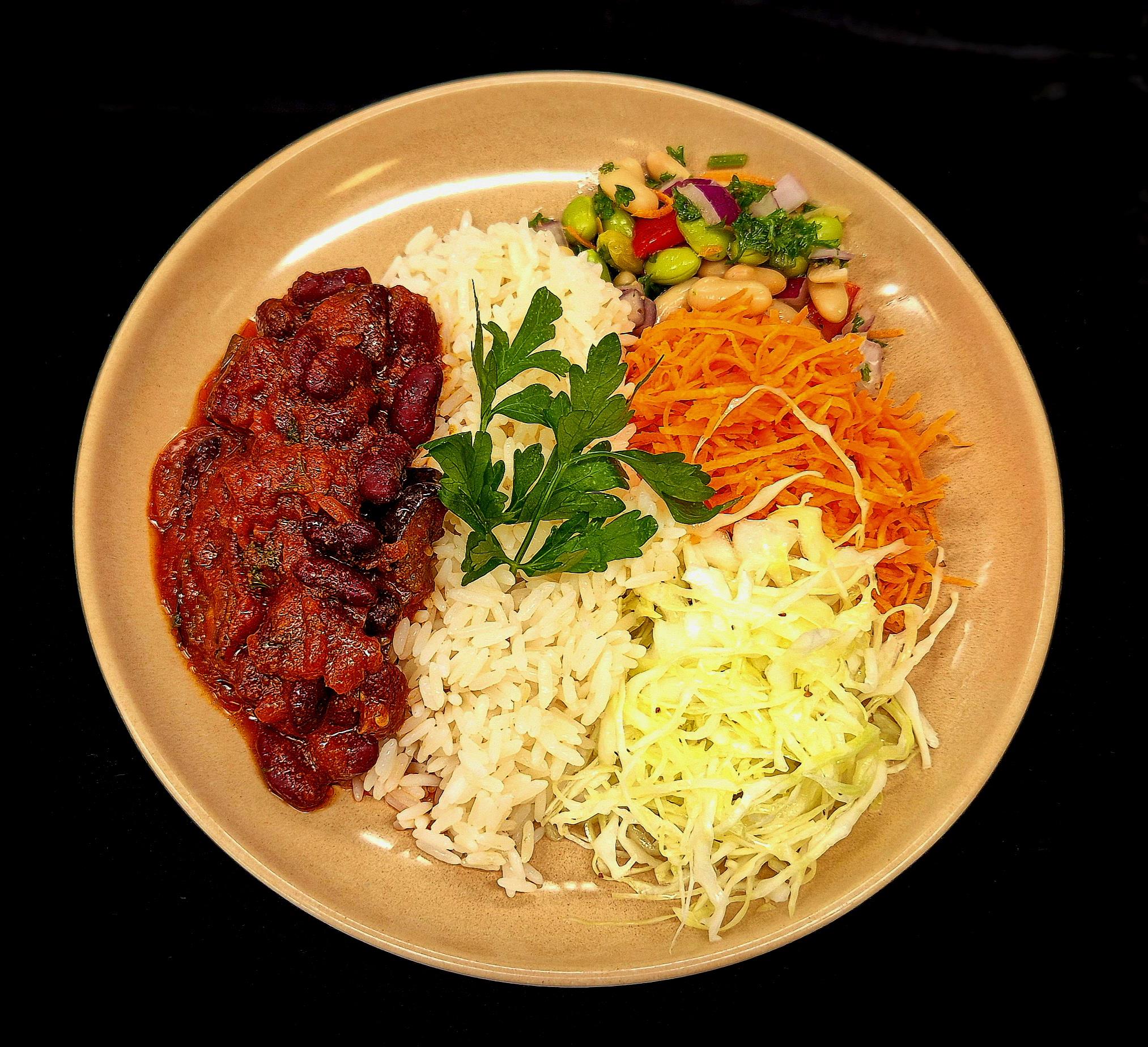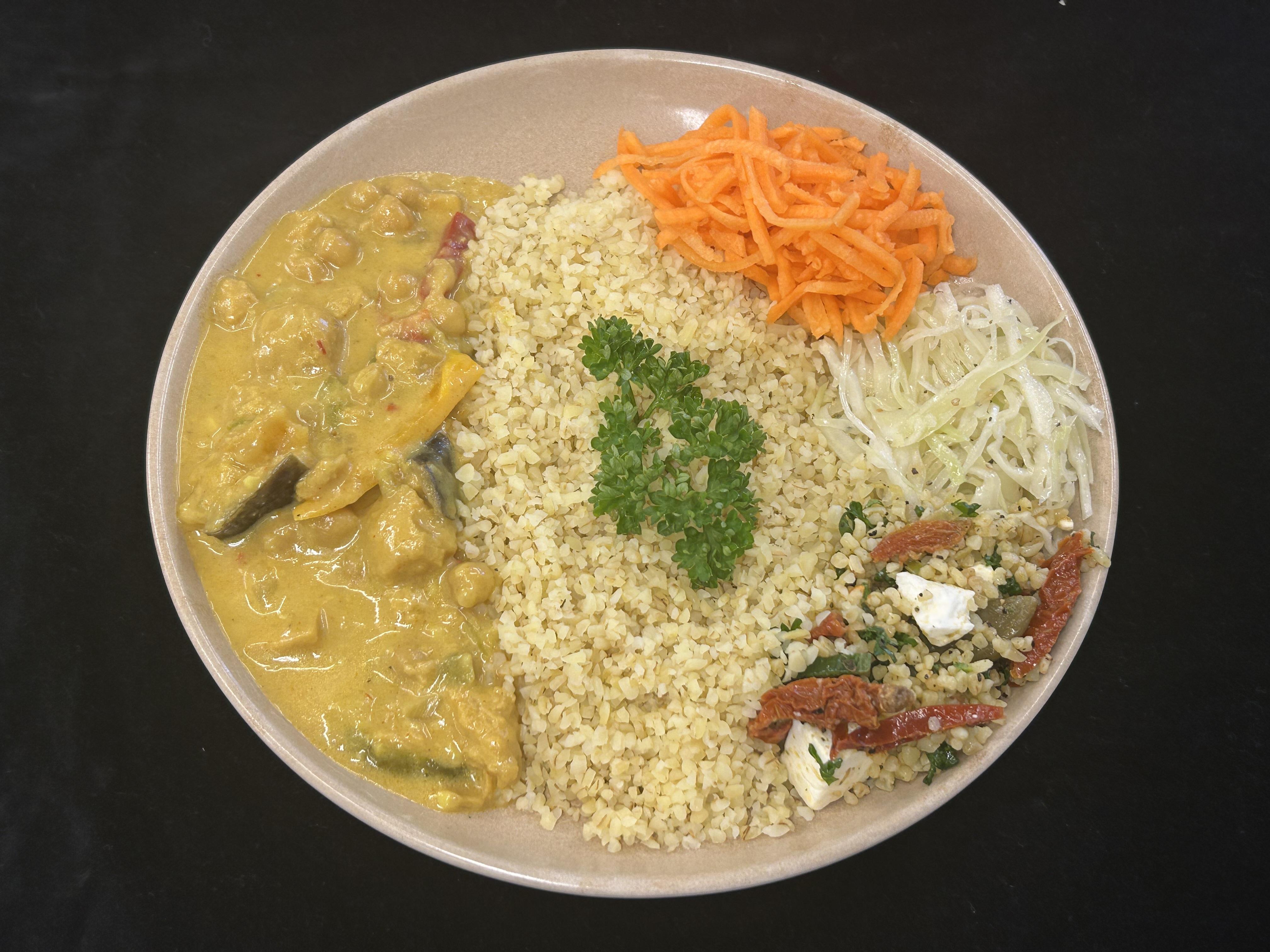 Kebabkryddade ärt- & bönbitar serveras med vitlökssås samt bulgur