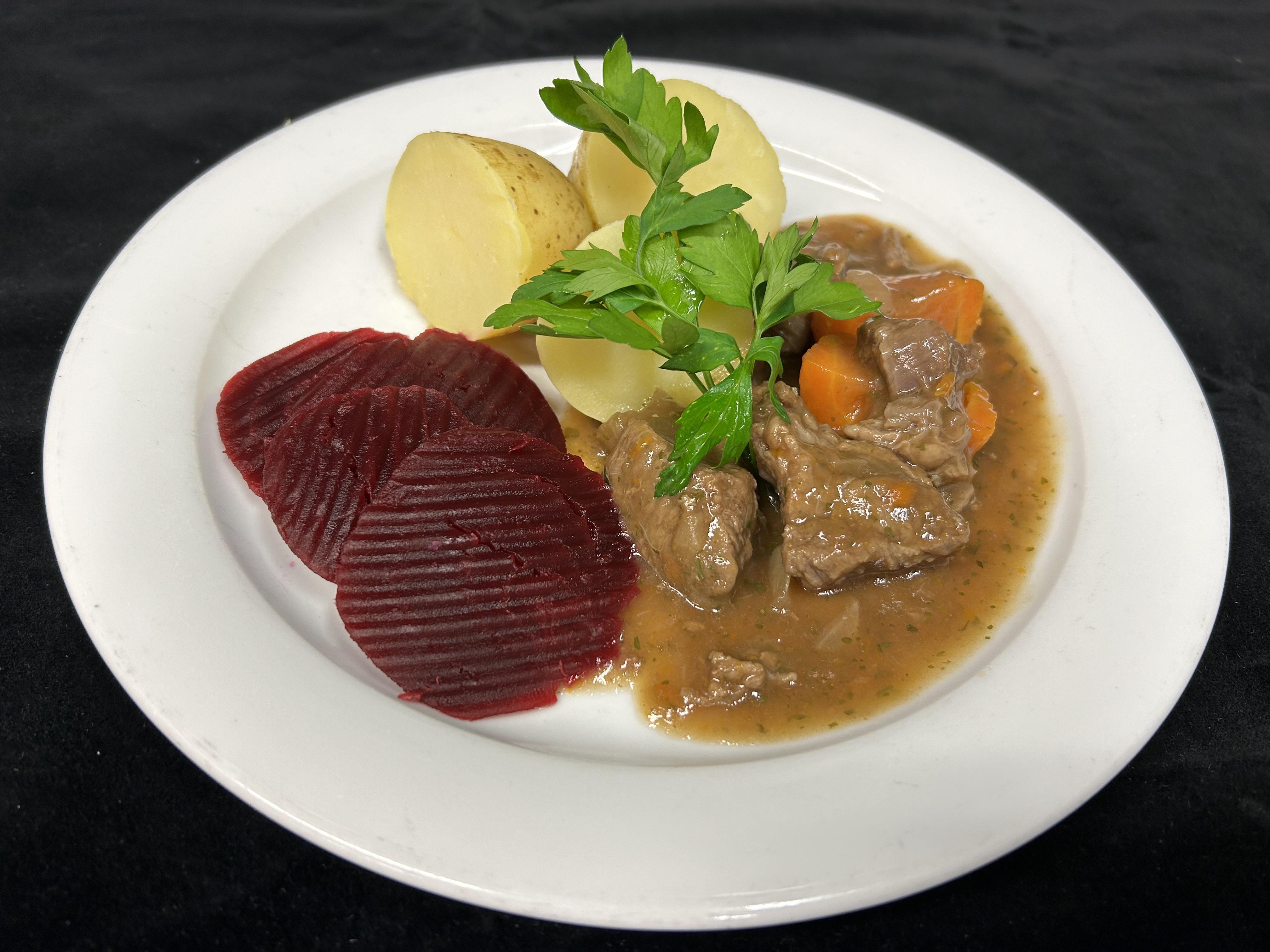 Skånsk kalops serveras med kokt potatis samt inlagda rödbetor