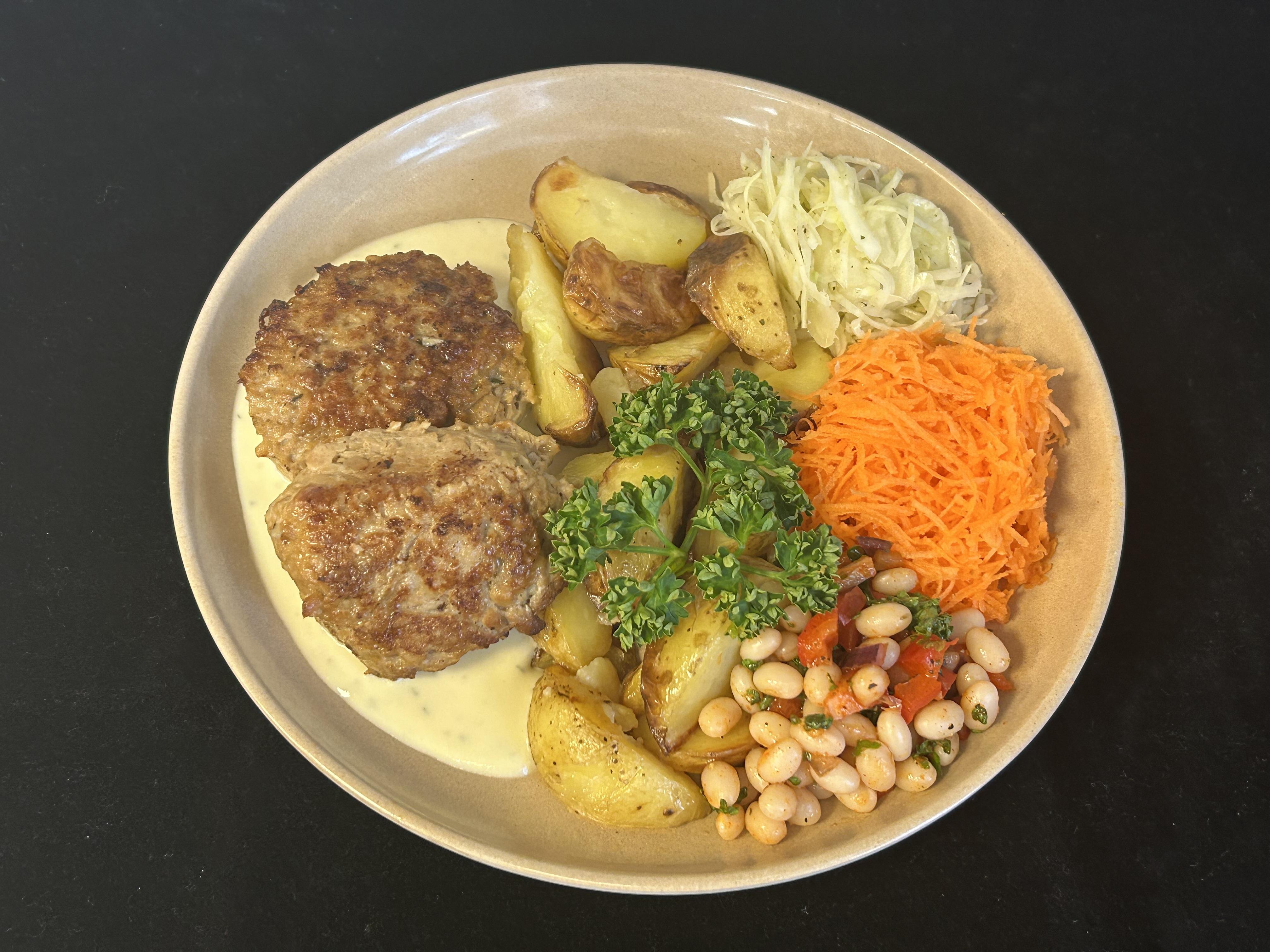Kycklingbiff (klimatsmart) serveras med dragonsås samt klyftpotatis
