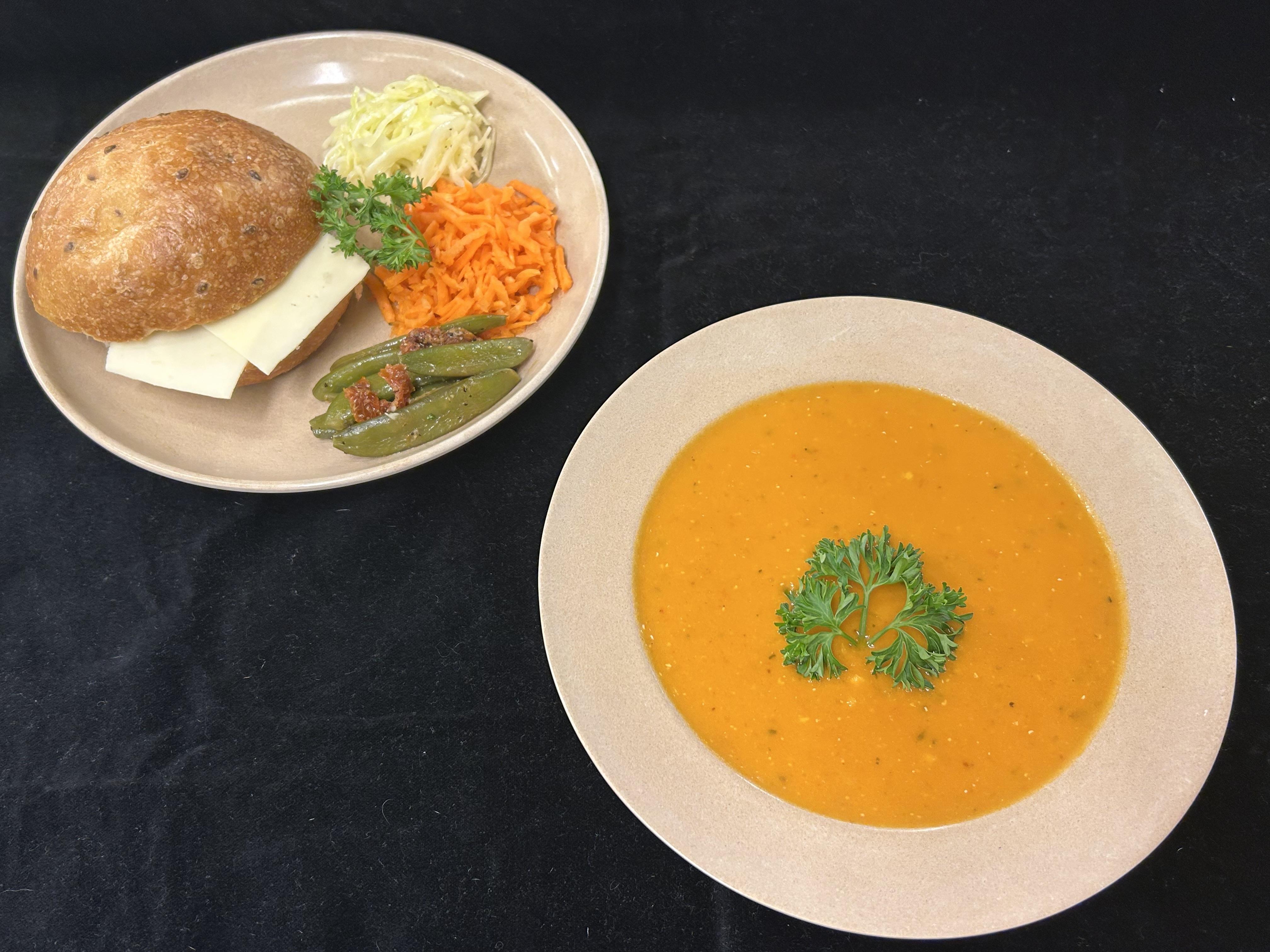 Tomatsoppa serveras med mjukt bröd samt pålägg
