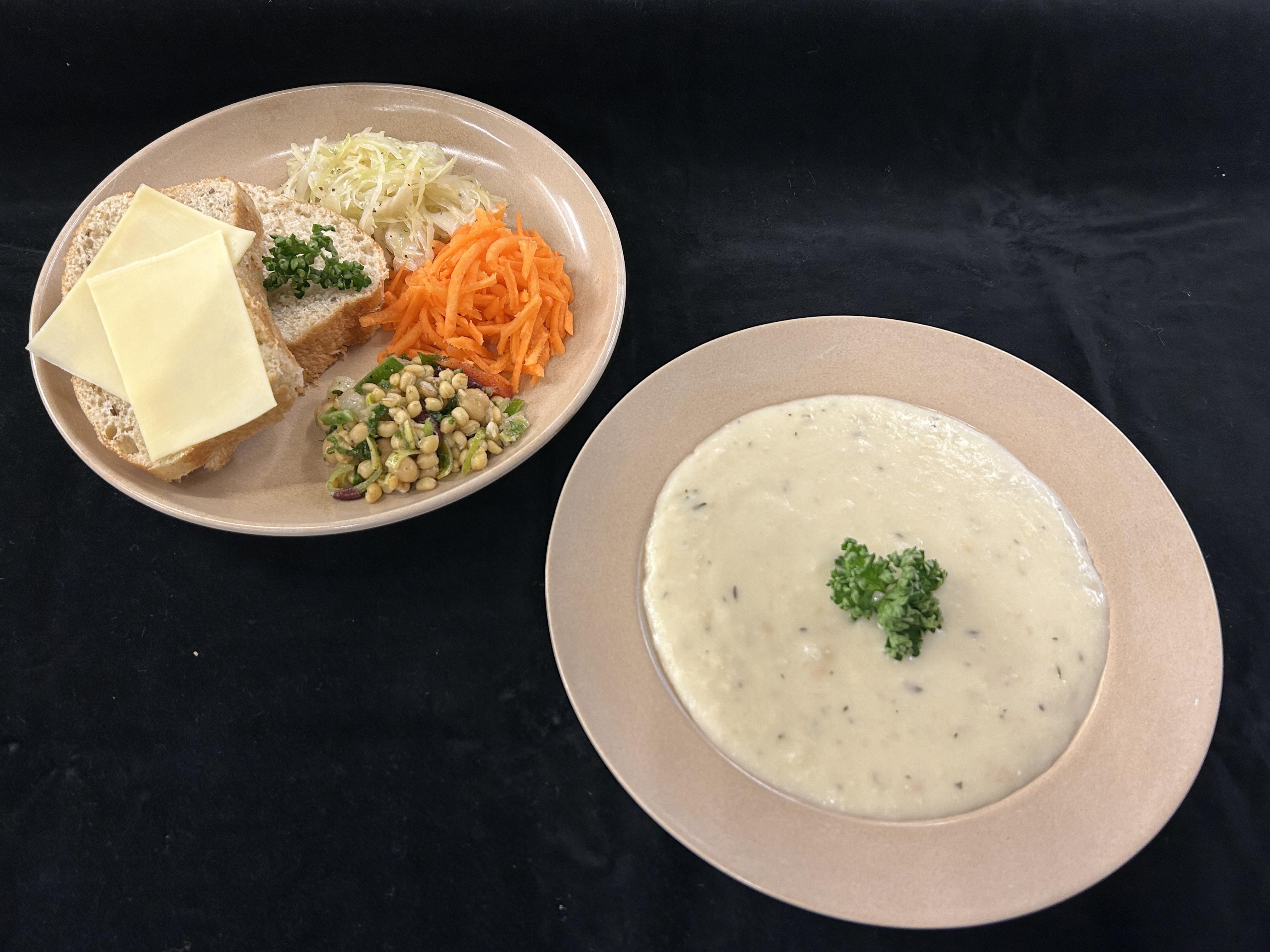 Potatis- och purjolökssoppa serveras med mjukt bröd samt pålägg