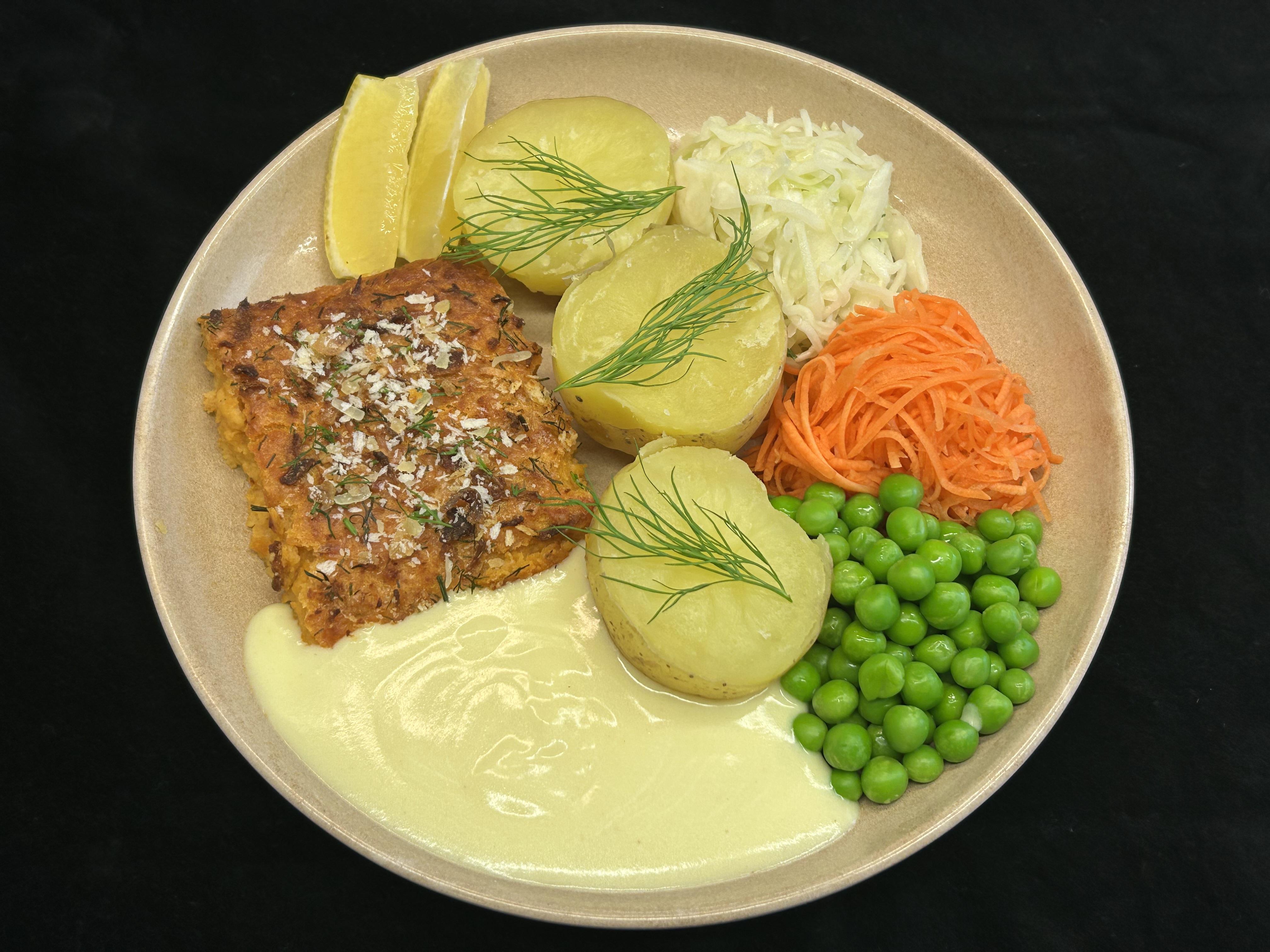 Krispig fisk med dillcrust serveras med varm citronsås samt kokt potatis