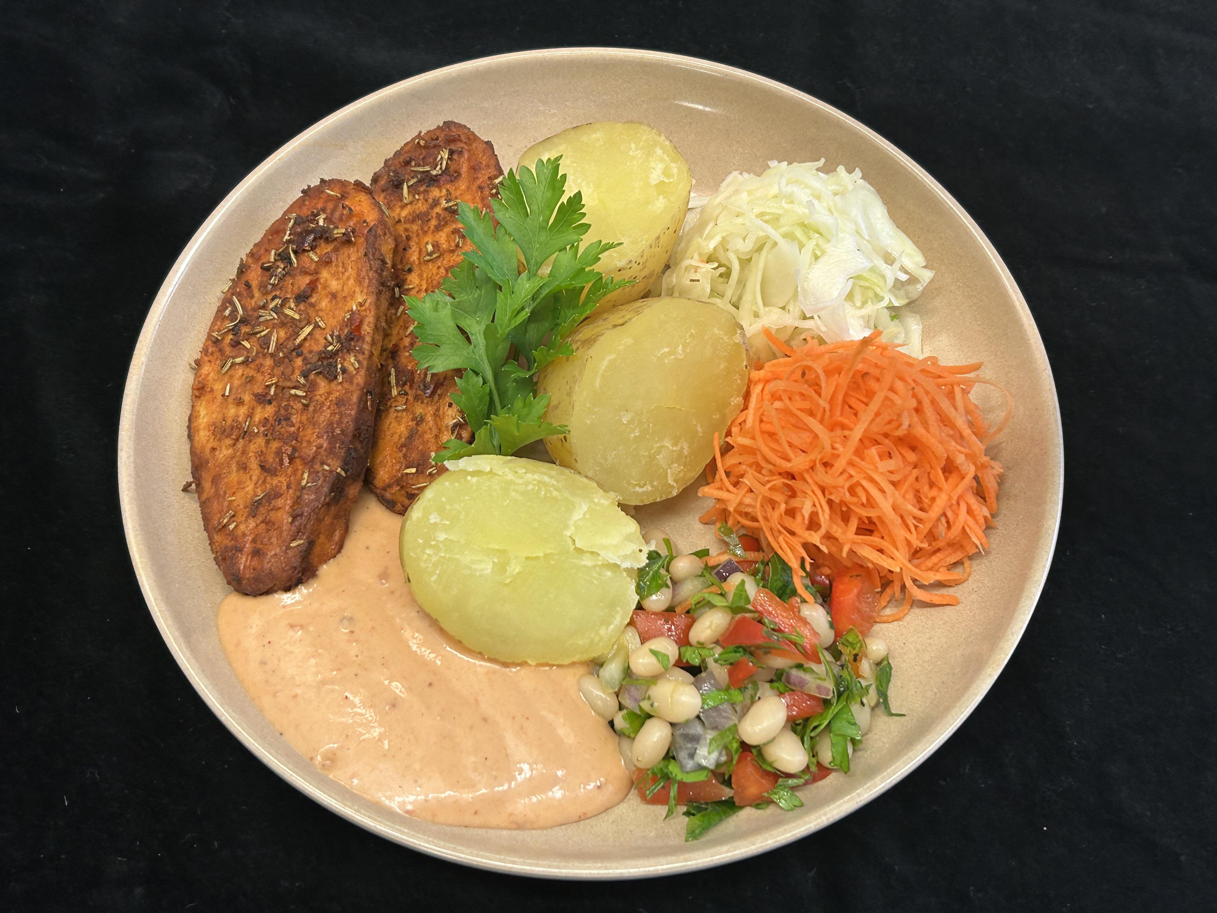 Vegoburgare serveras med dressing, bröd samt rostad potatis