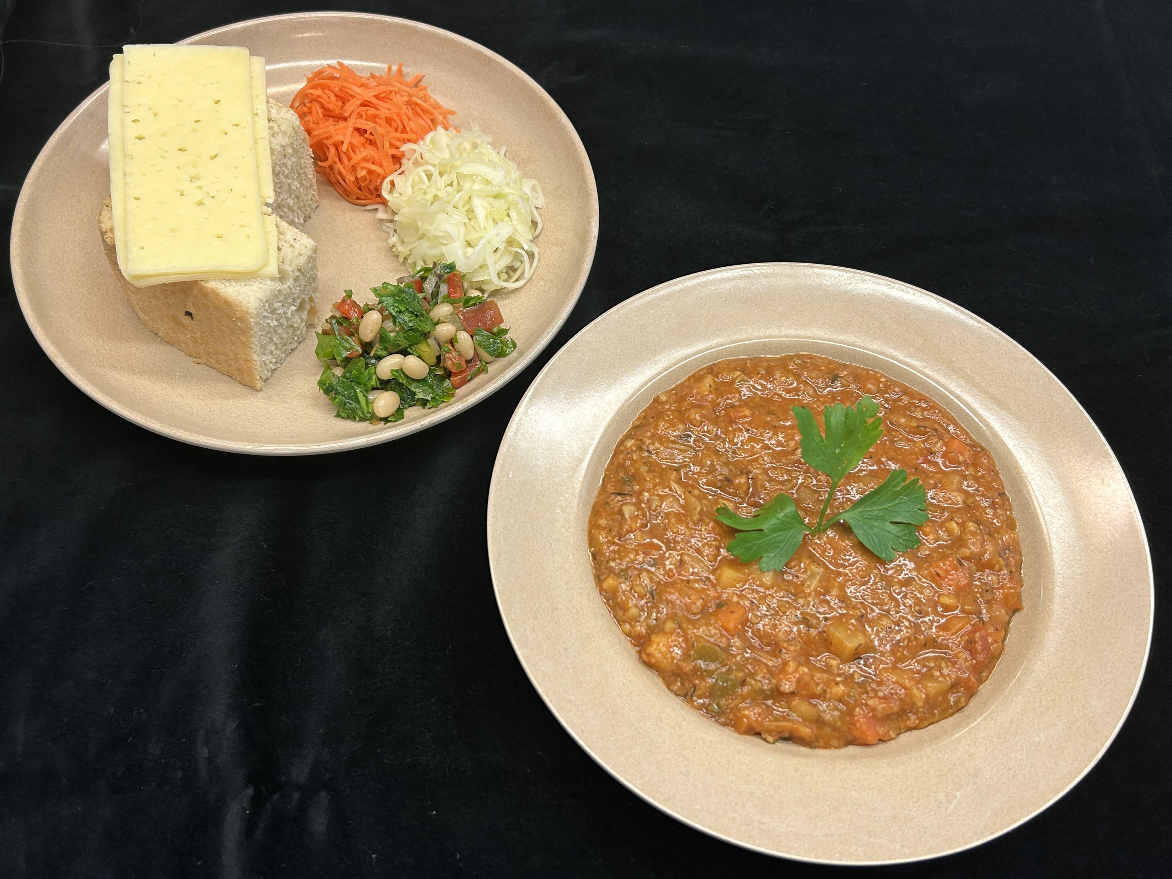 Minestronesoppa (växtbaserad) serveras med mjukt bröd samt pålägg
