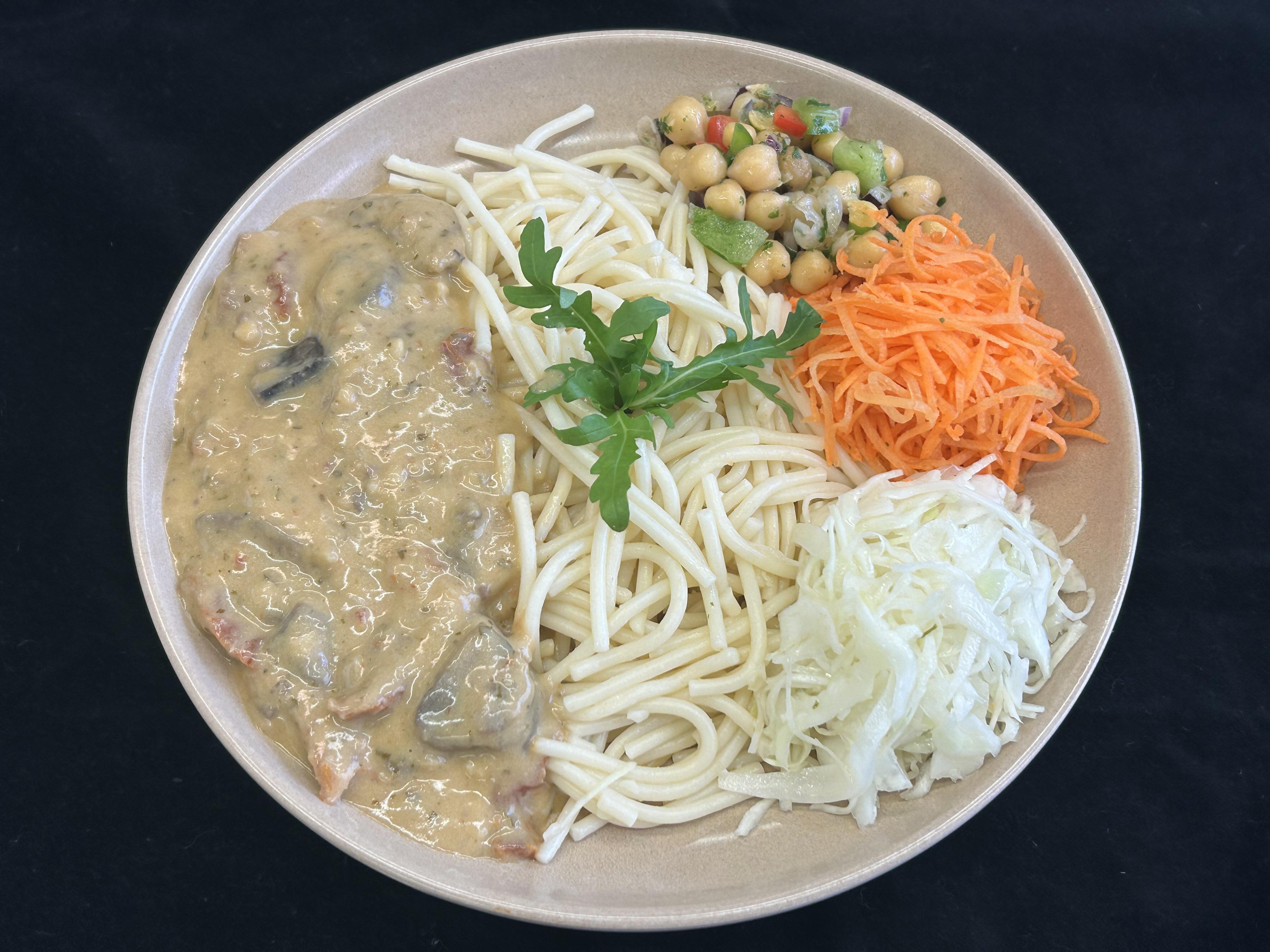 Pastasås med soltorkade tomater och svamp serveras med spaghetti