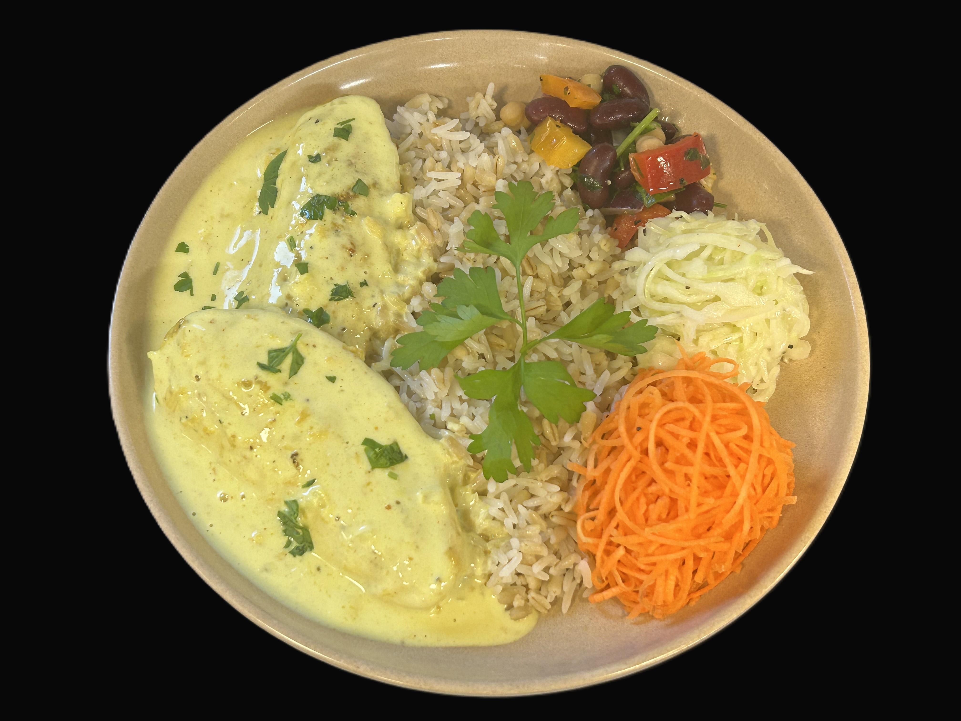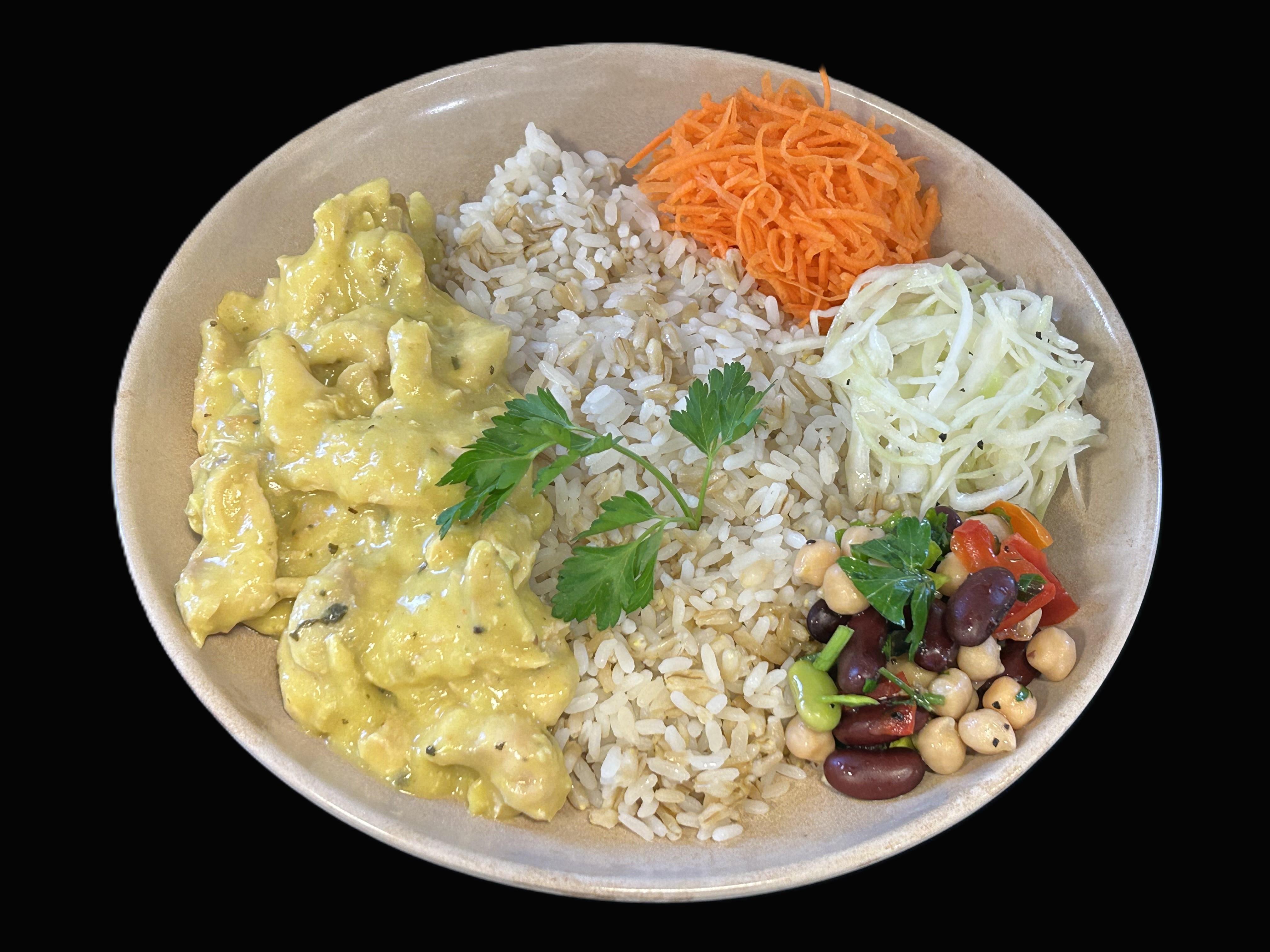 Quornfilé i currysås serveras med ris- och havrerismix