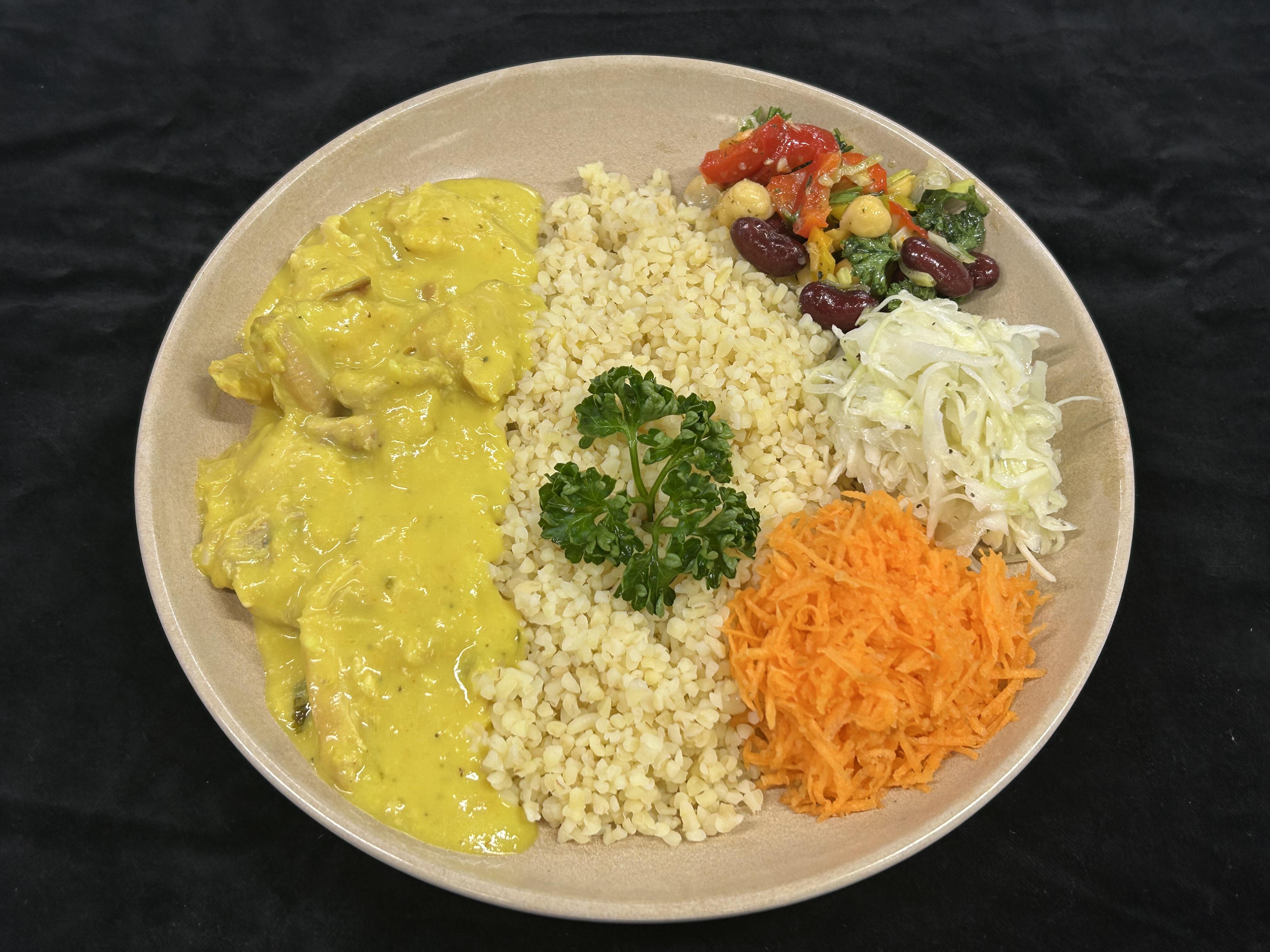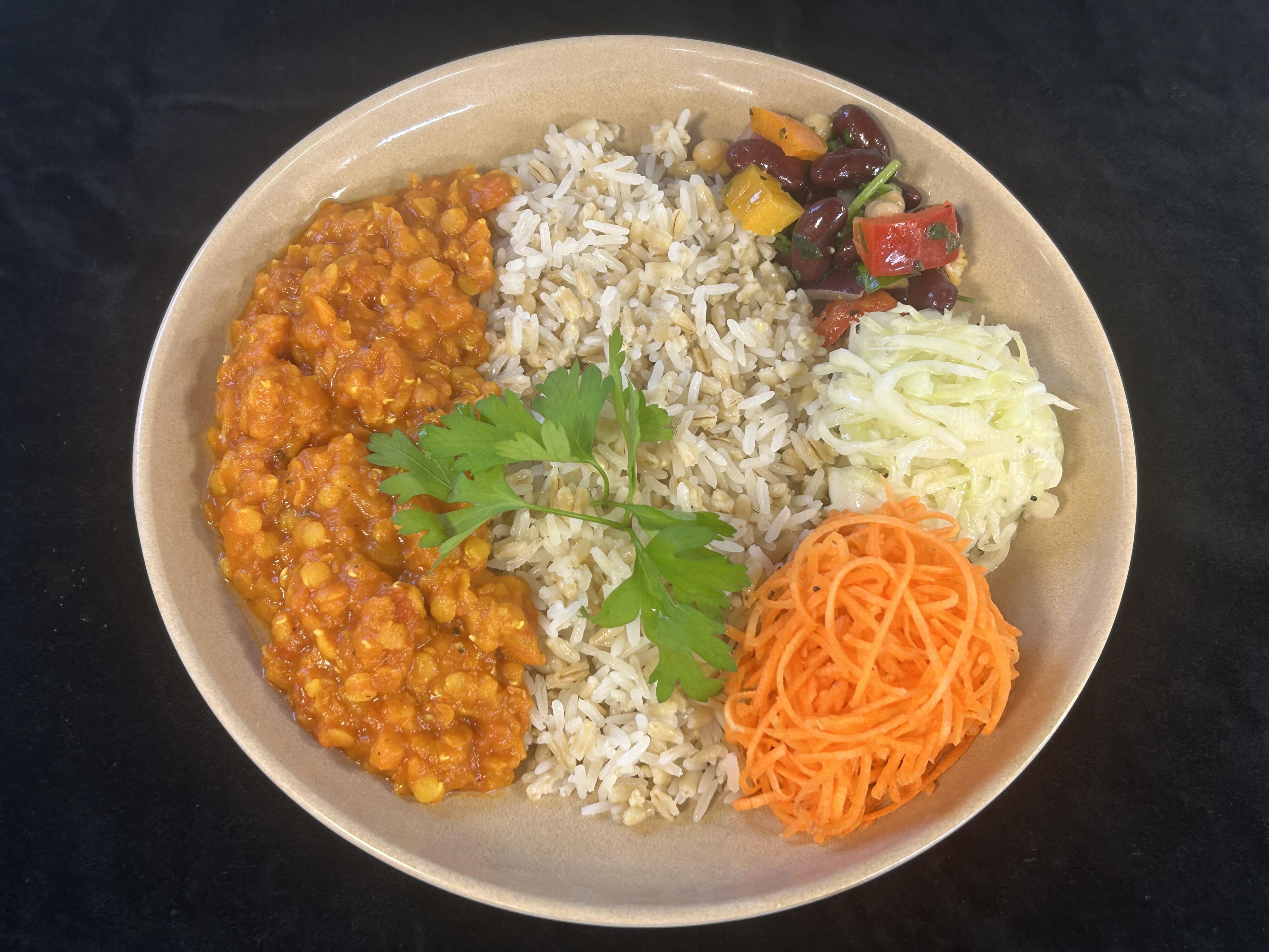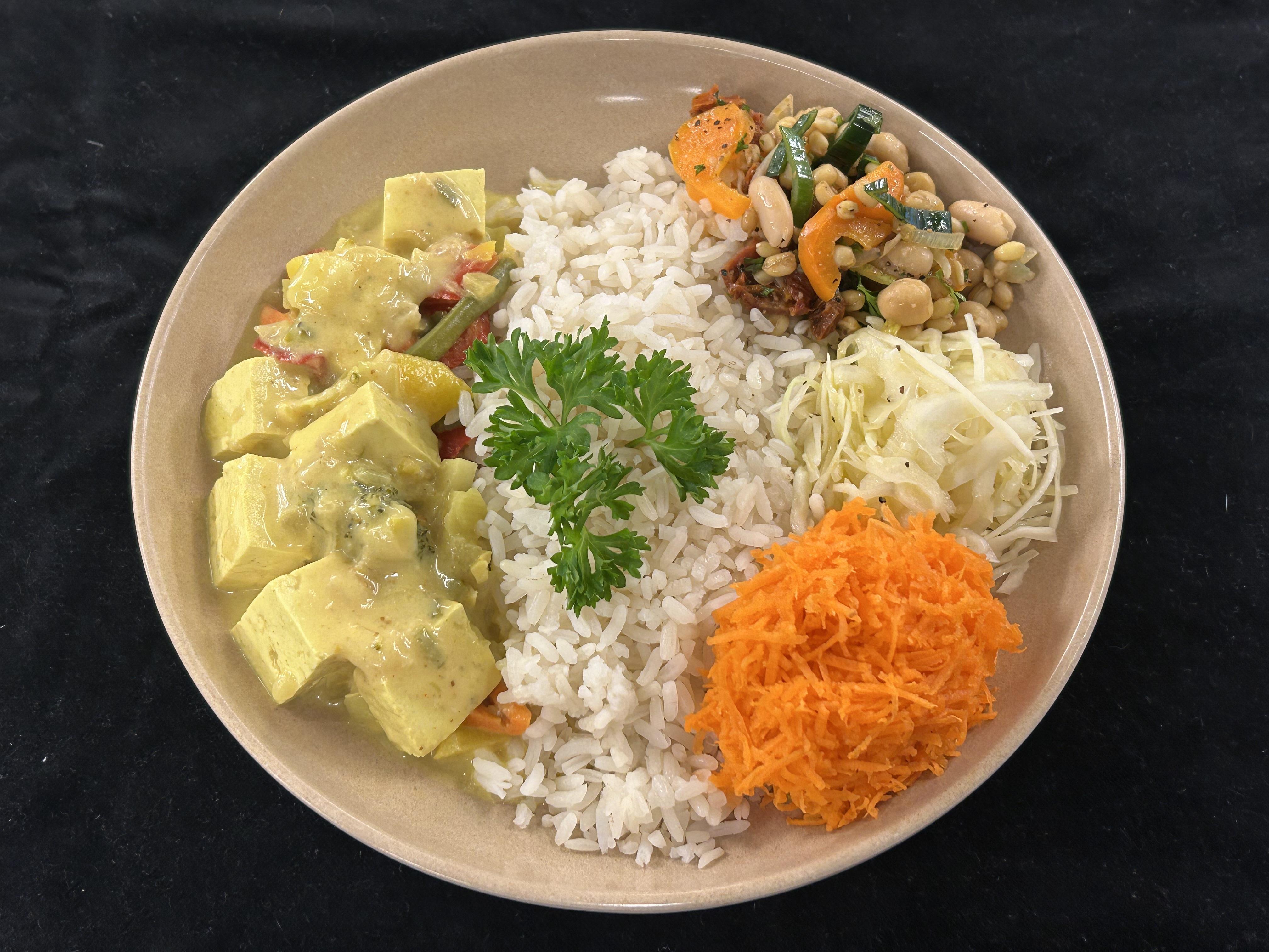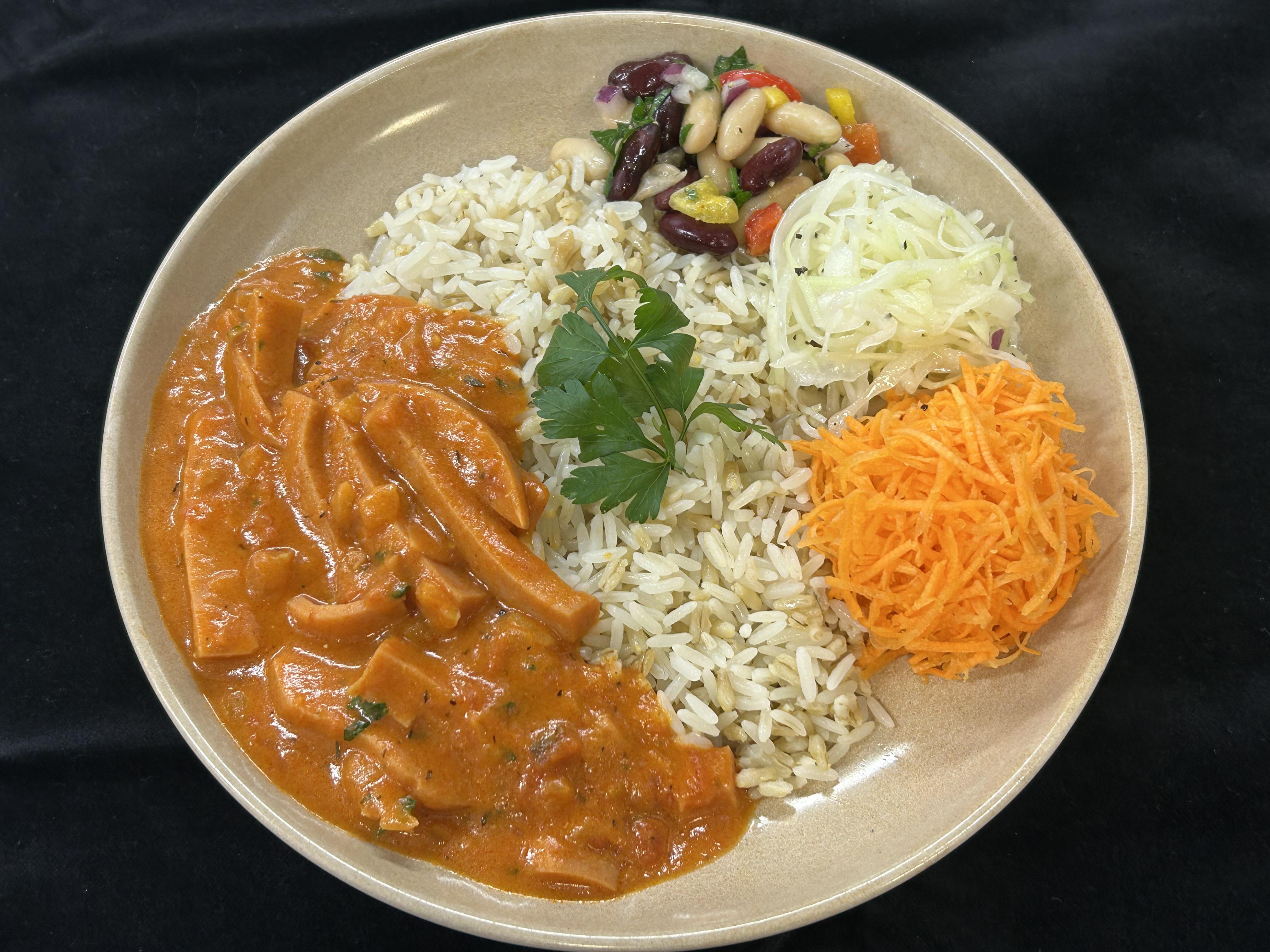 Stroganoff med vegokorv serveras med ris- och havrerismix