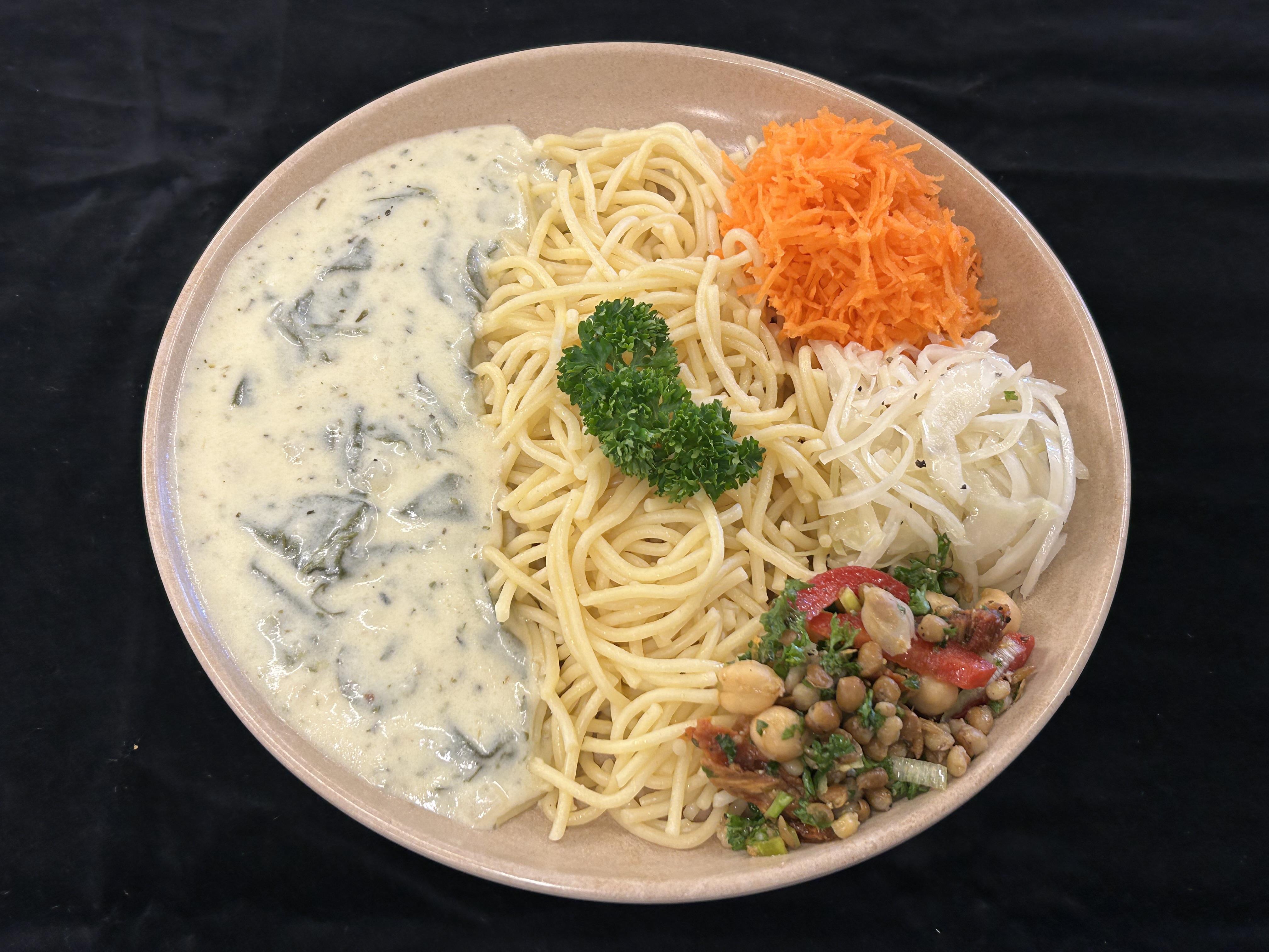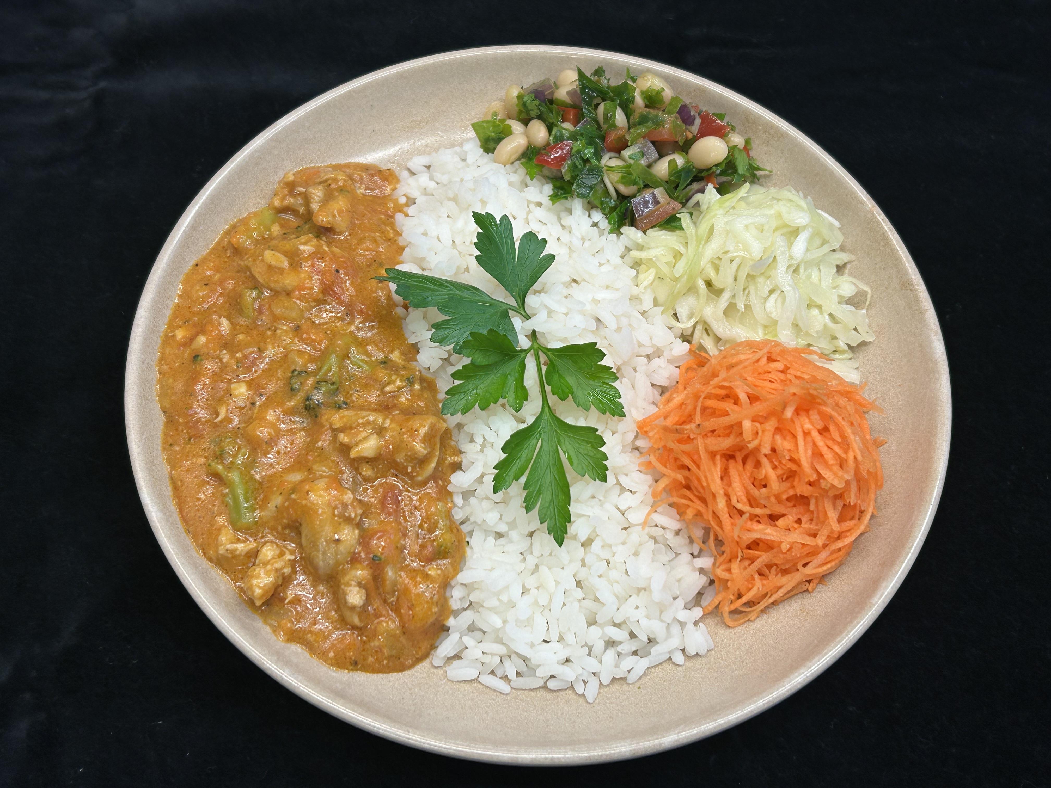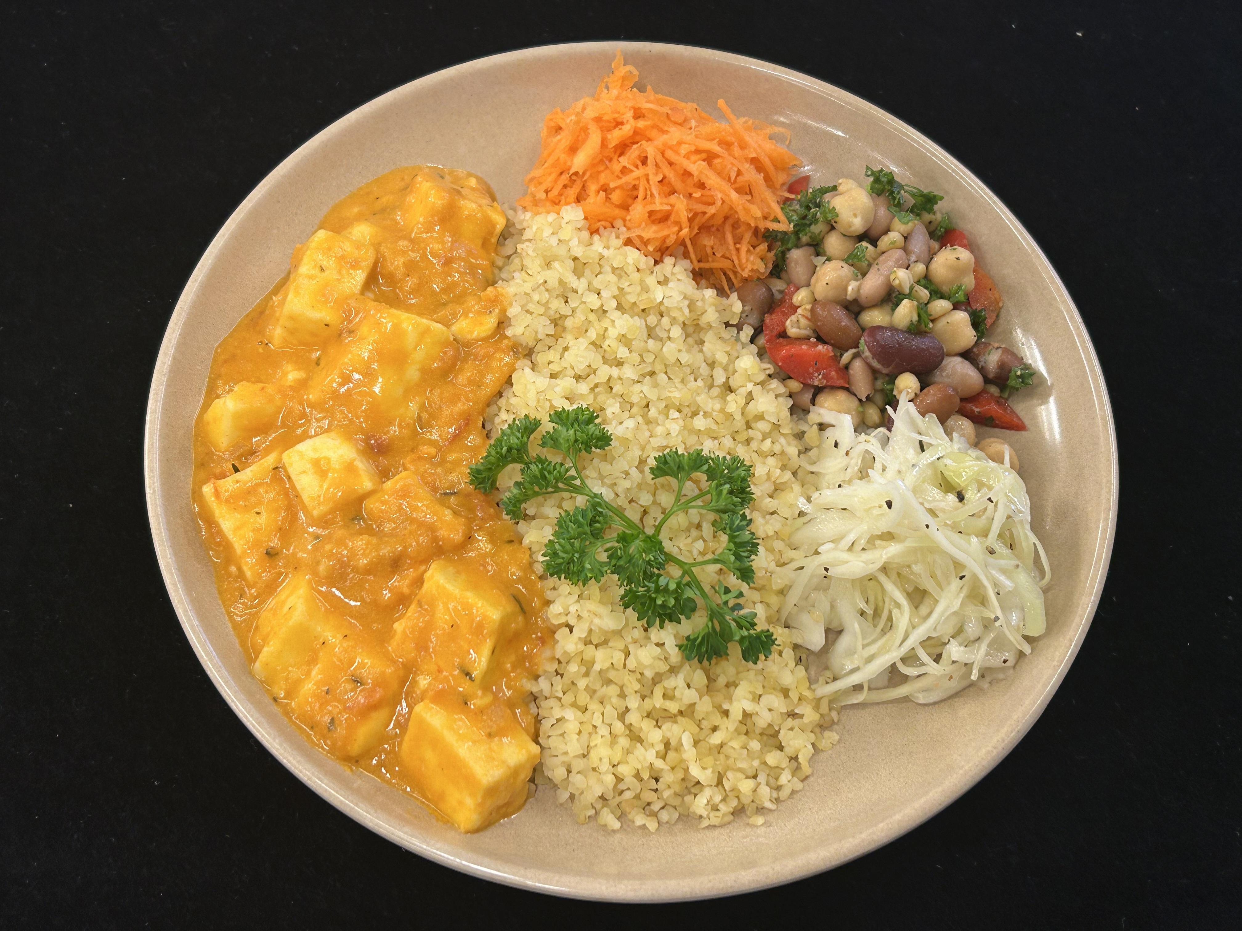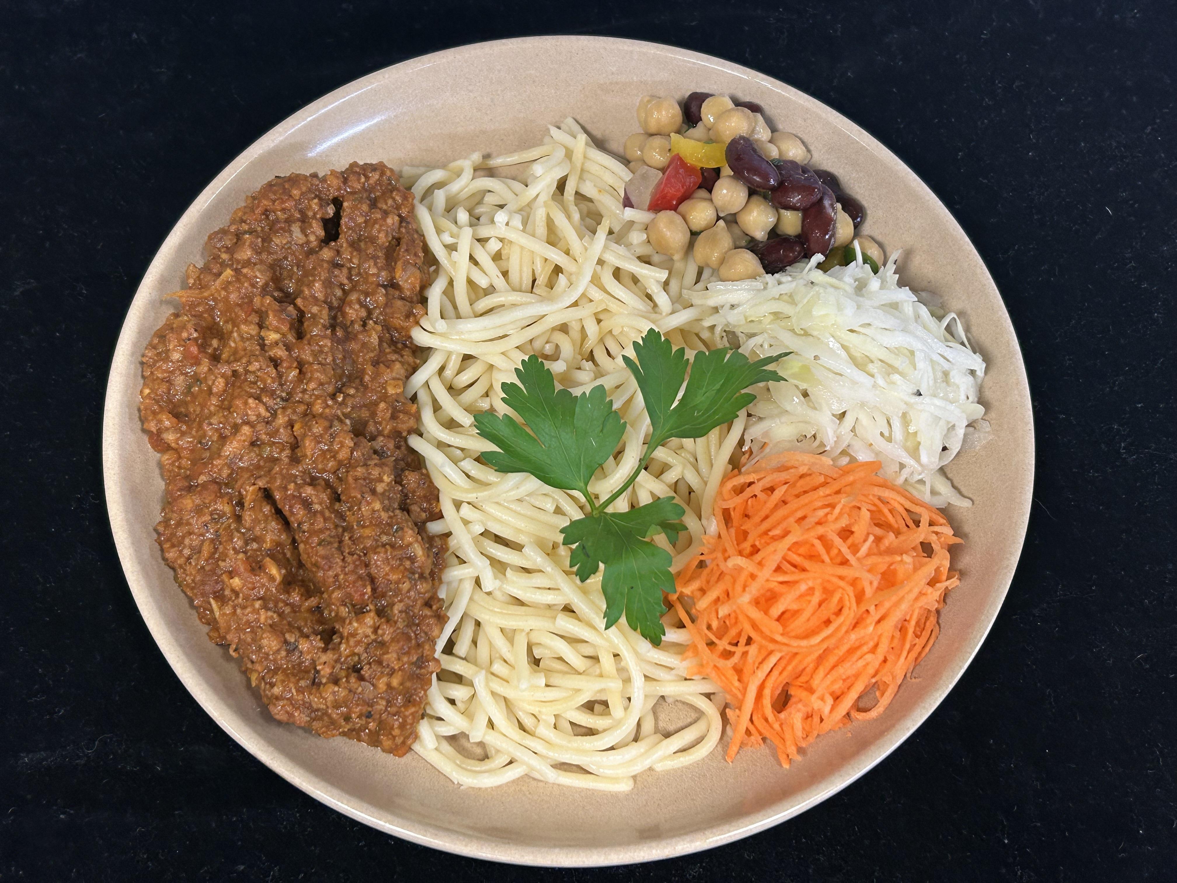 Stroganoff med vegokorv serveras med ris- och havrerismix