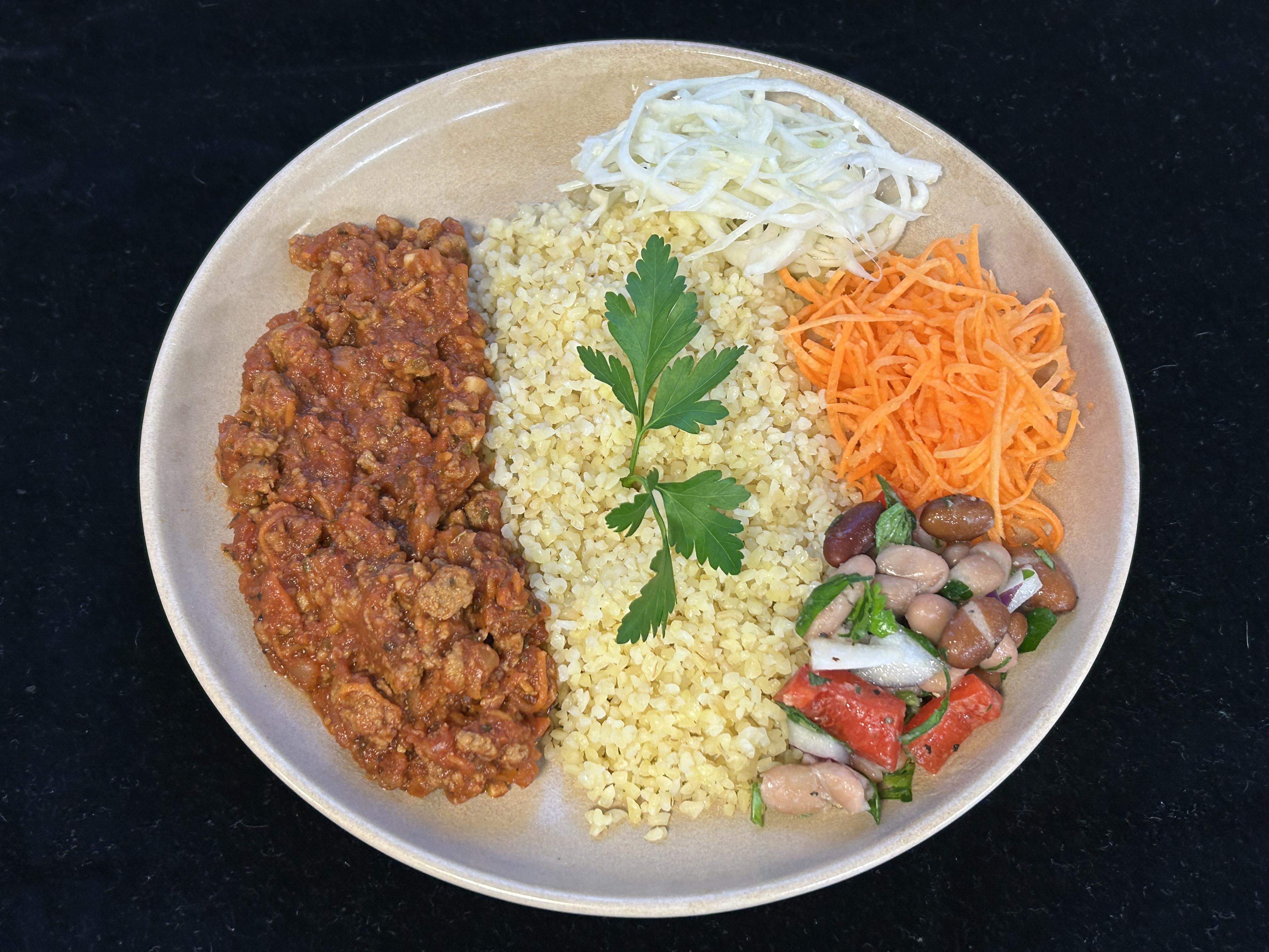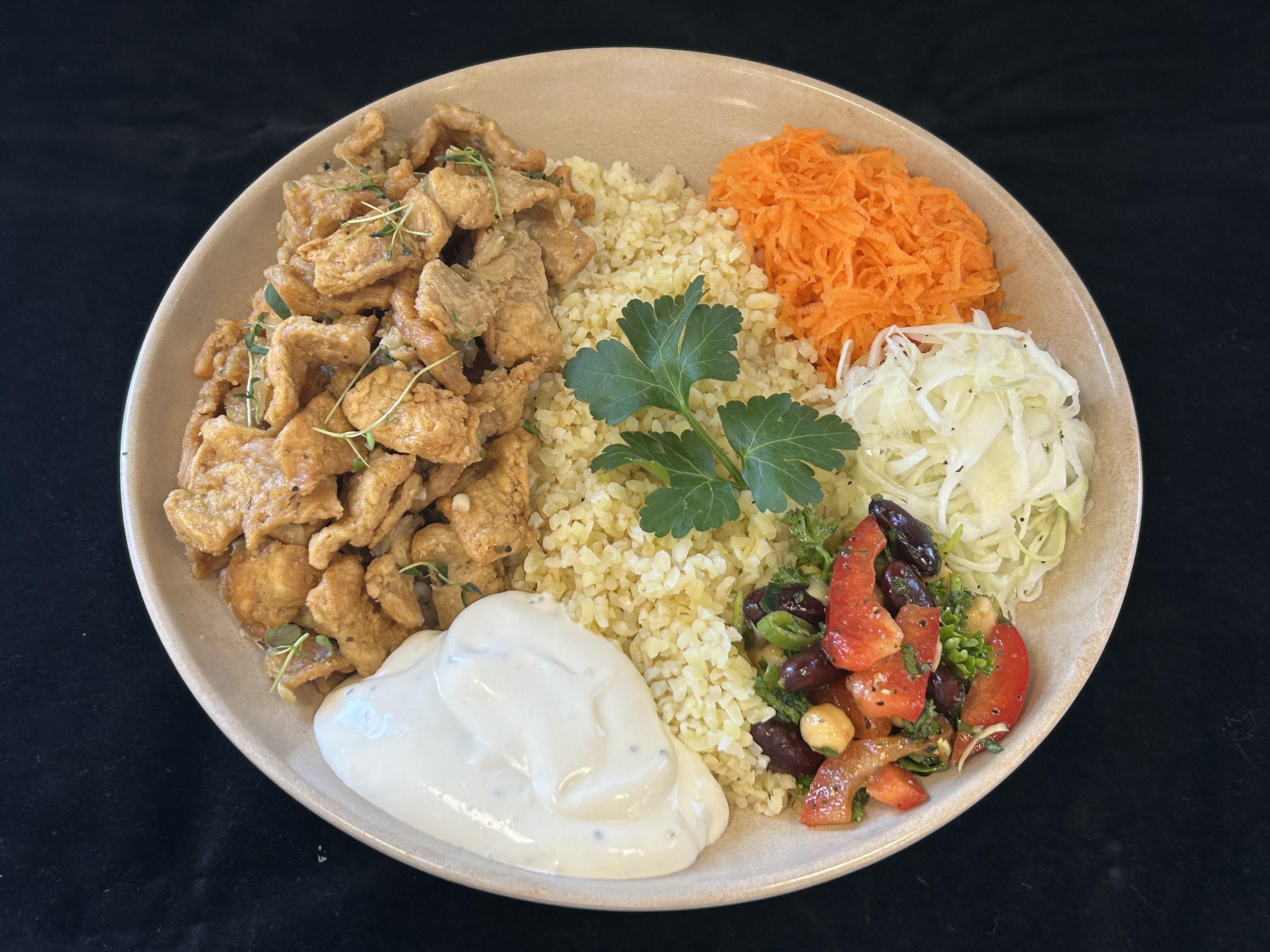 Kebabkryddade ärt- & bönbitar serveras med tomatsås, vitlökssås samt bulgur