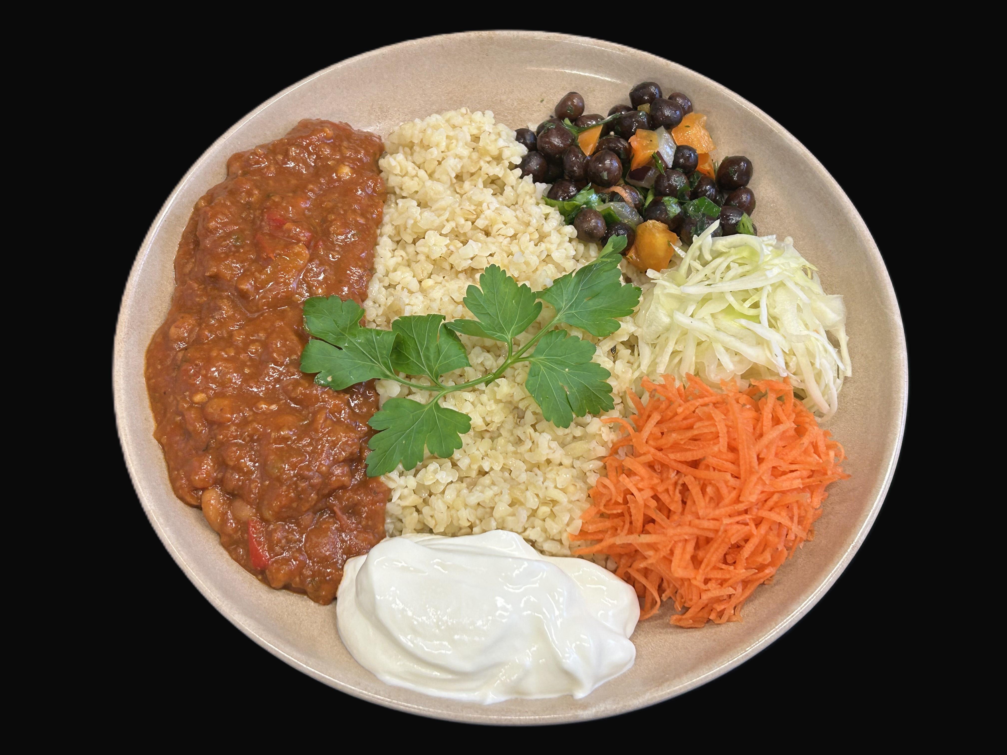 Chili sin carne serveras med gräddfil samt bulgur