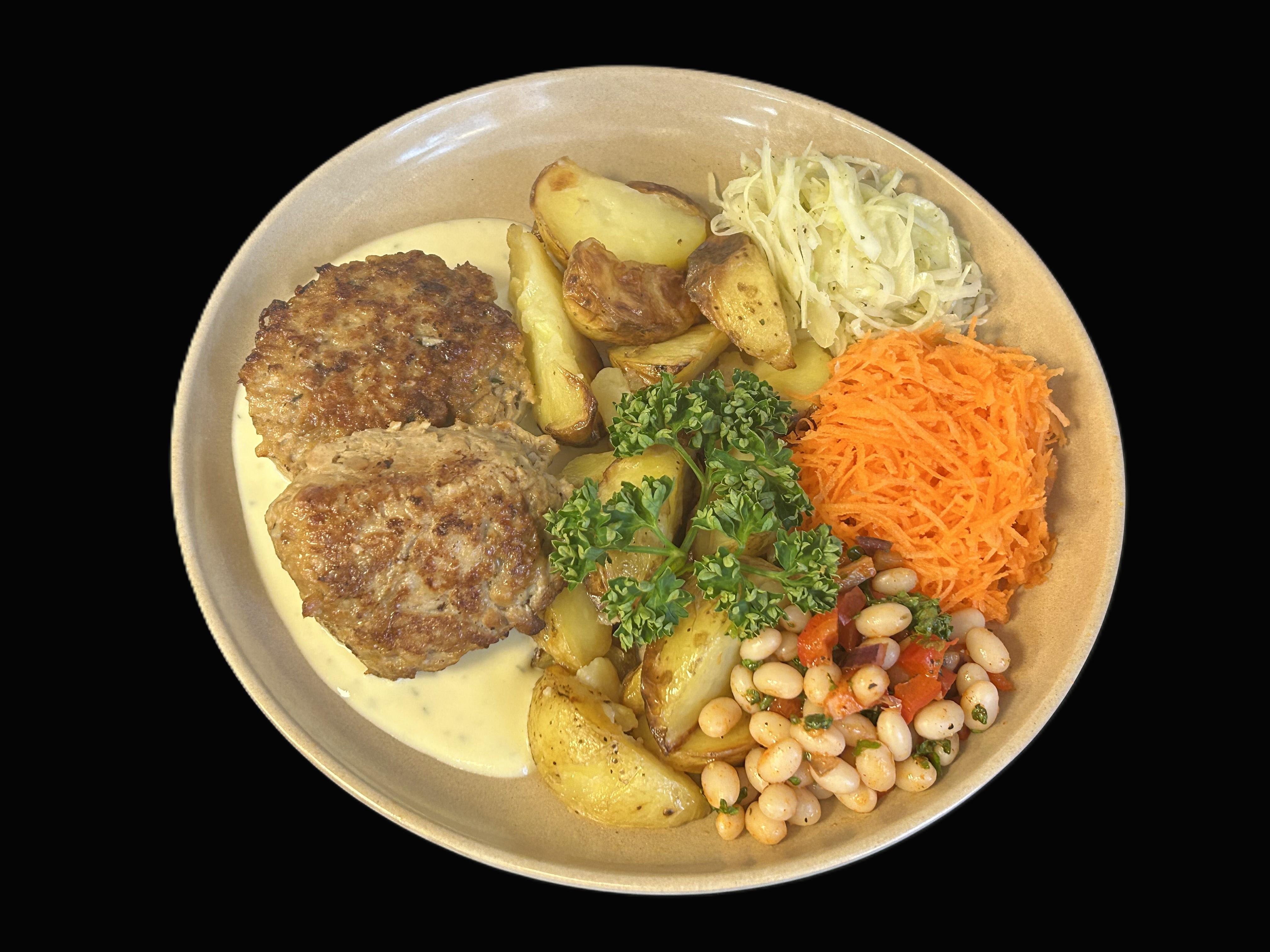 Kycklingbiff (klimatsmart) serveras med dragonsås samt klyftpotatis