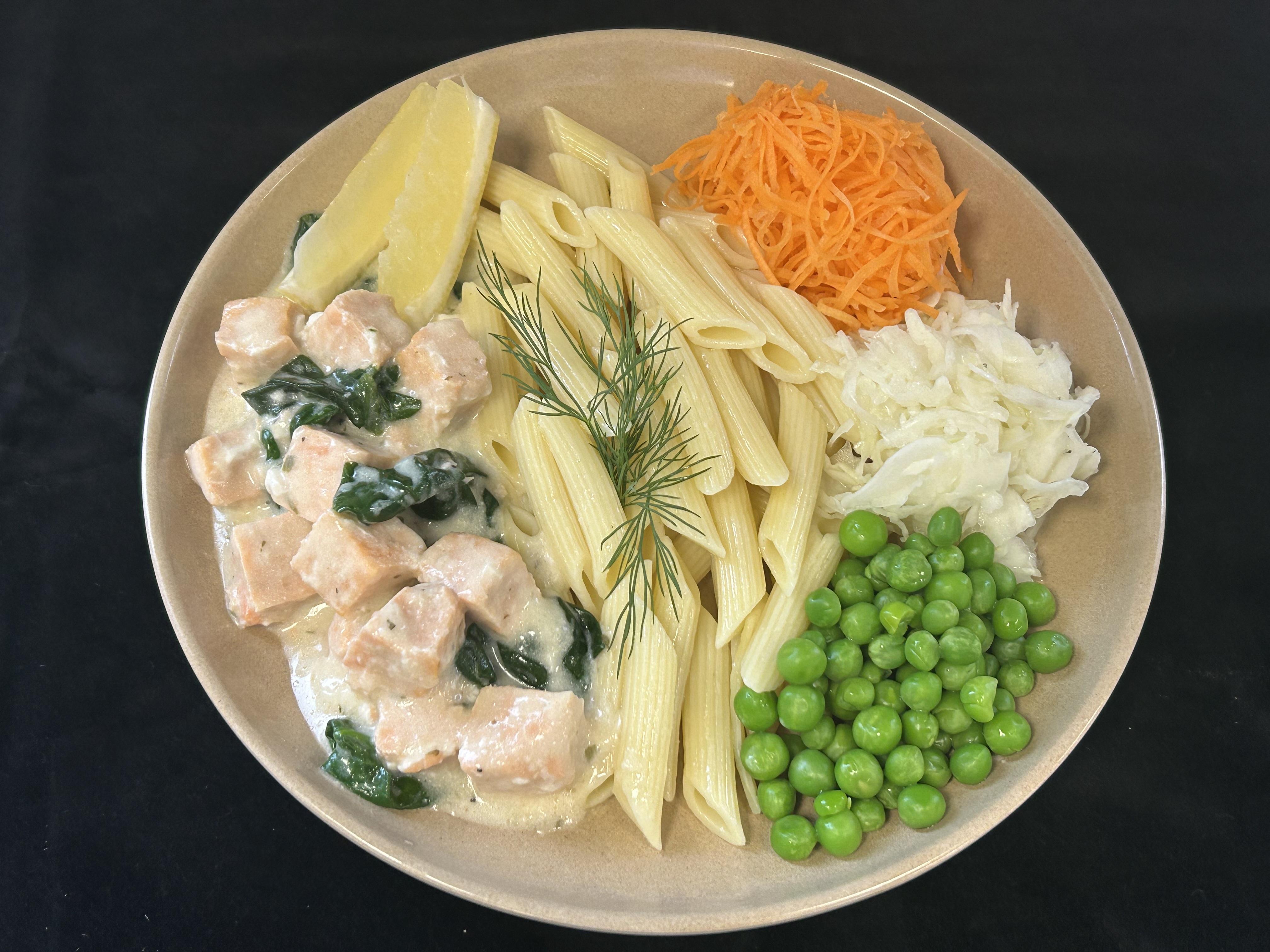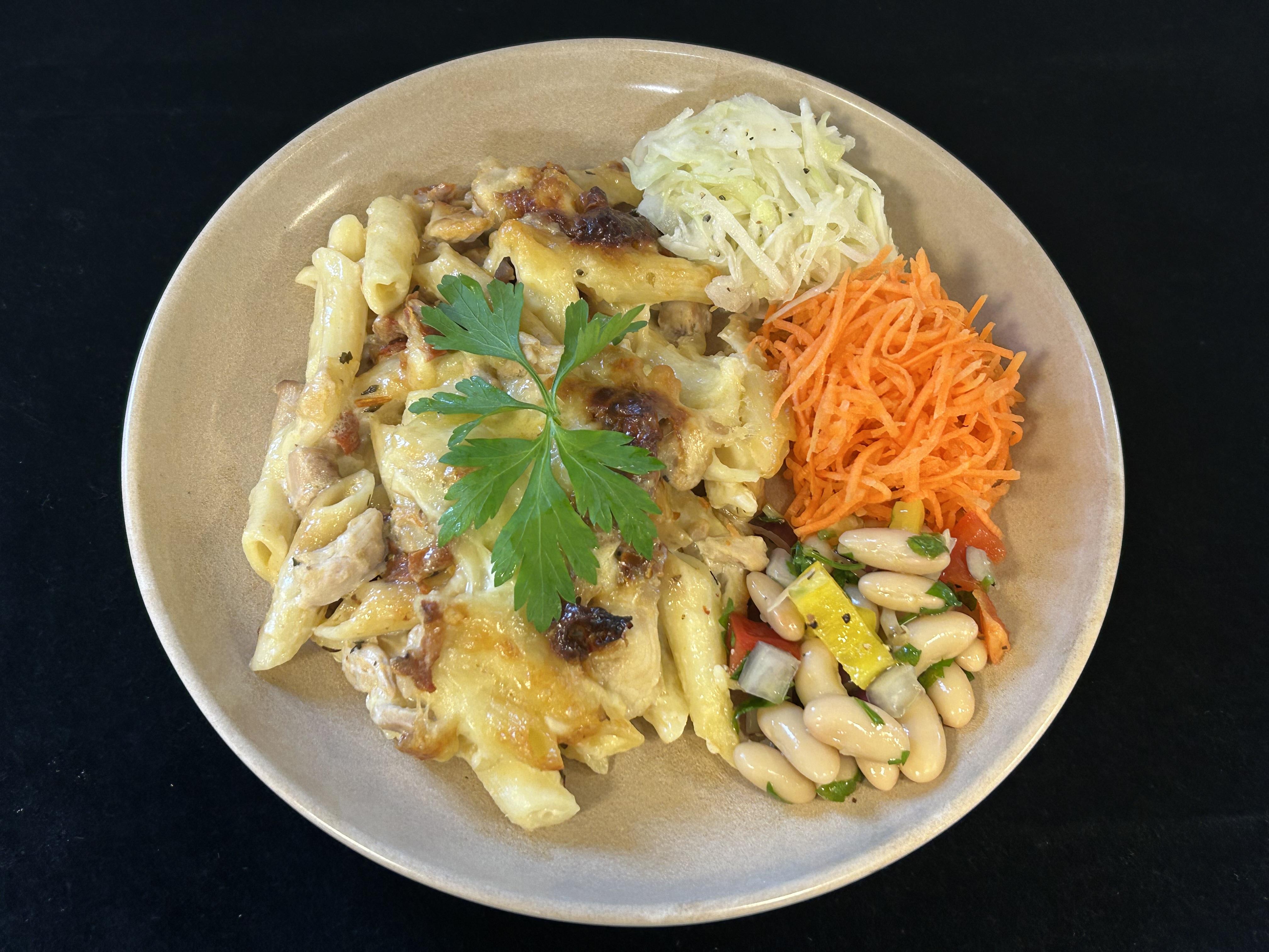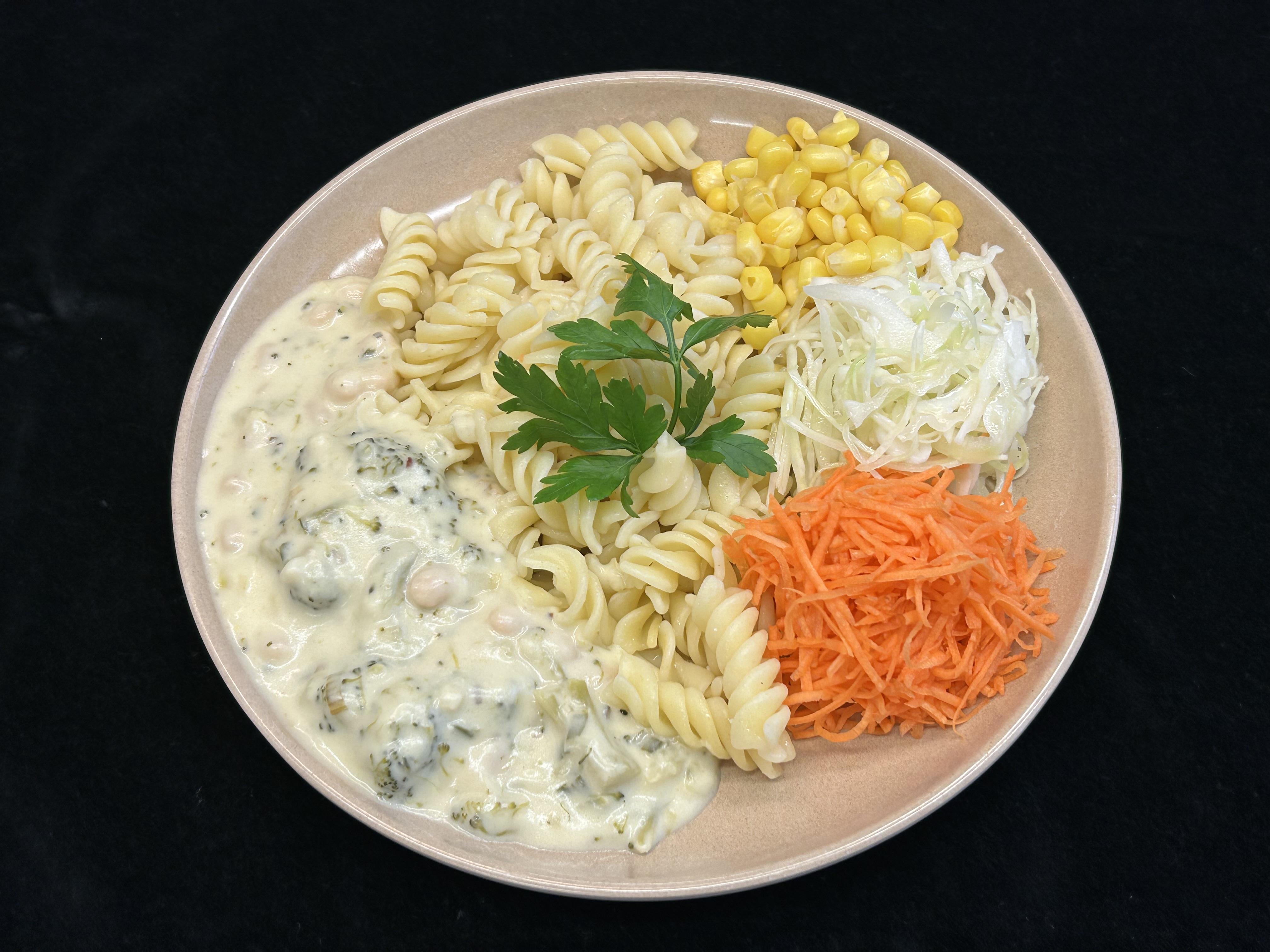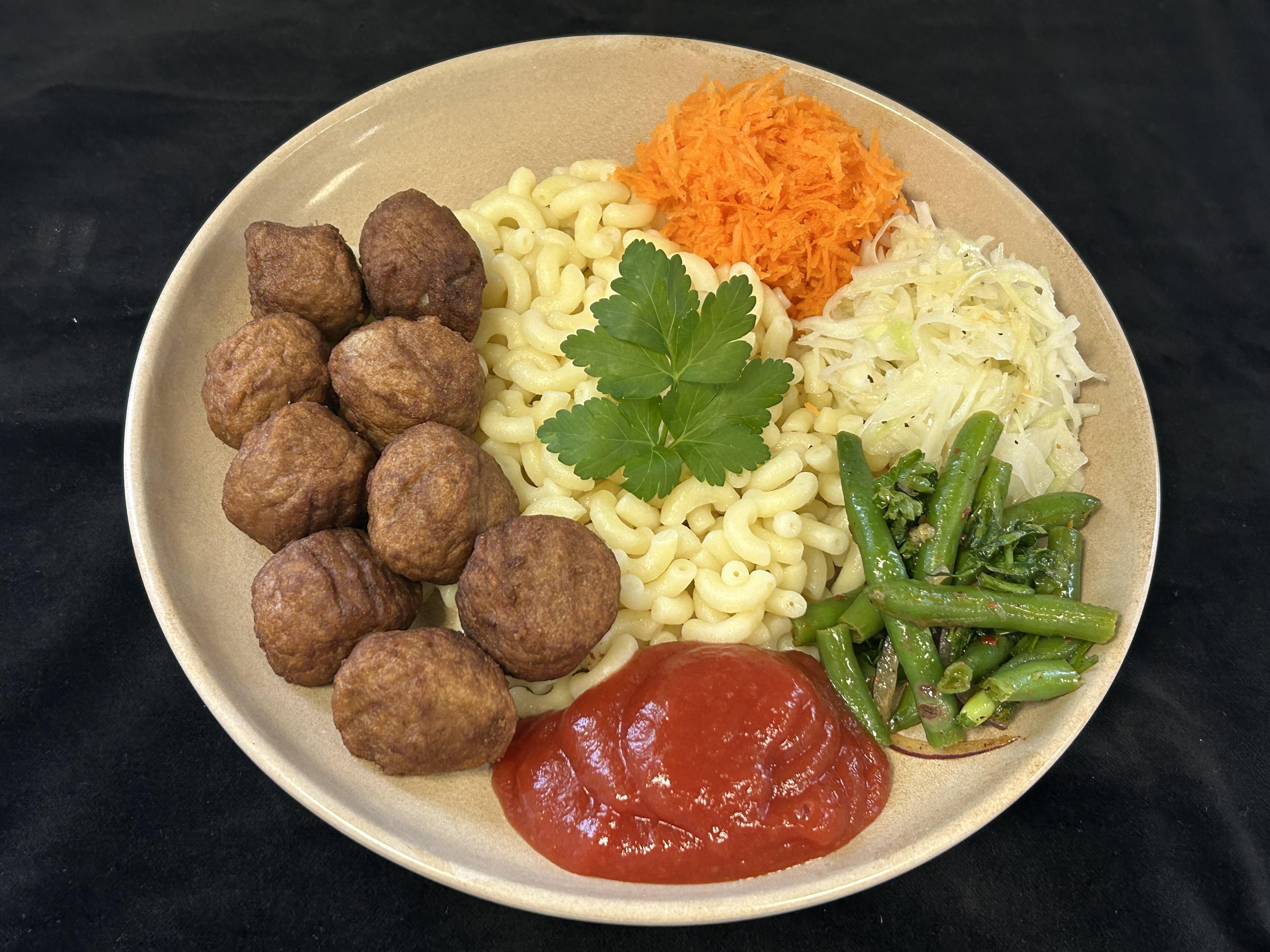 Kycklingköttbullar serveras med ketchup samt kokta makaroner