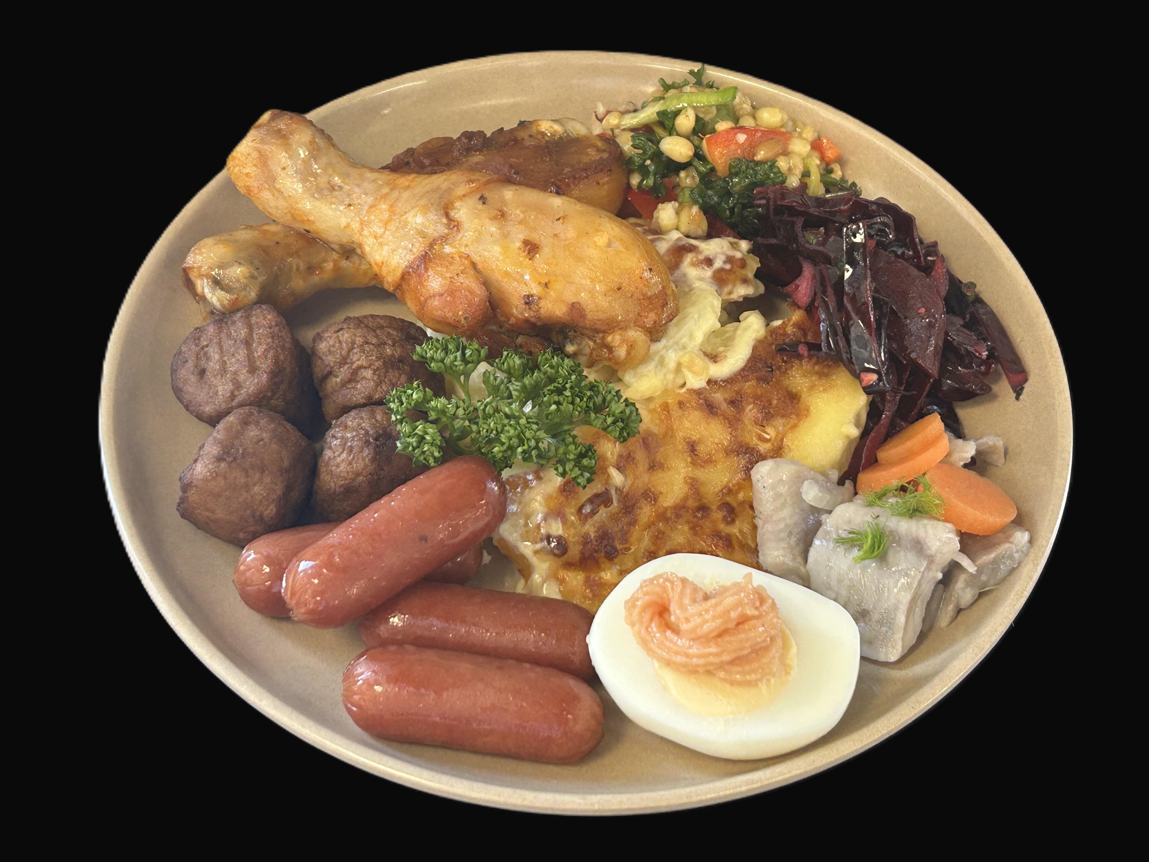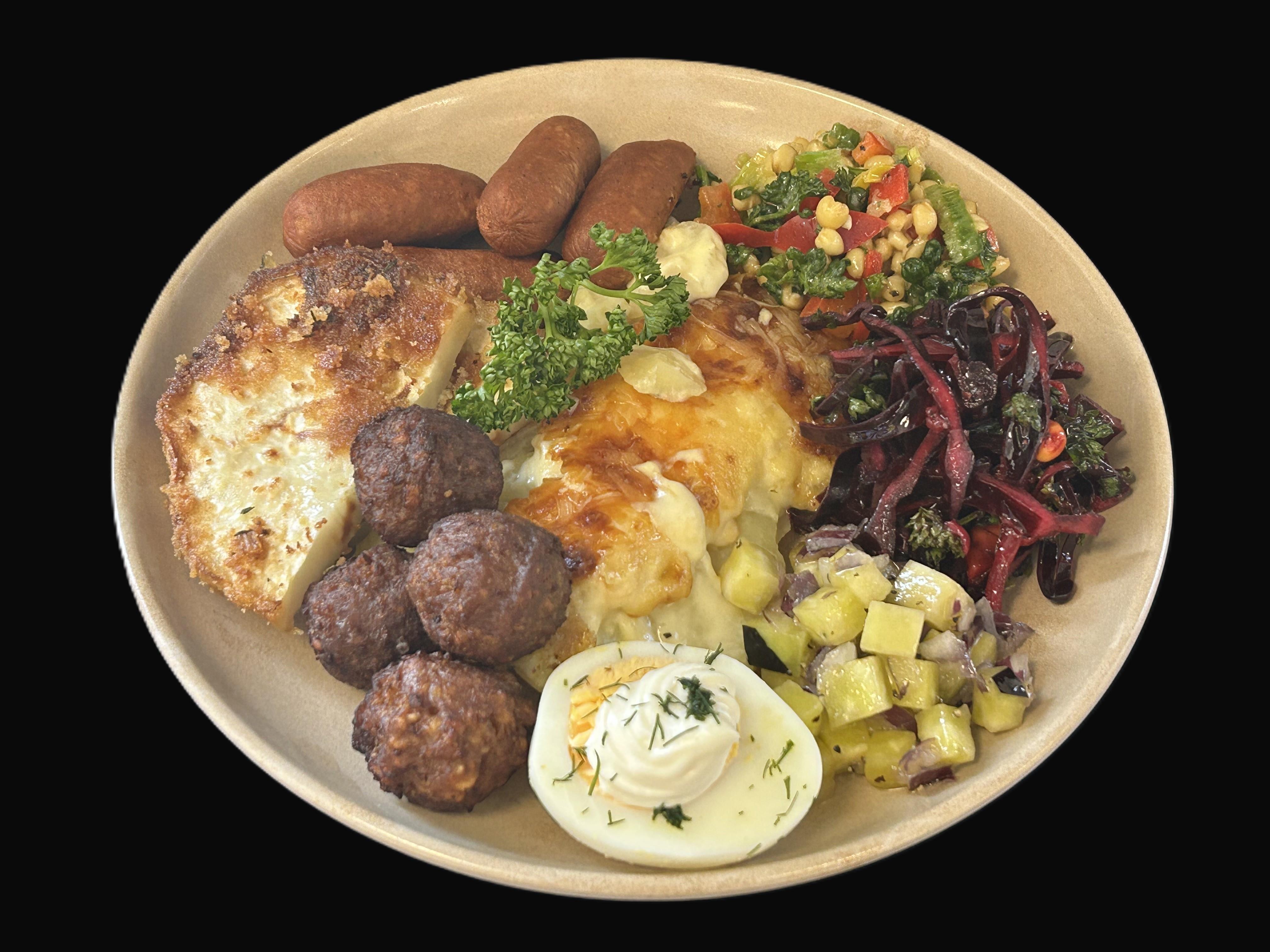 Kålpudding (växtbaserad) serveras med brunsås och lingonsylt samt kokt potatis