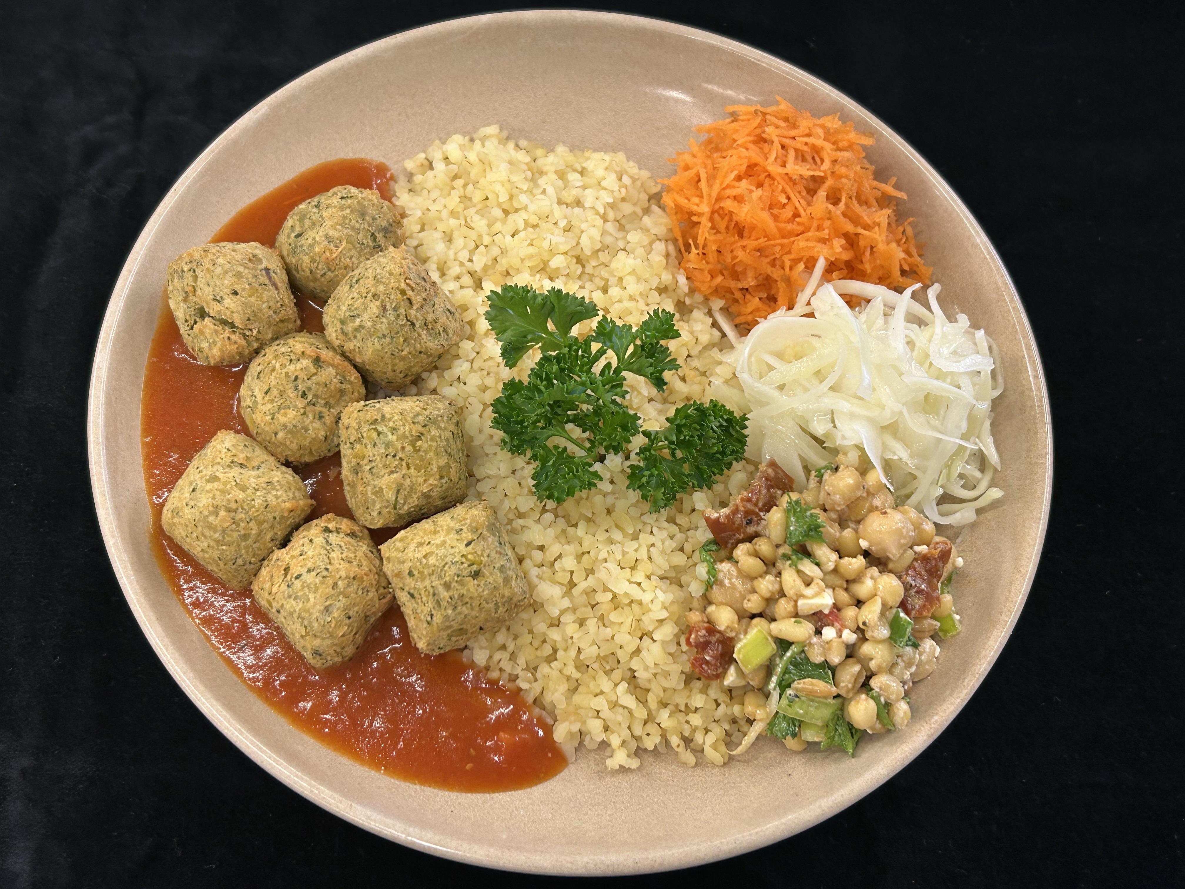 Falafel serveras med kryddig tomatsås samt bulgur