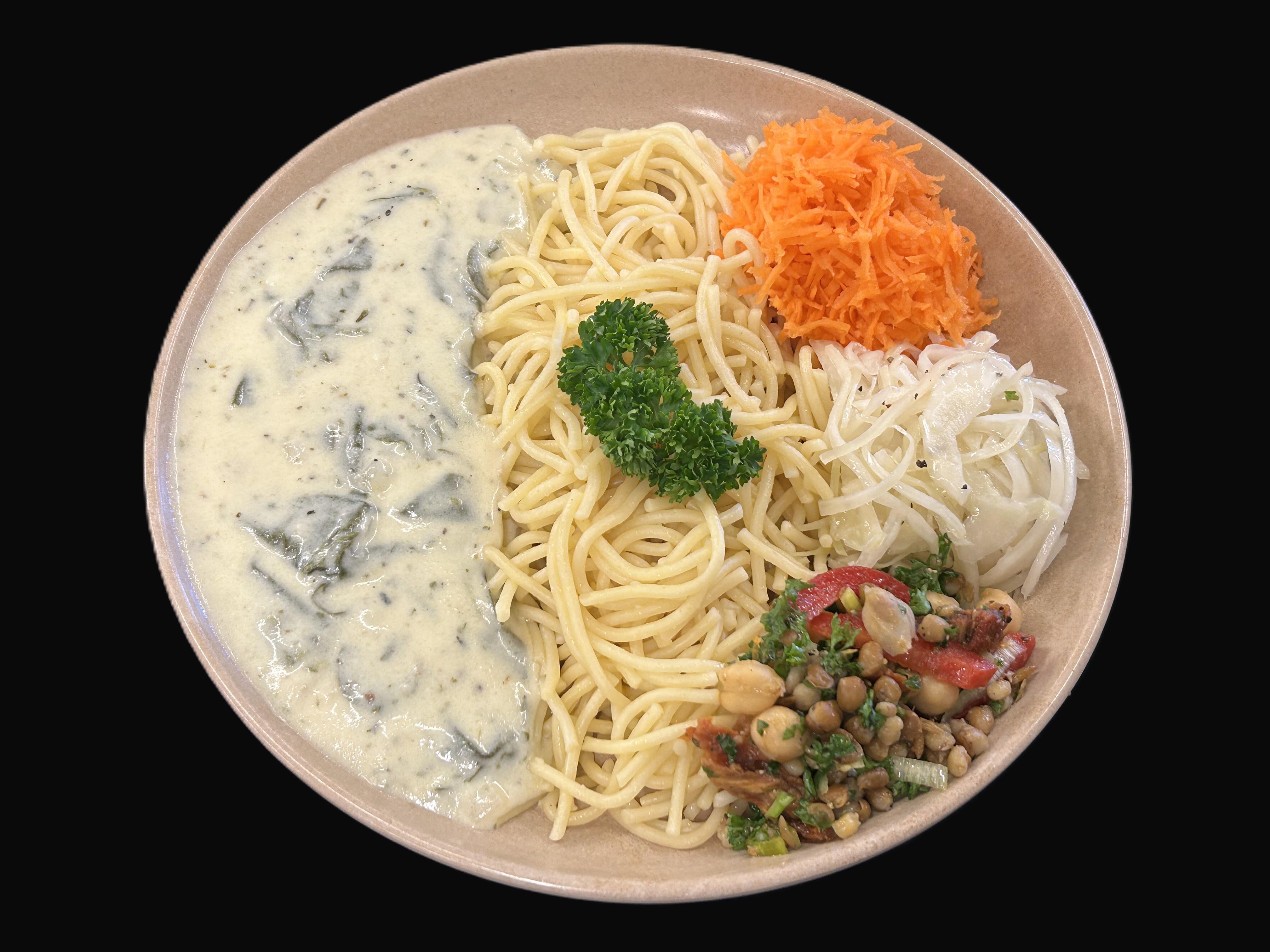 Spenat- och ostsås serveras med spaghetti
