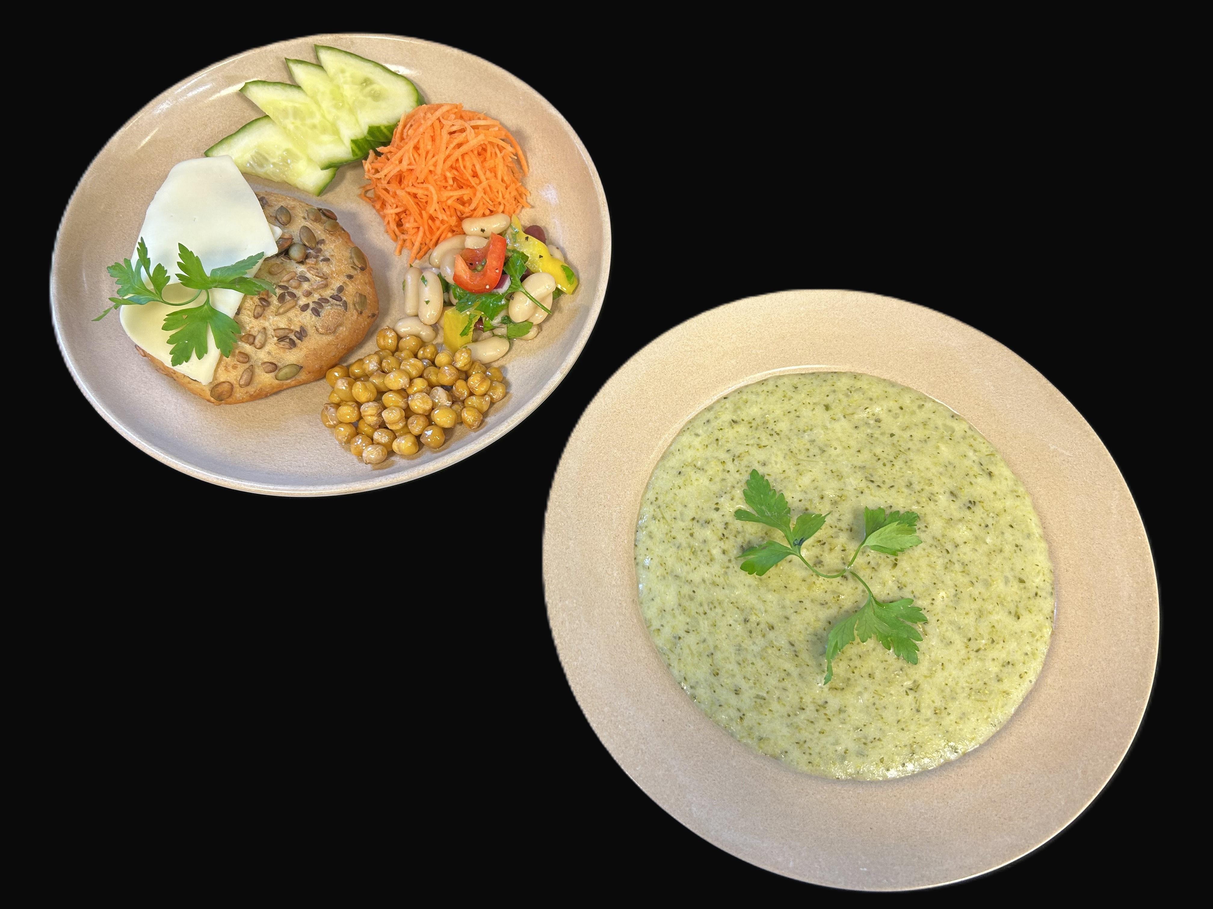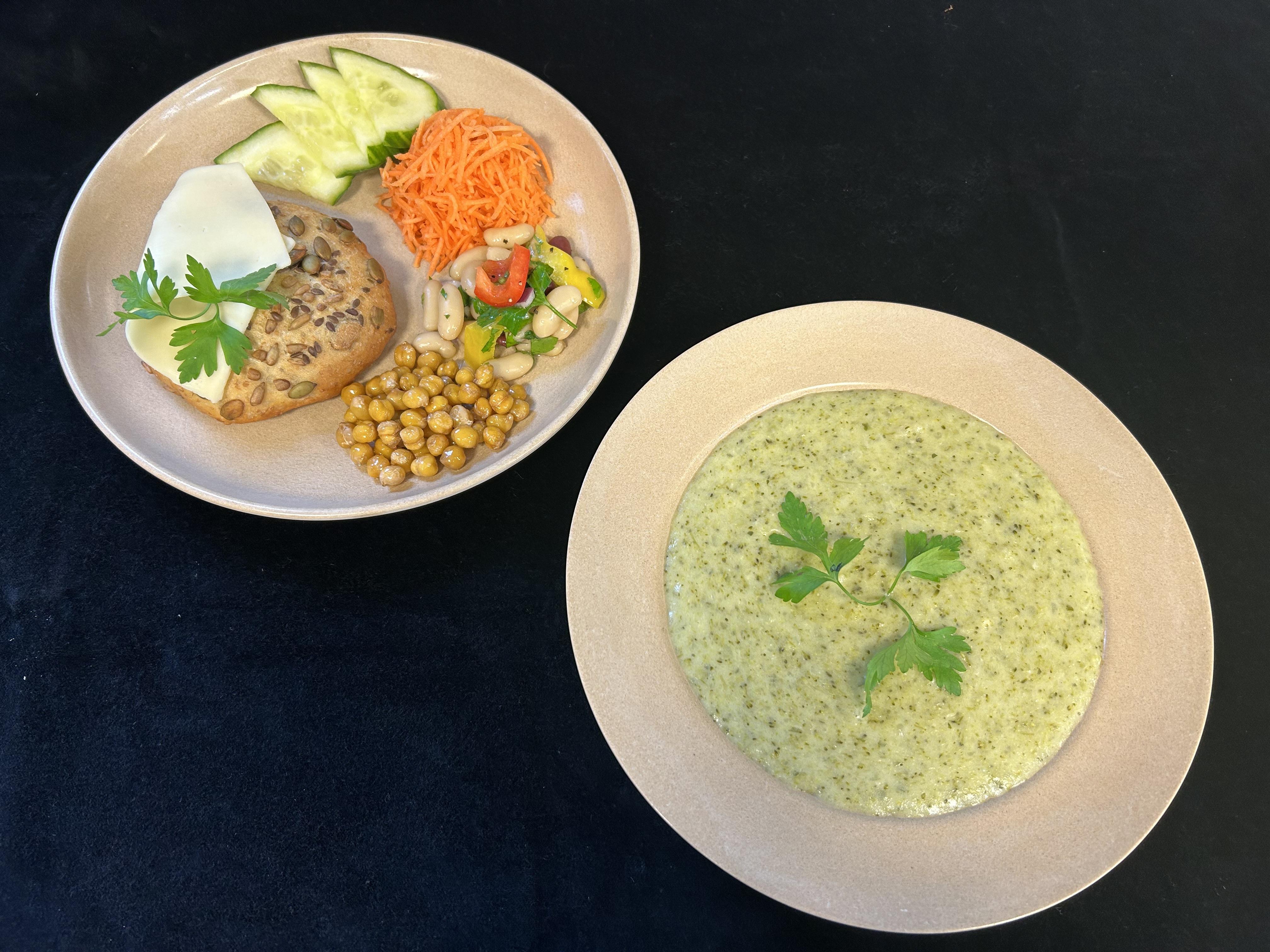 Broccolisoppa serveras med rostade kikärtor, mjukt bröd samt pålägg