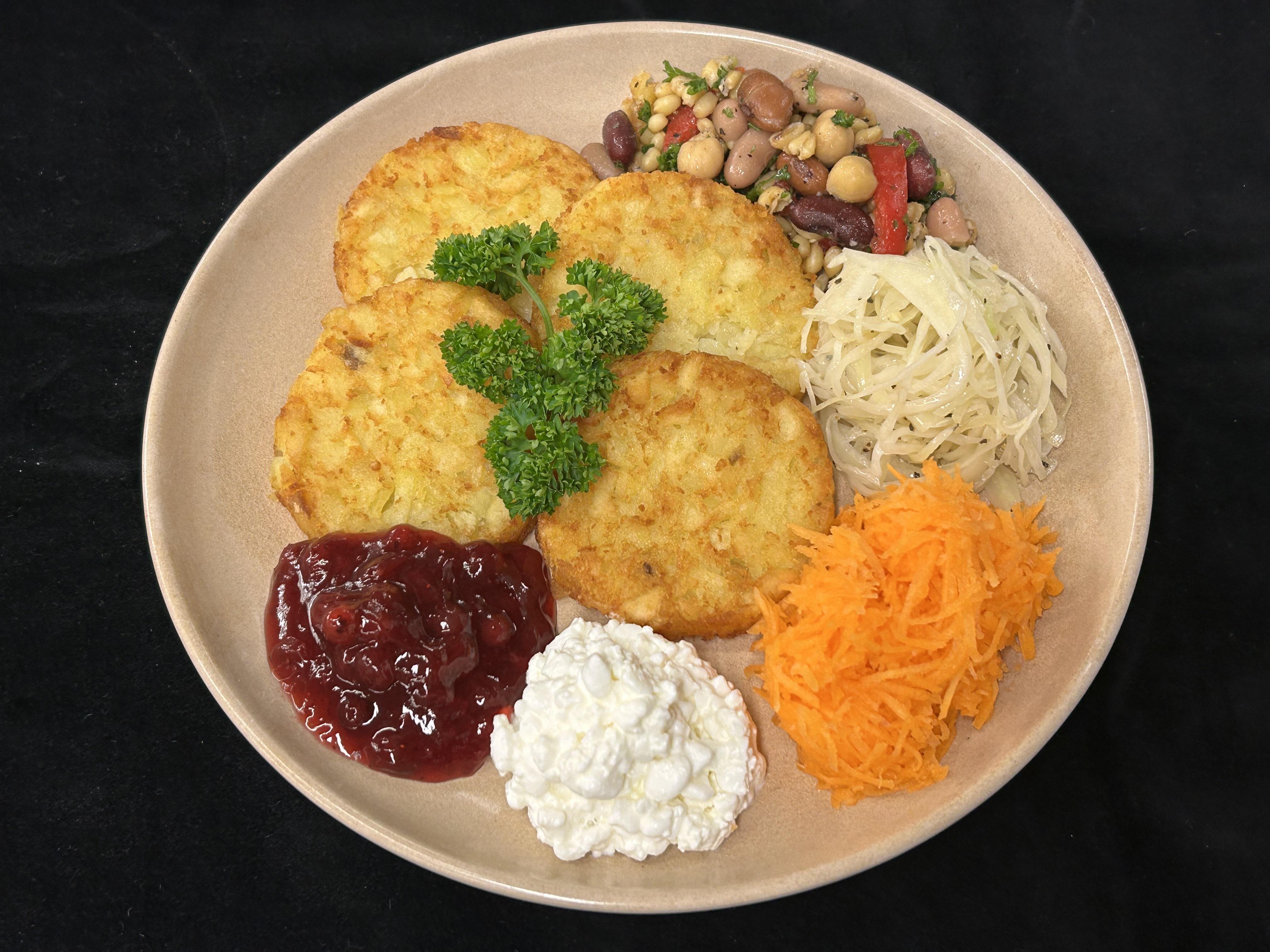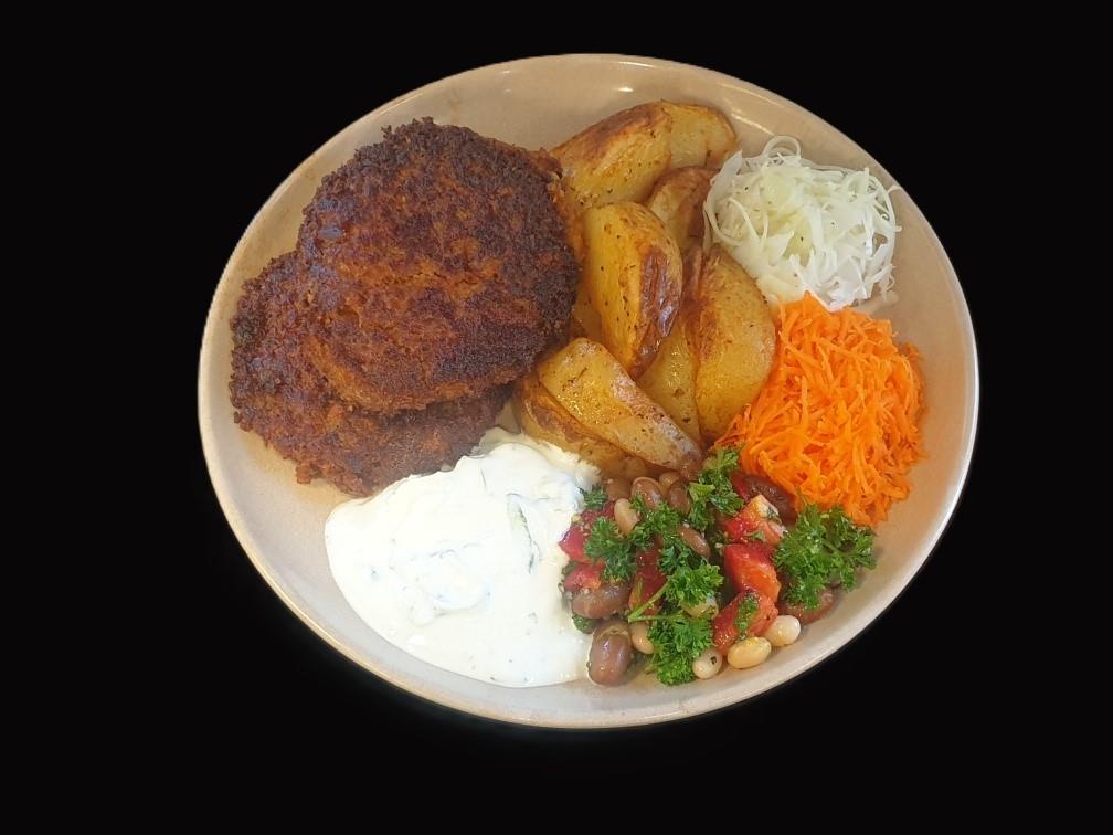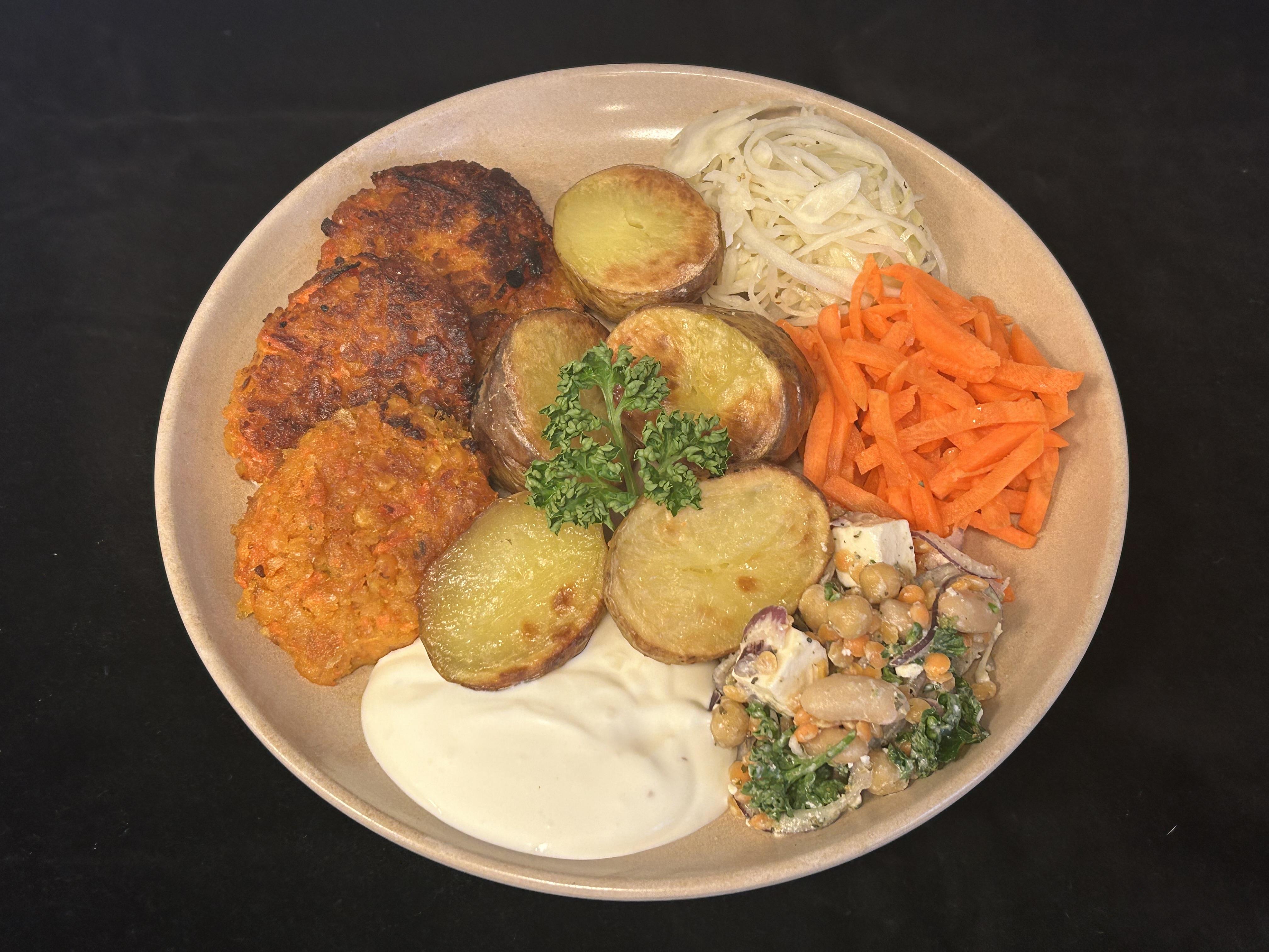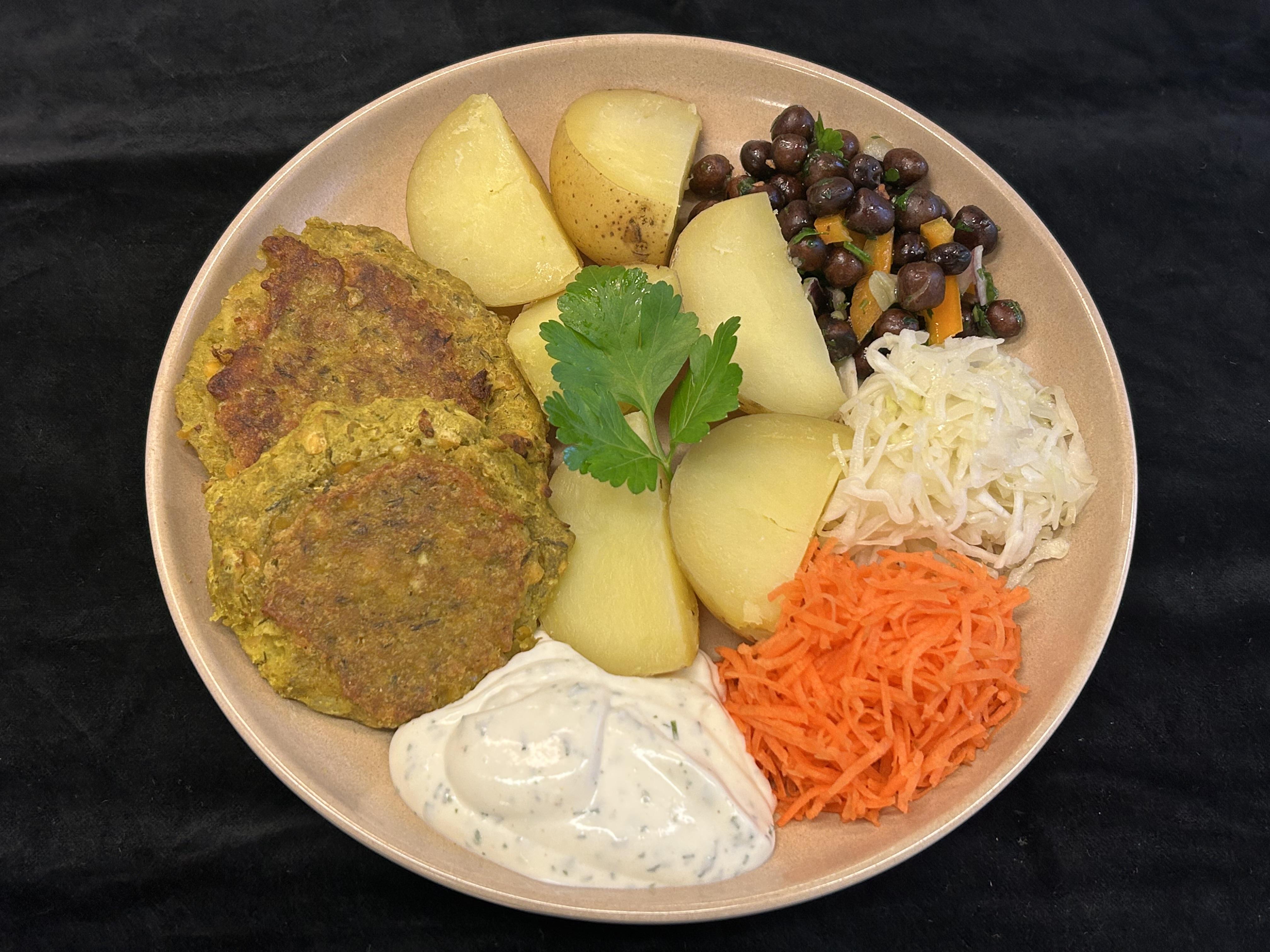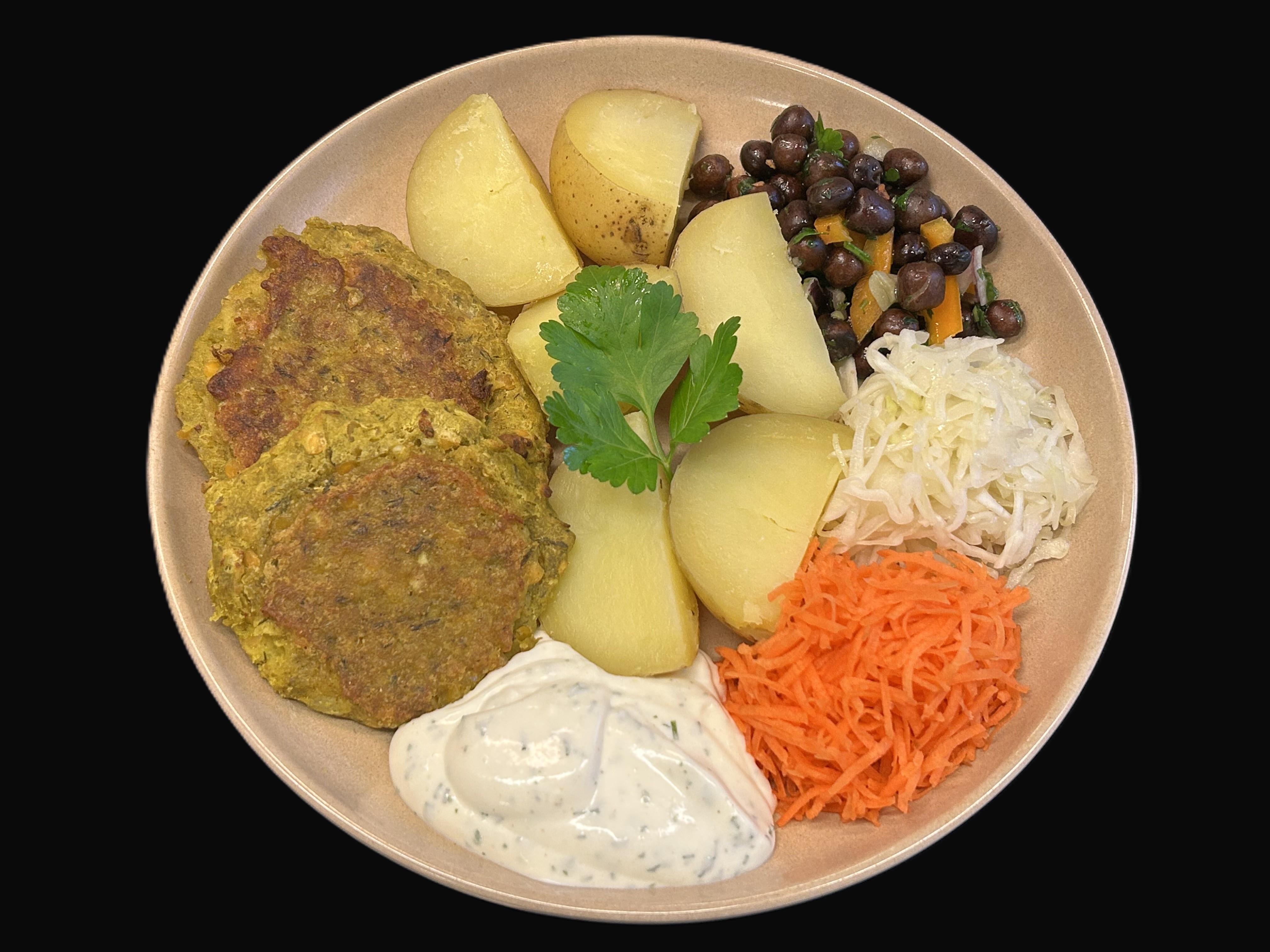 Broccoli- och linsbiffar serveras med örtagårdssås samt kokt potatis