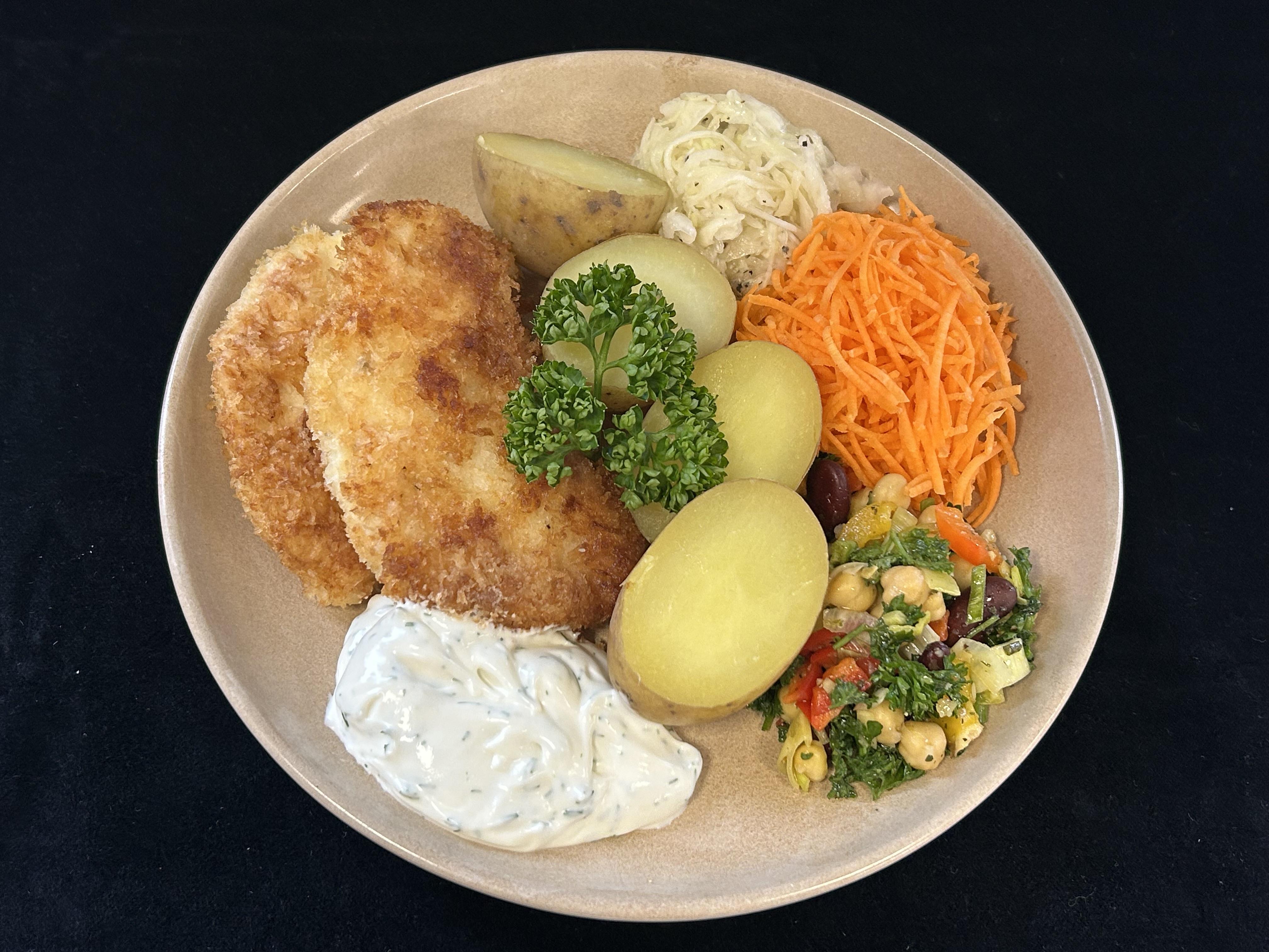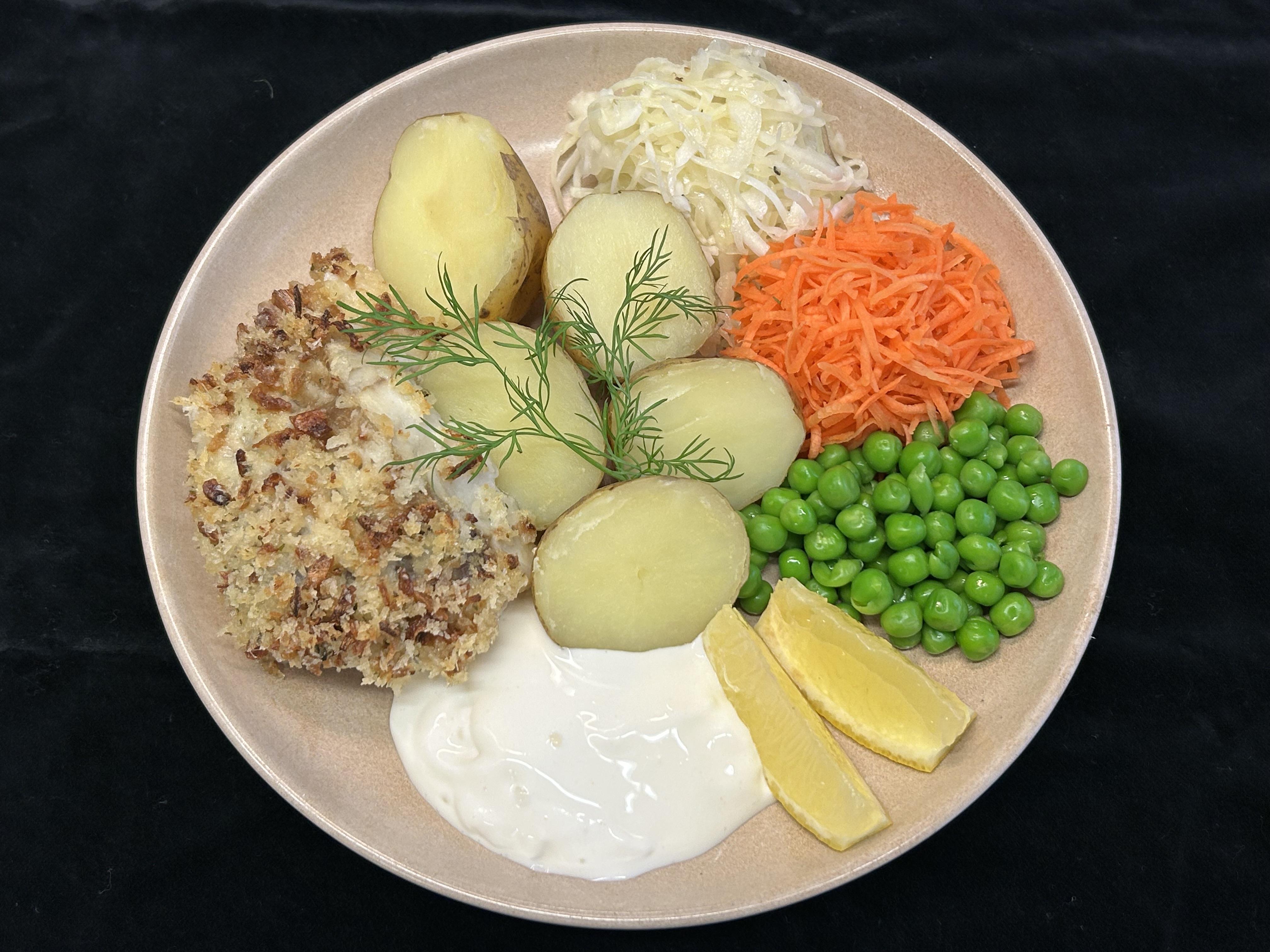 Pankopanerad fiskfilé serveras med citronmajonnäs samt kokt potatis
