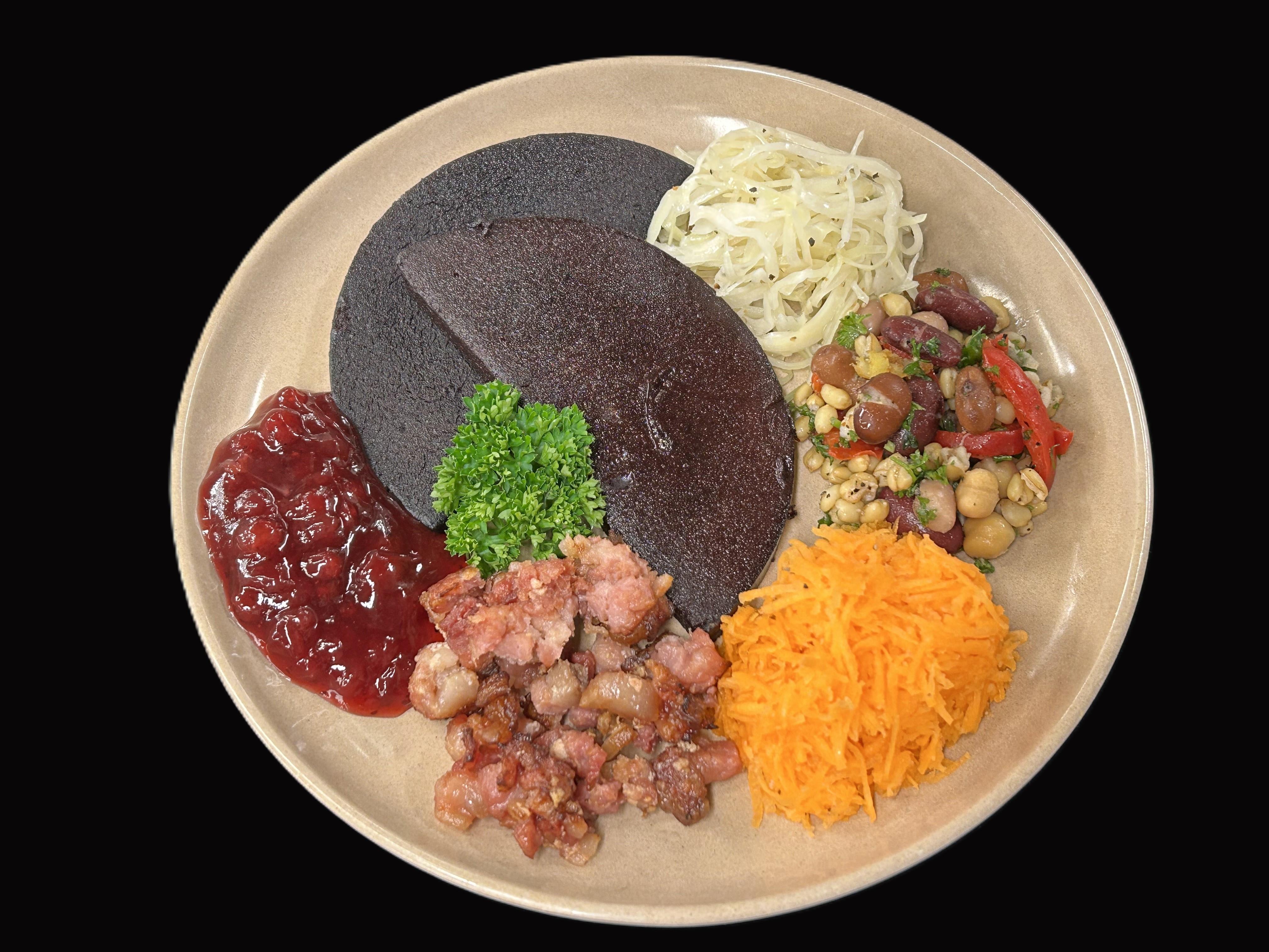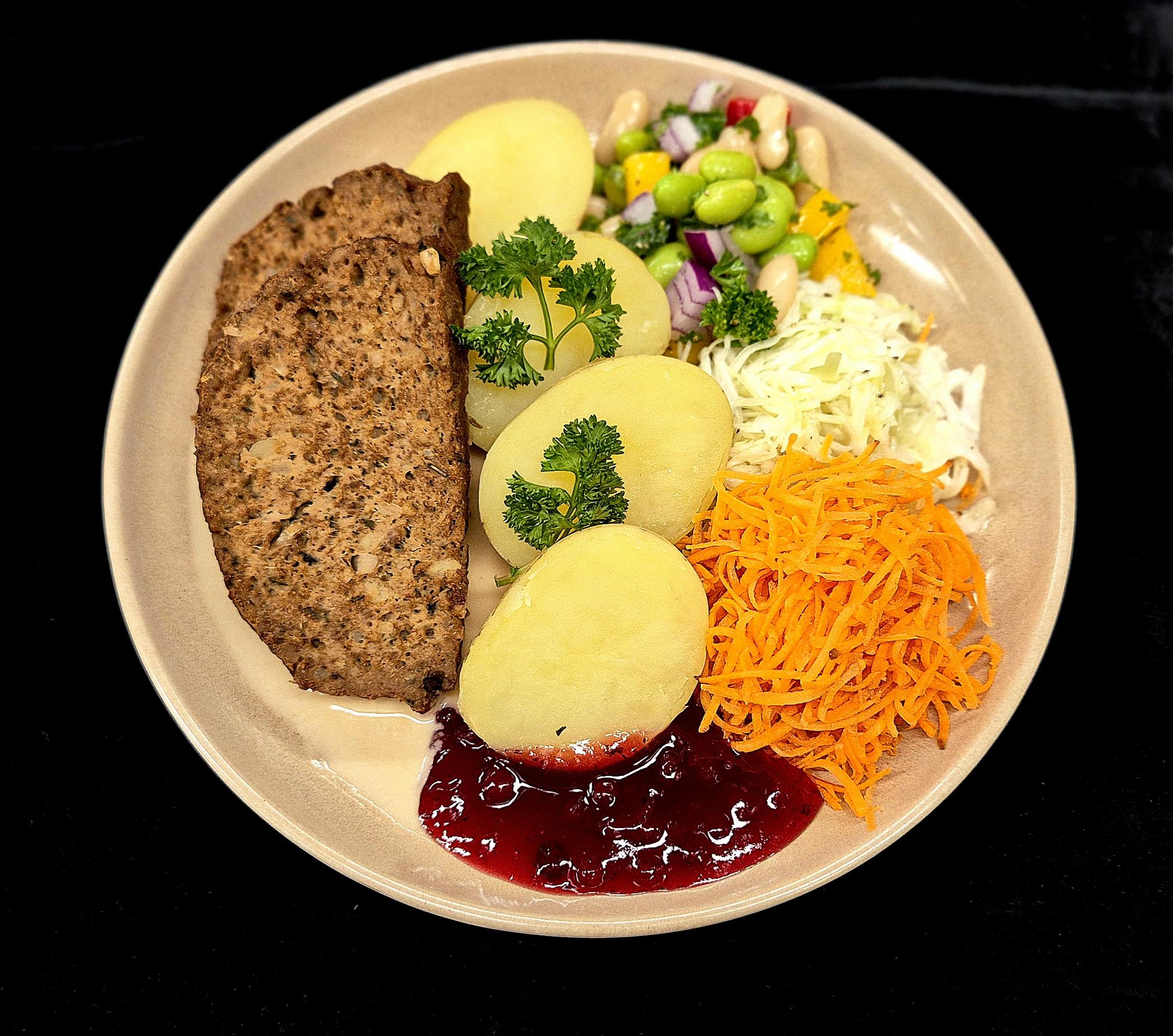 Köttfärslimpa (50/50) serveras med brunsås och lingonsylt samt kokt potatis