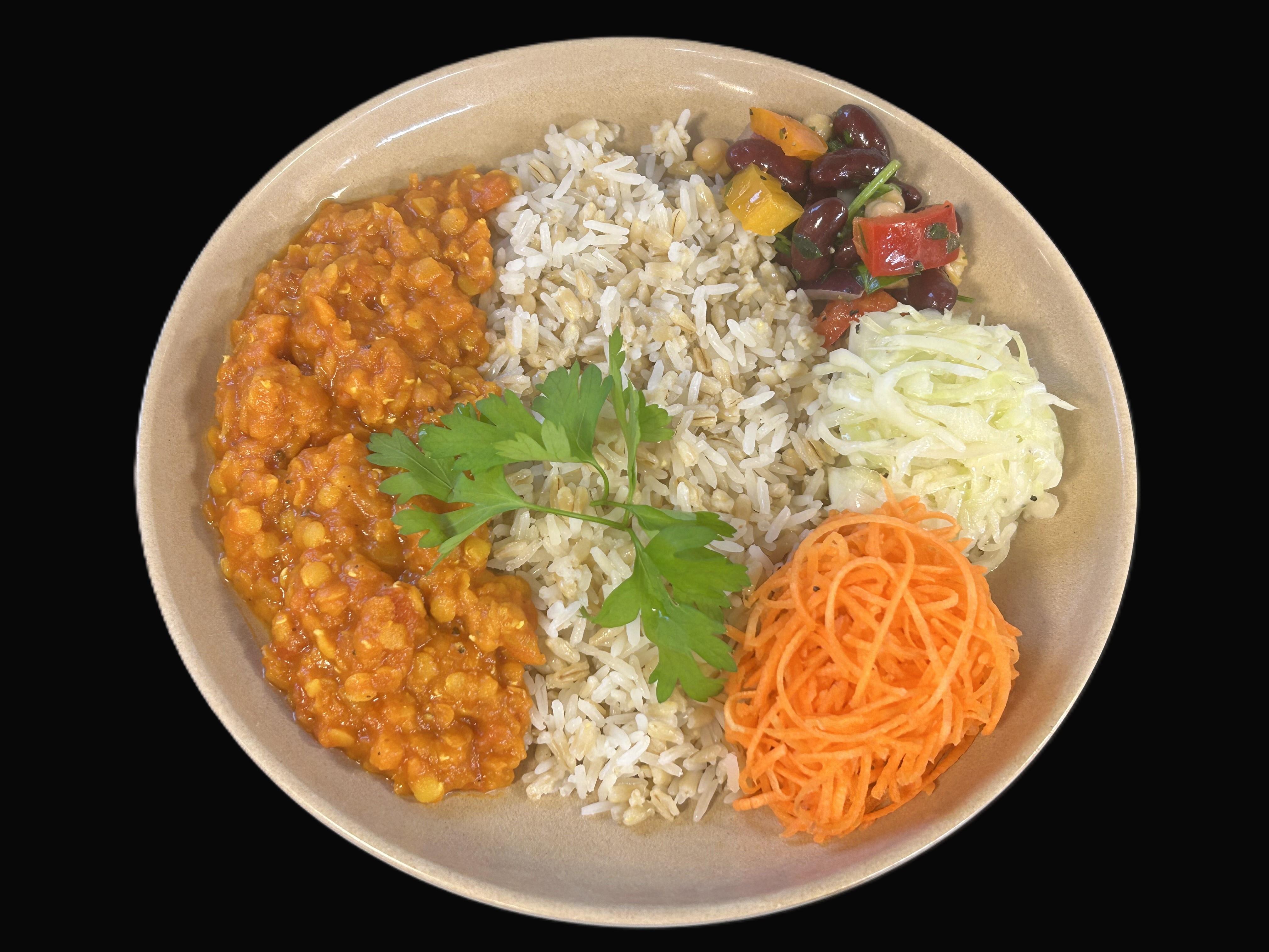 Indisk linsgryta serveras med ris- och havrerismix