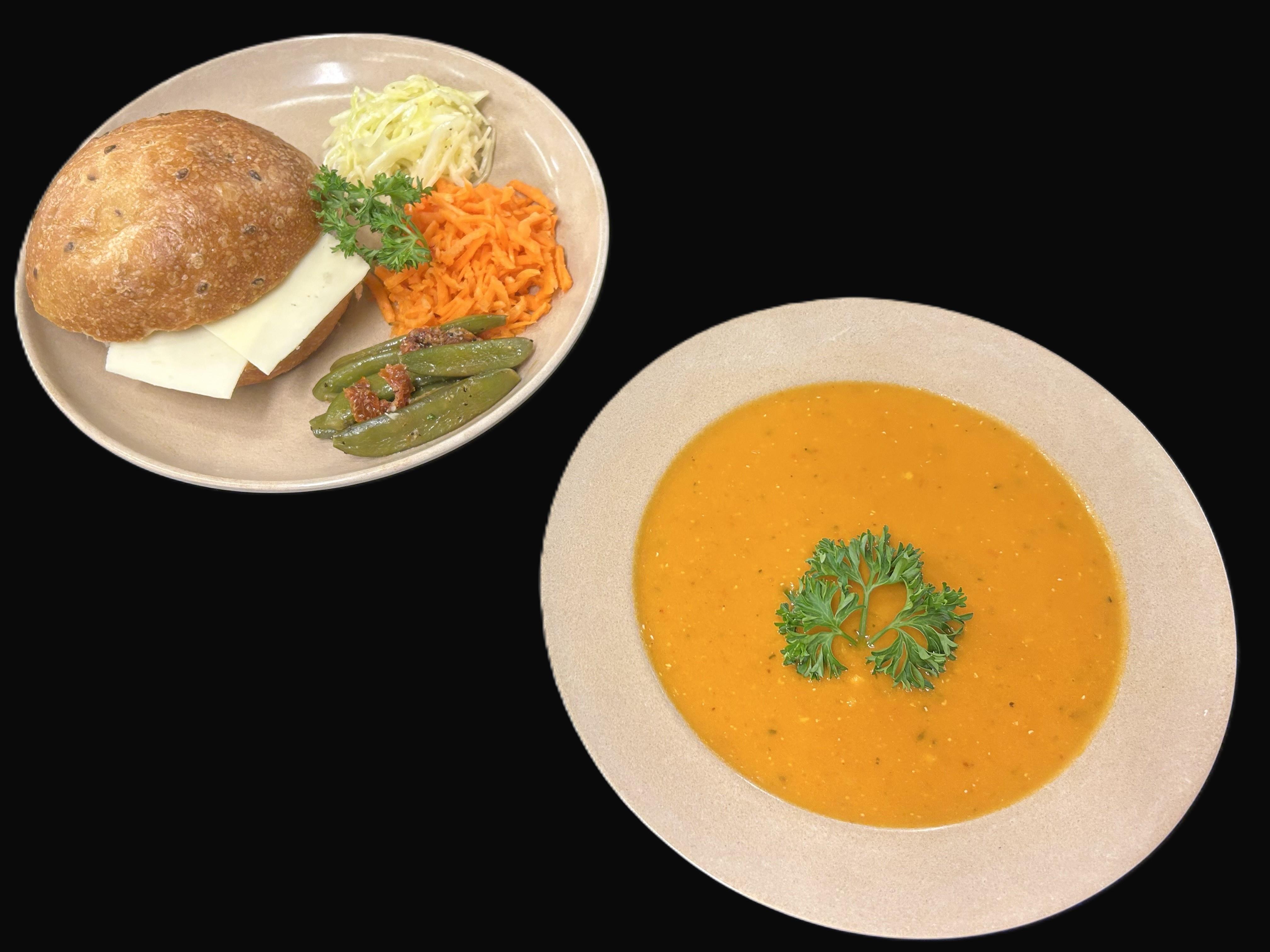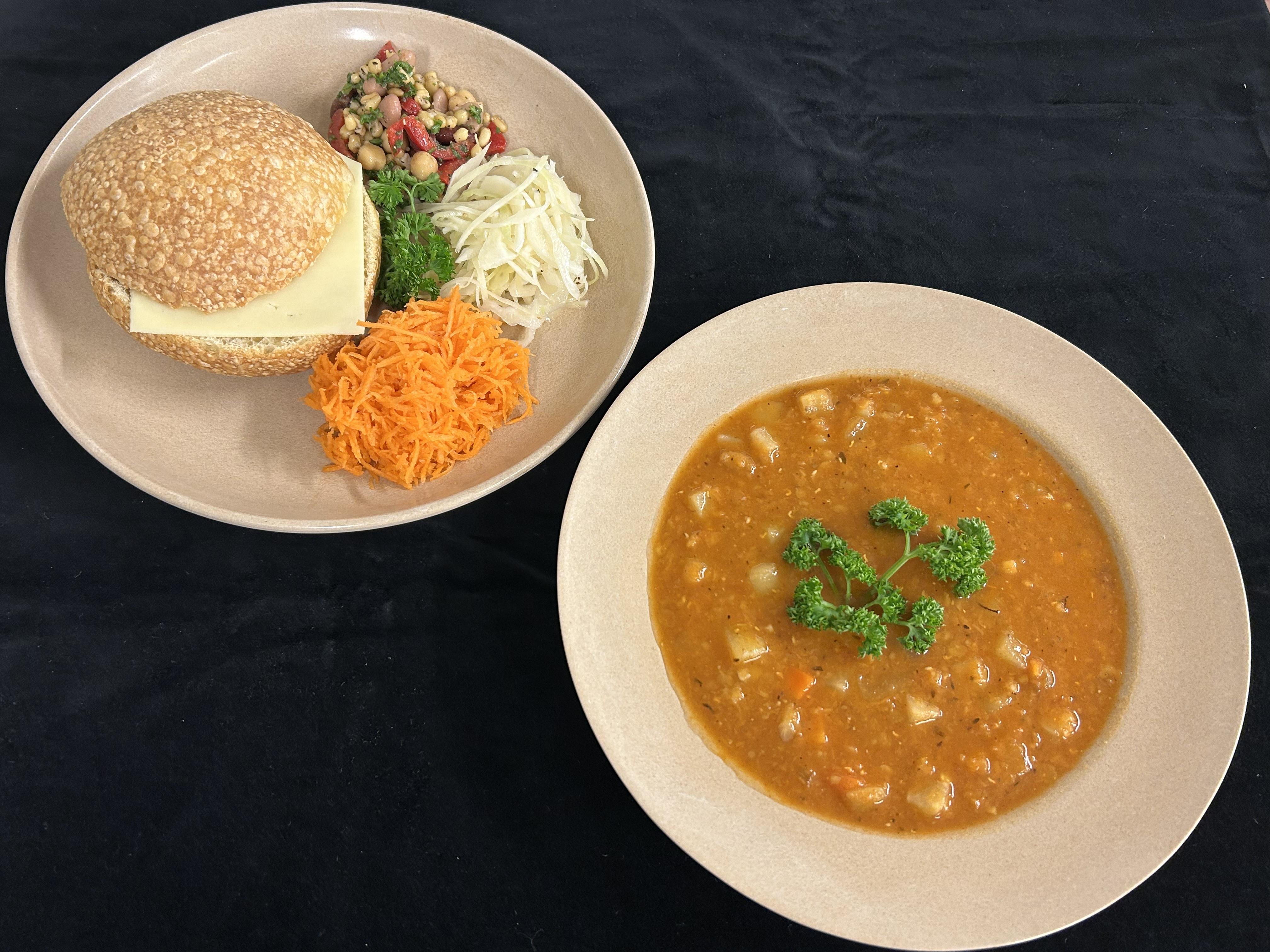 Linssoppa med rotfrukter serveras med mjukt bröd samt pålägg