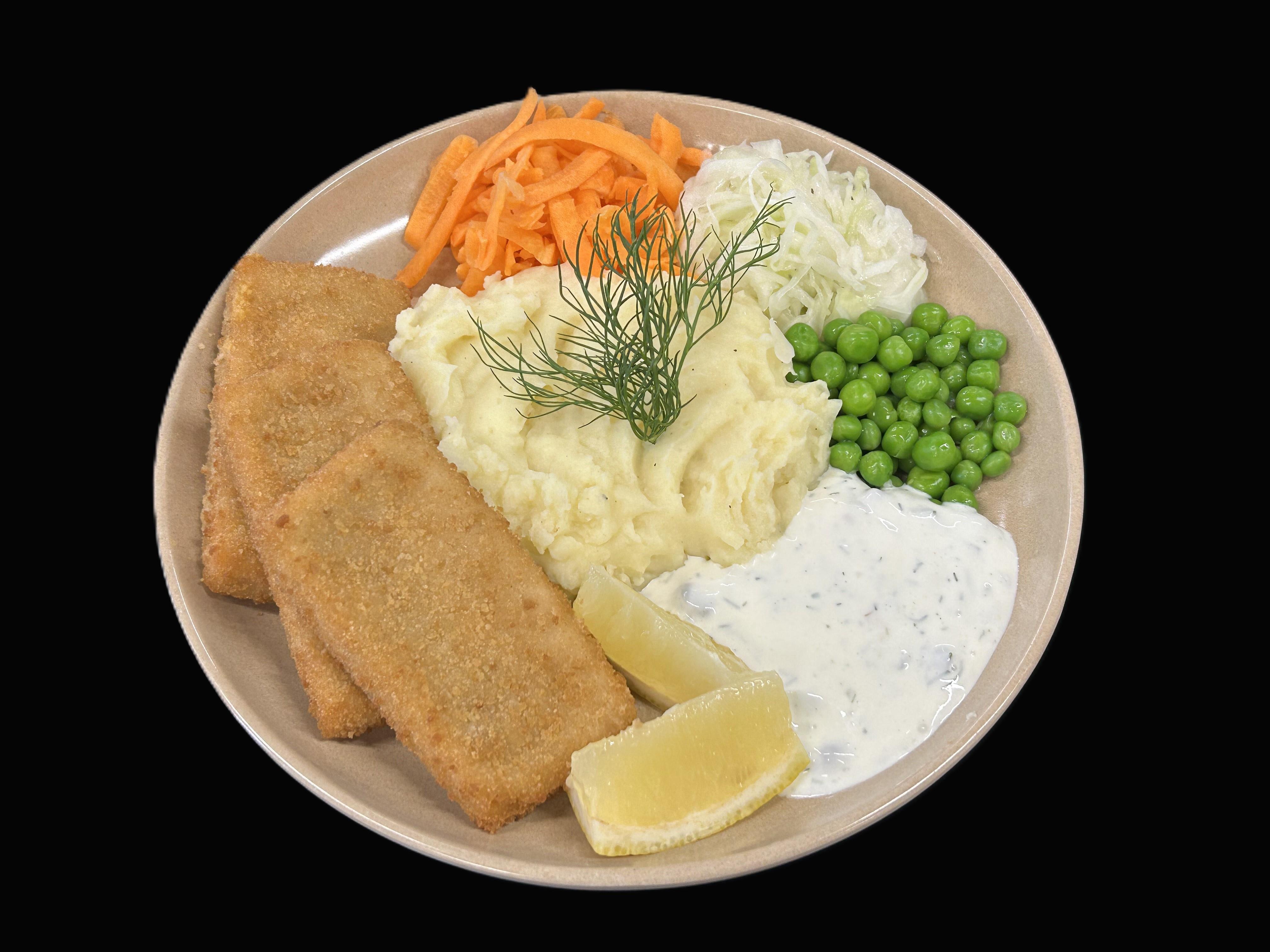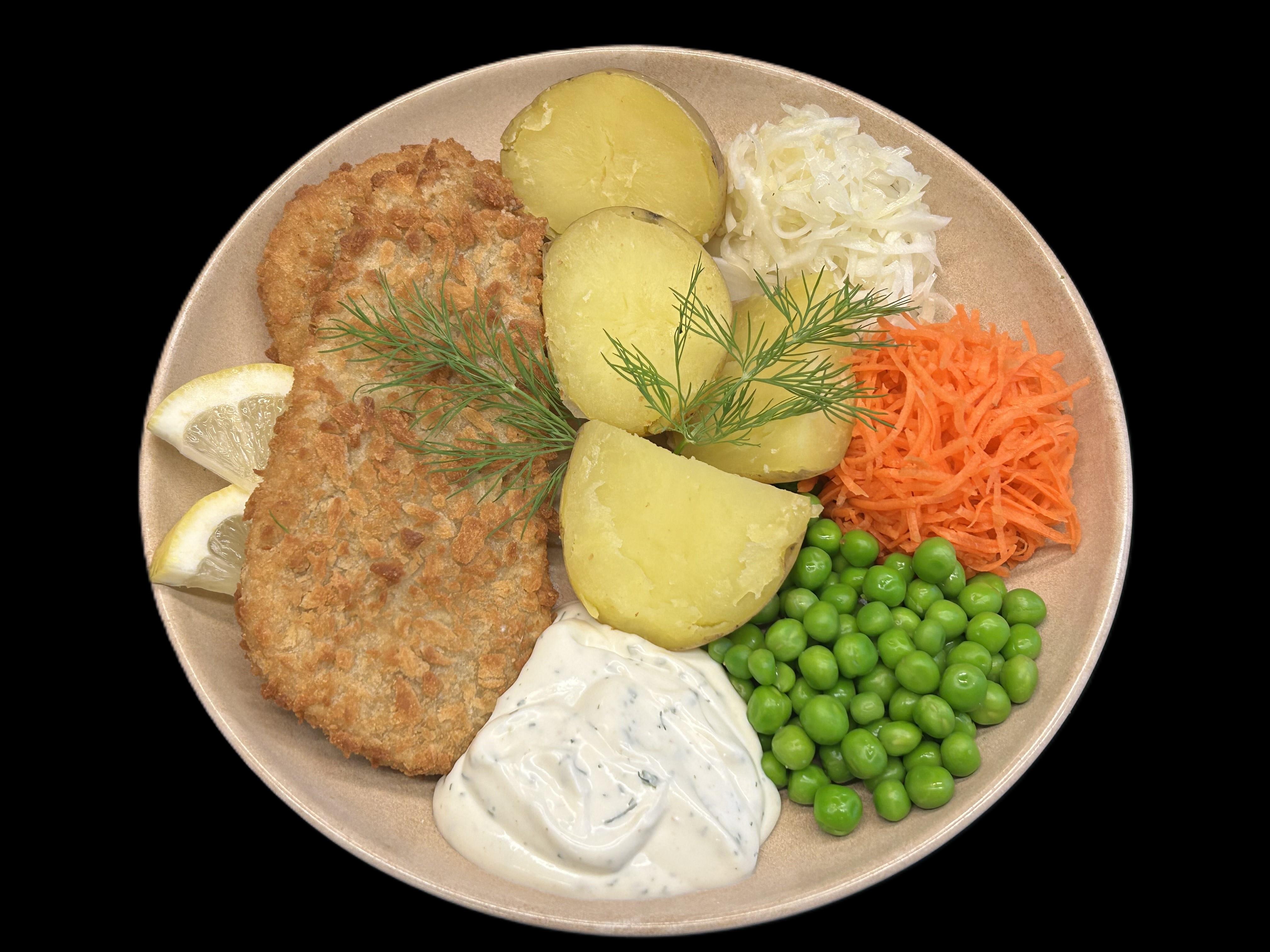 Panerad sej serveras med örtagårdssås samt klyftpotatis