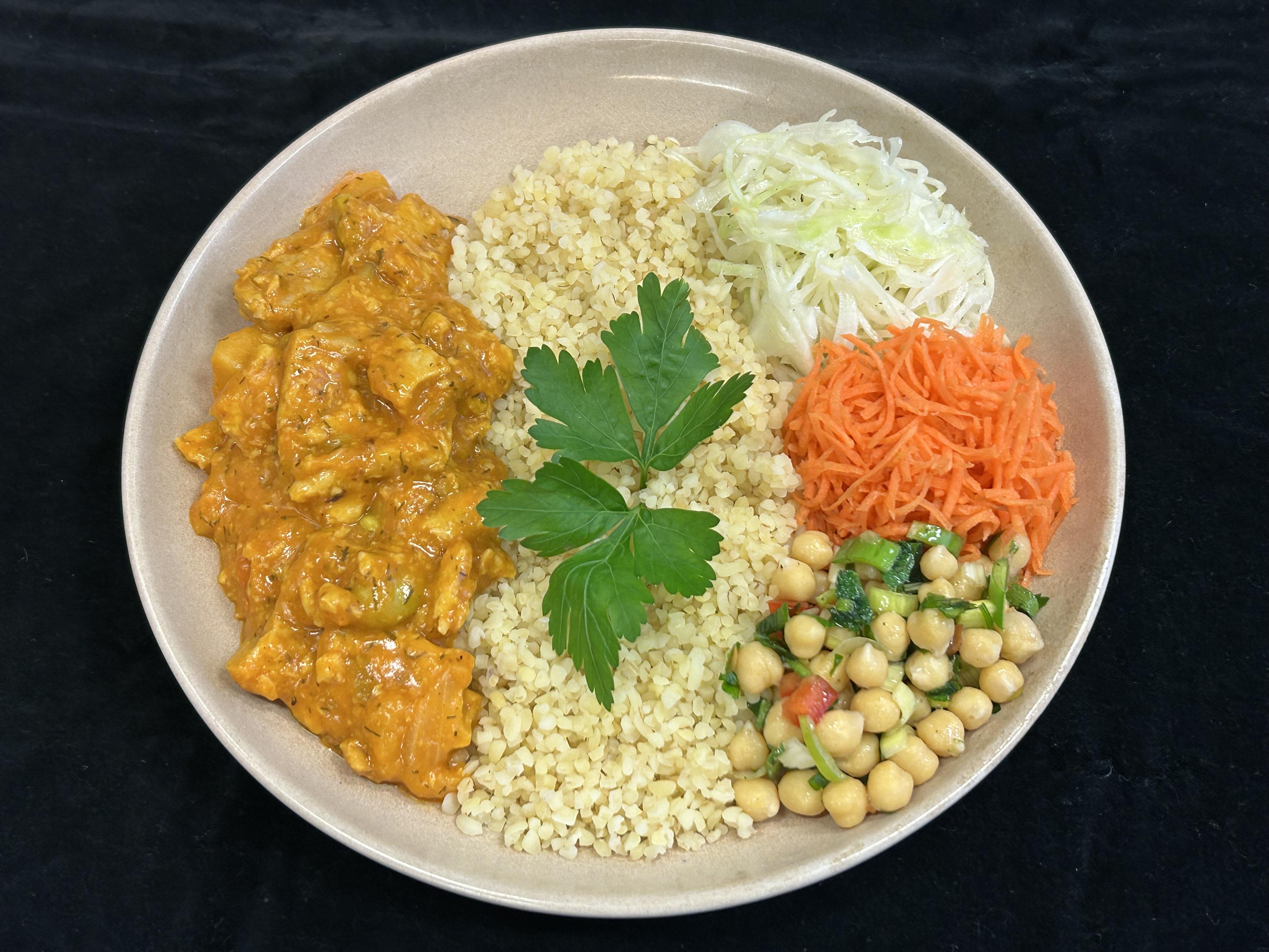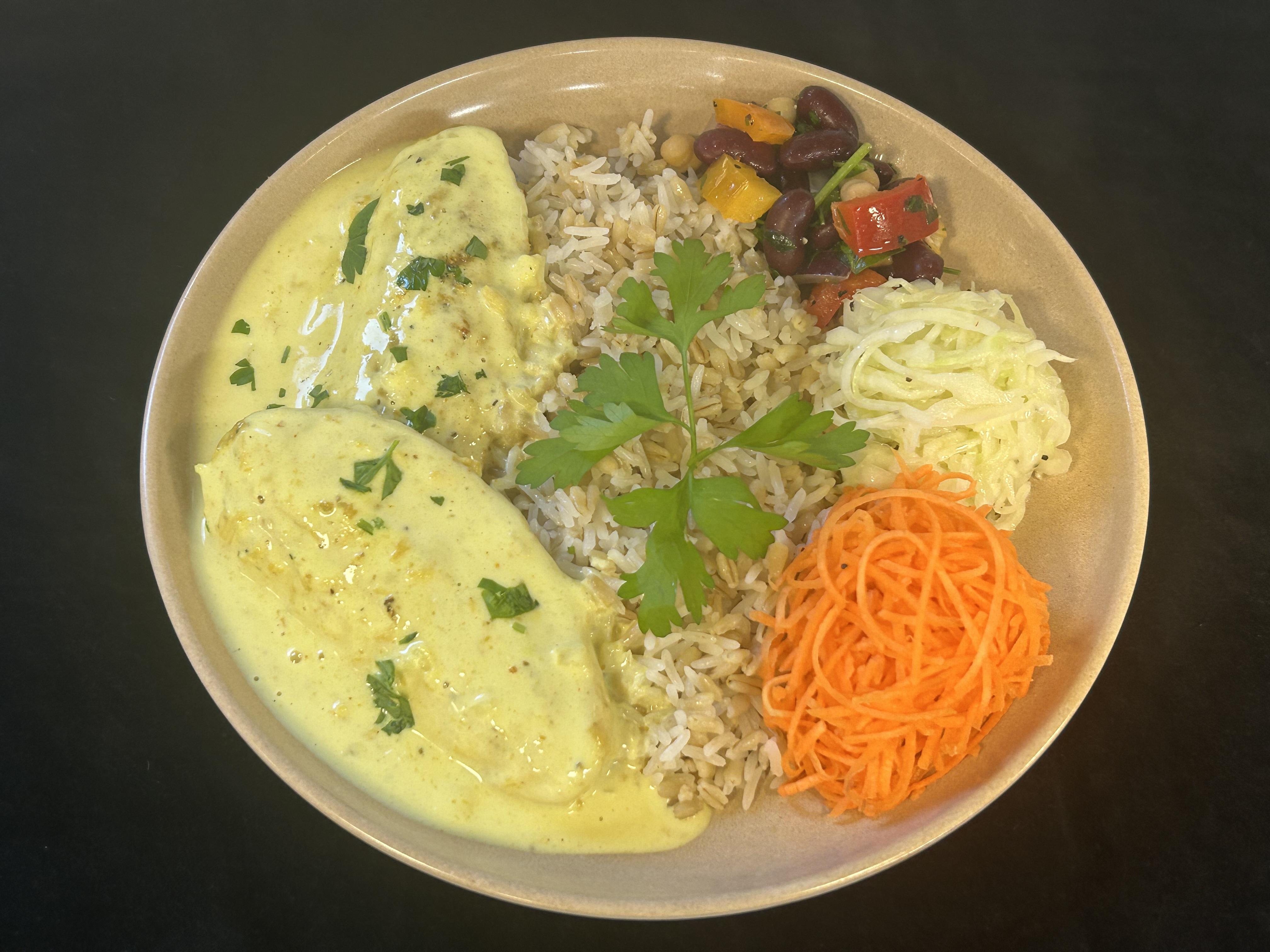 Stroganoff med kycklingkorv serveras med ris- och havrerismix