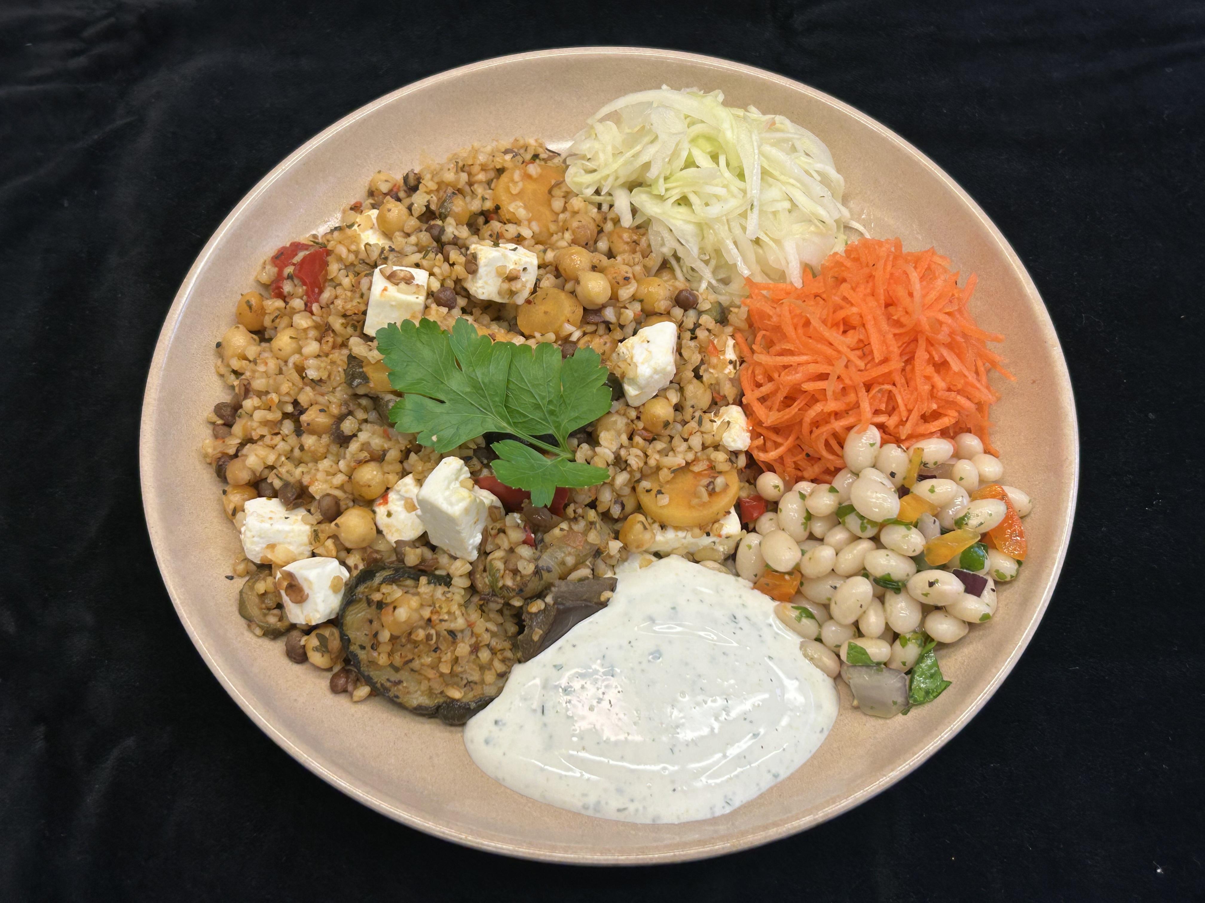 Bulgurpytt med stekta grönsaker, linser och fetaost serveras med kall vitlöksyoghurt