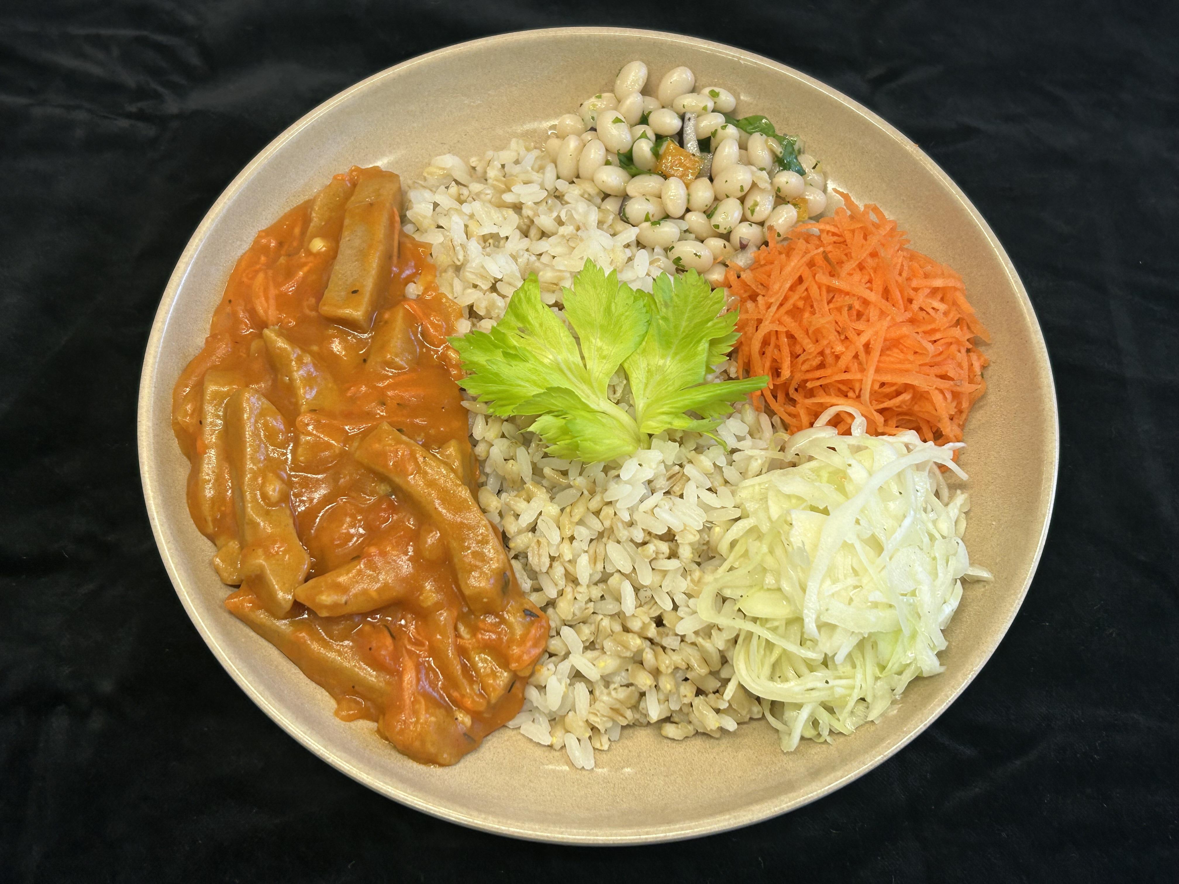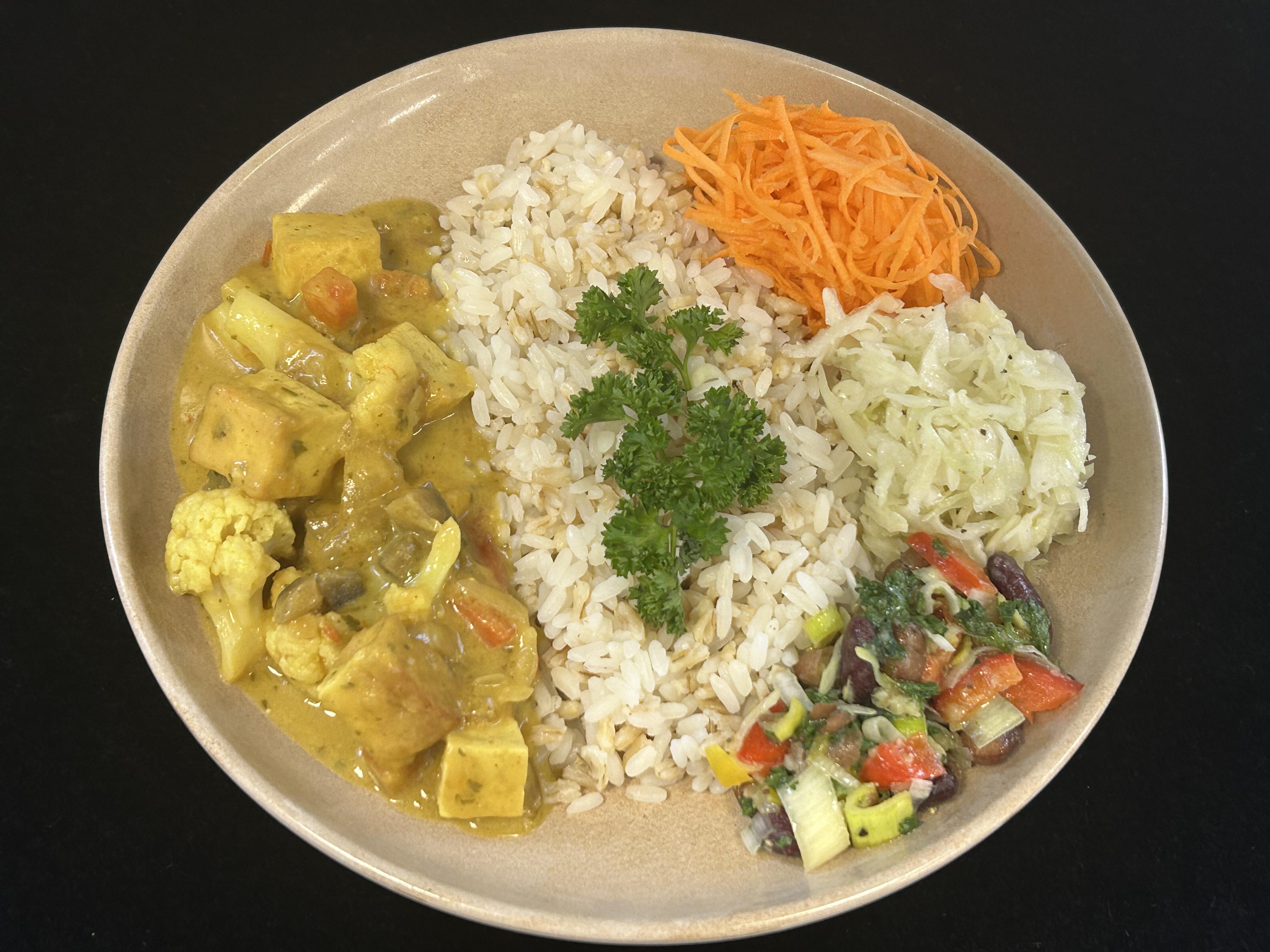 Röd currygryta serveras med ris- och havrerismix
