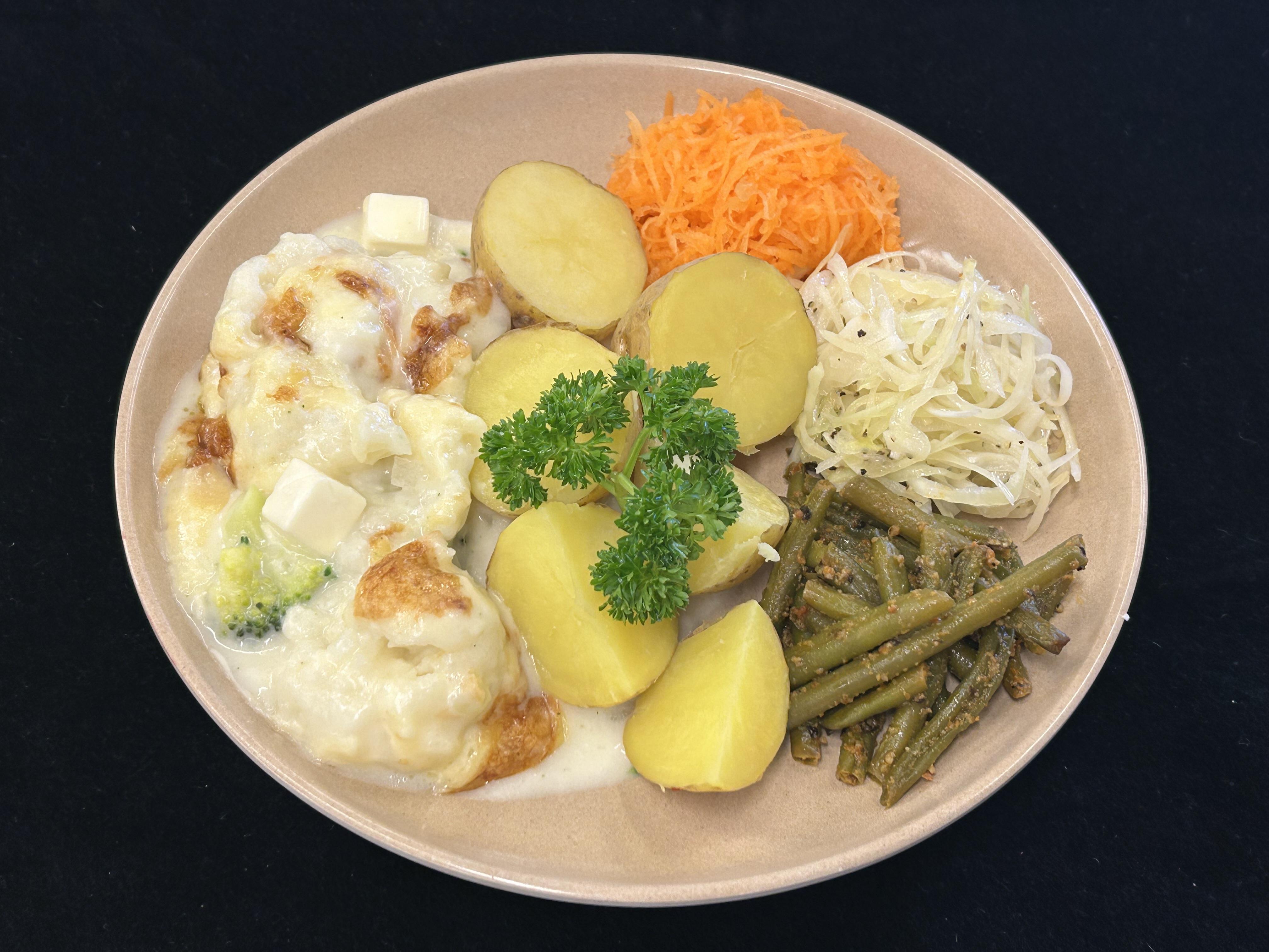 Broccoli- och blomkålsgratäng serveras med kokt potatis