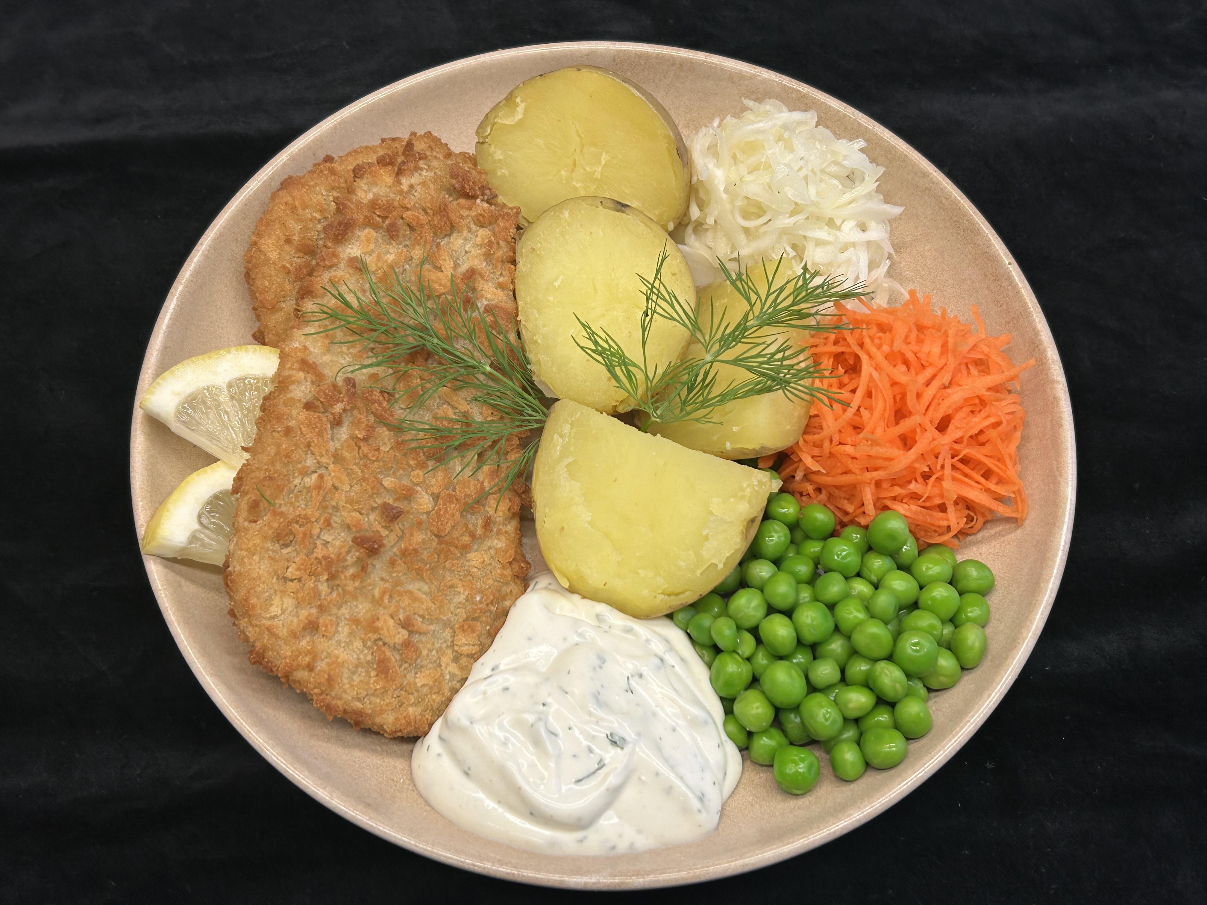 Pankopanerad rotselleri serveras med dillsås samt kokt potatis