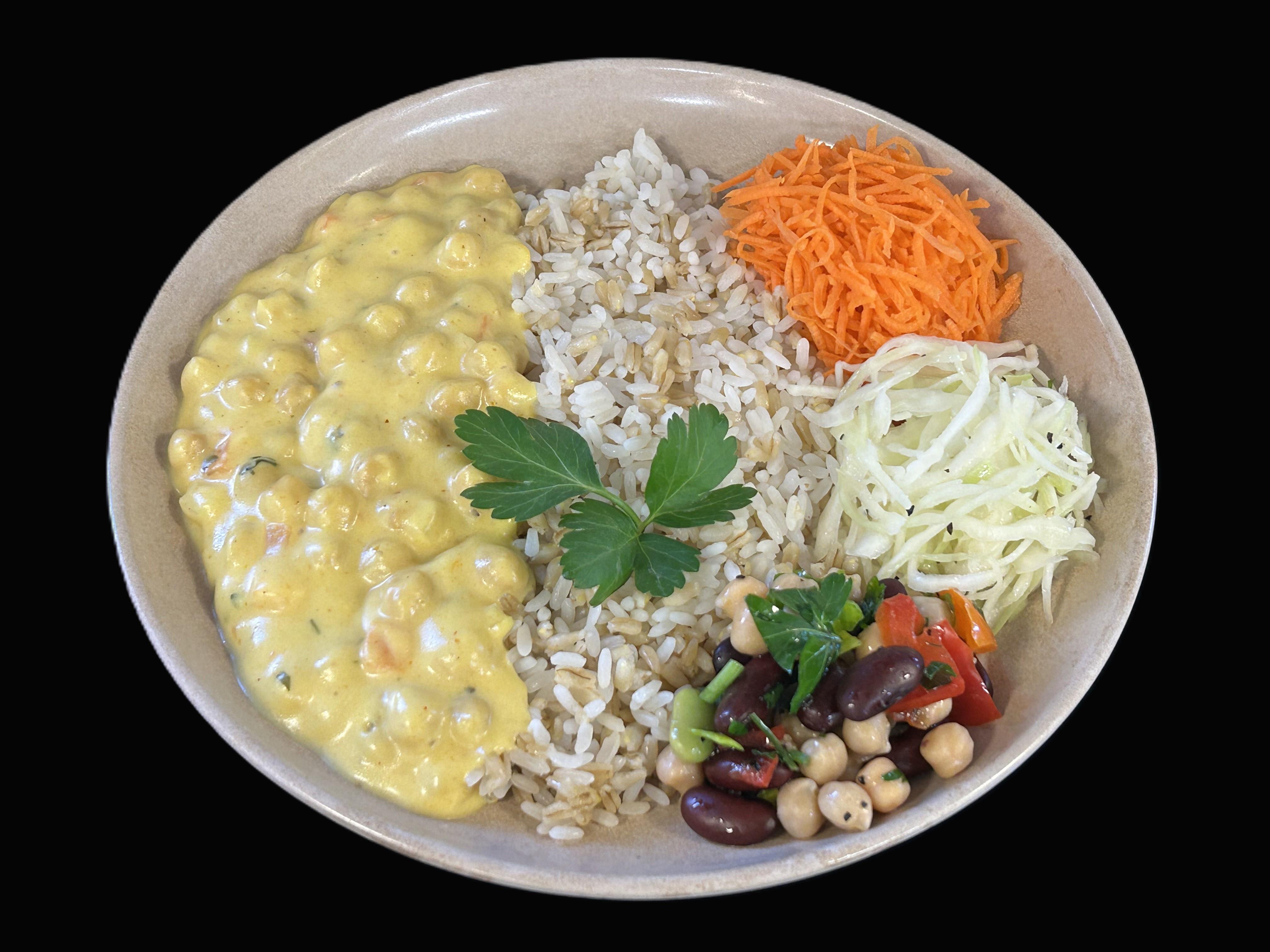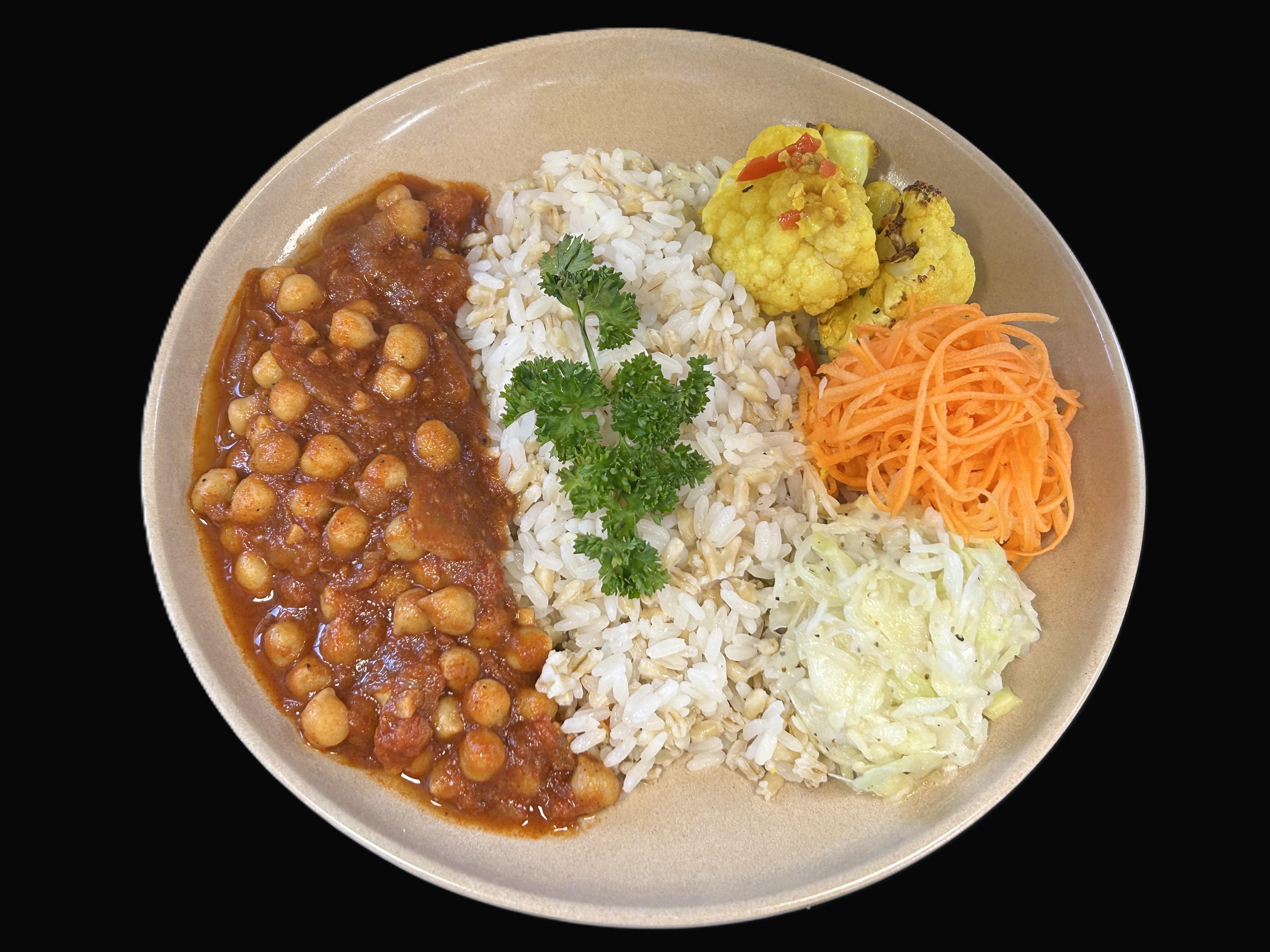 Kikärtsgryta serveras med ris- och havrerismix