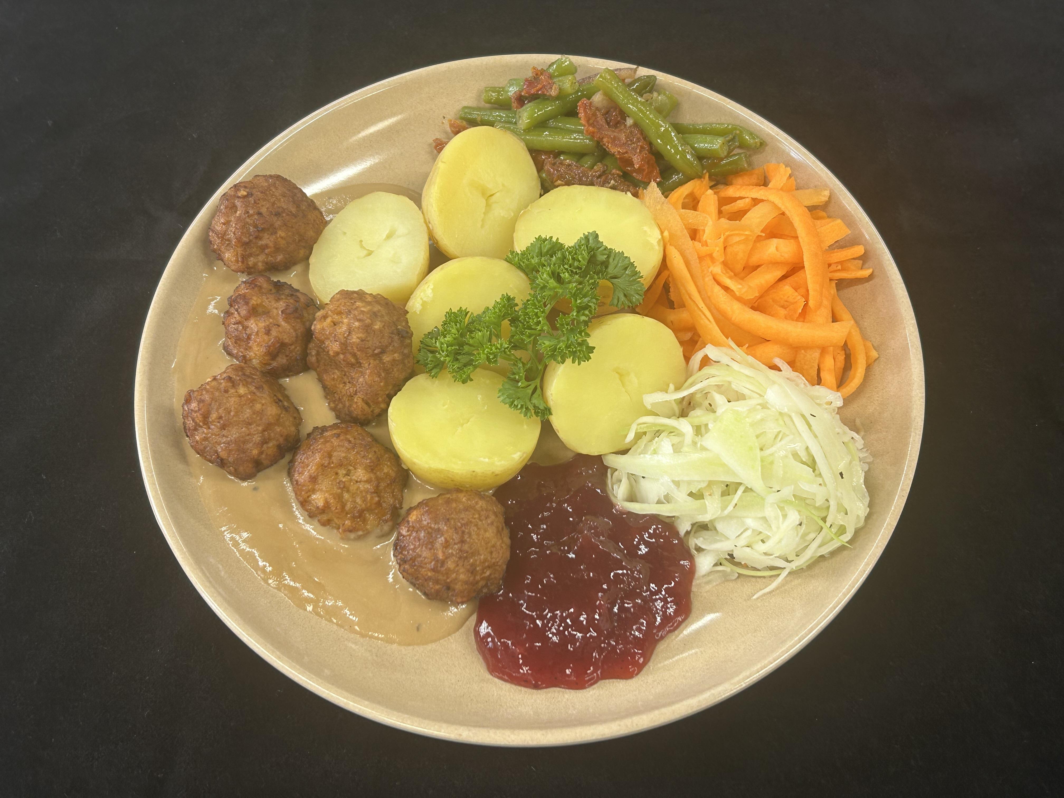 Kycklingköttbullar serveras med gräddsås och lingonsylt samt kokt potatis