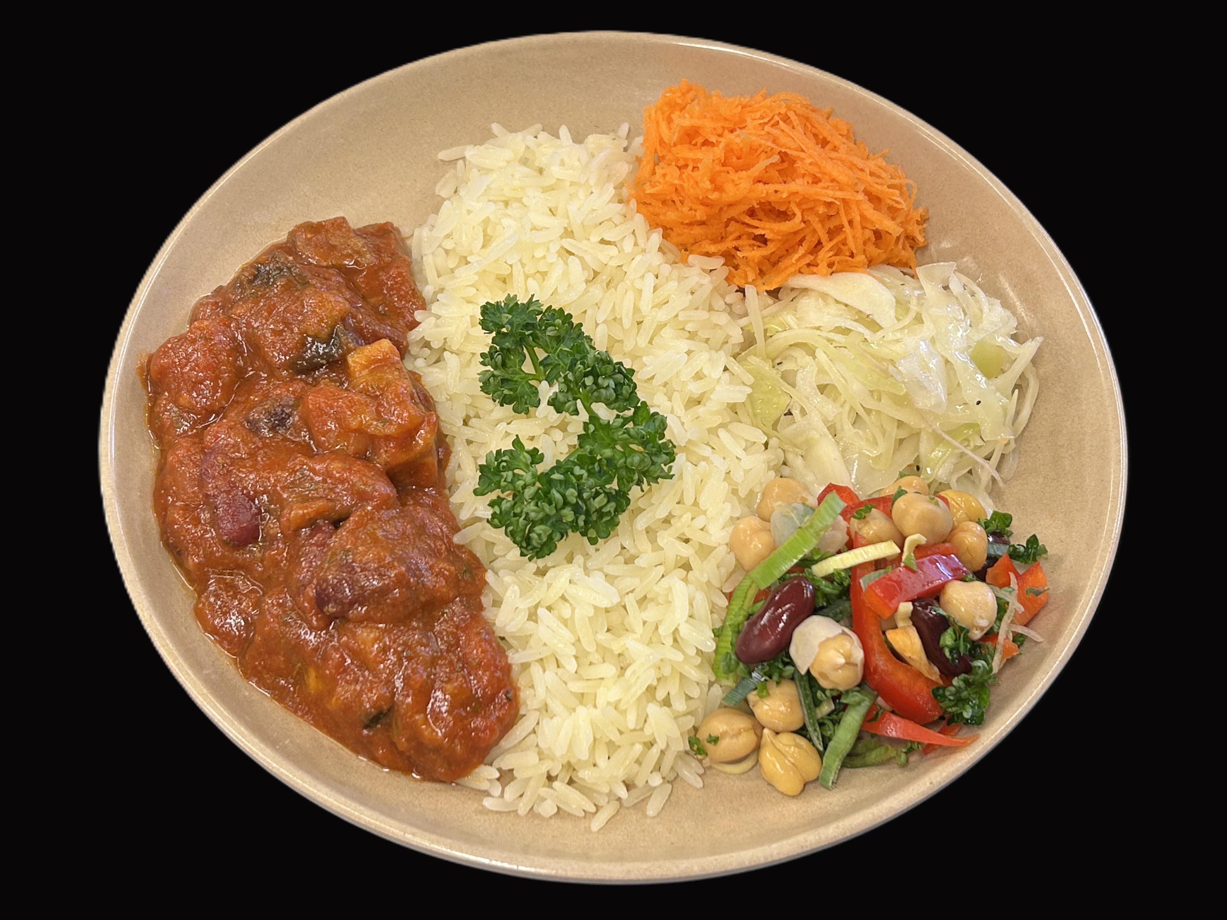 Aubergingryta med bönor serveras med ris