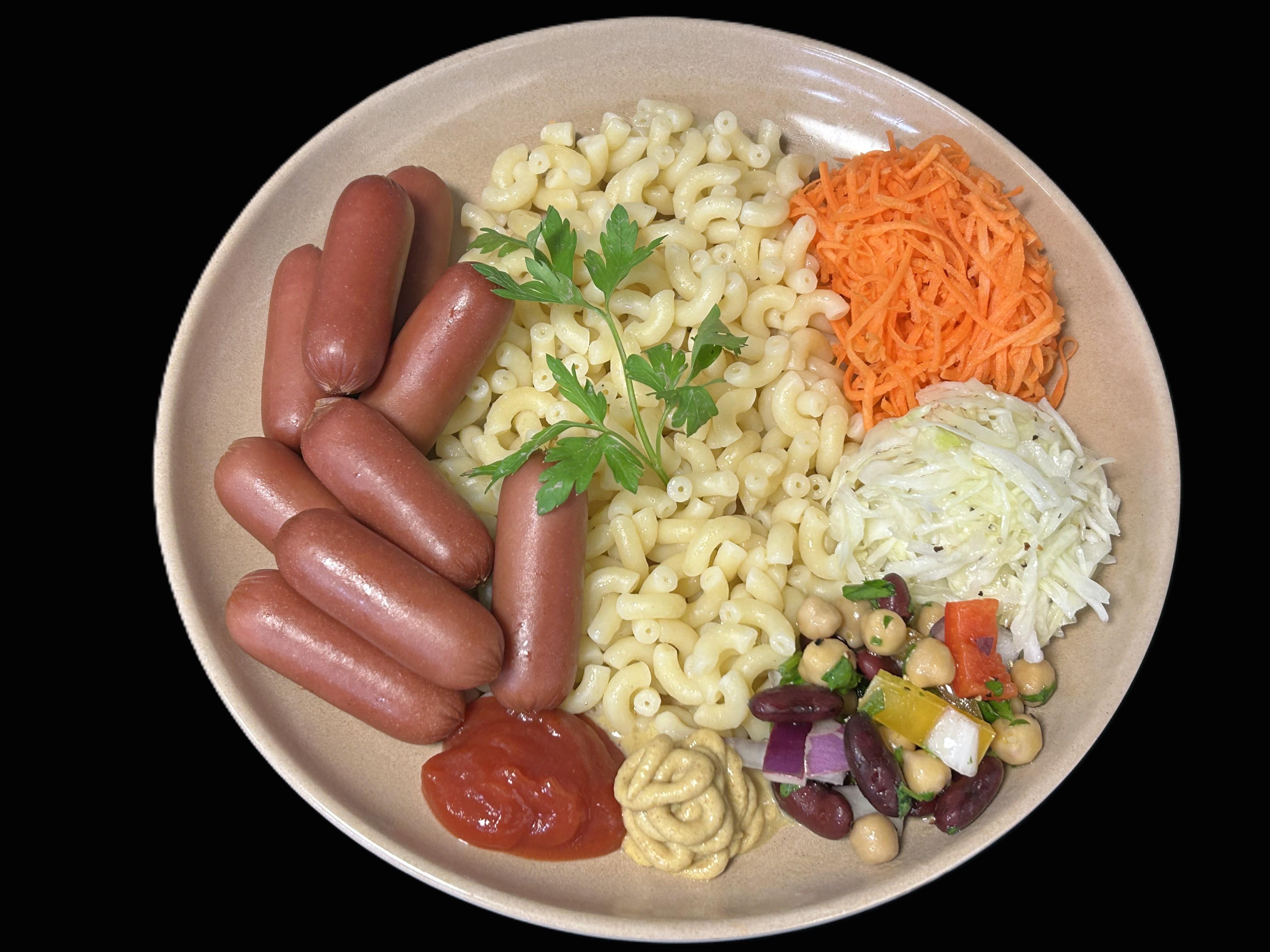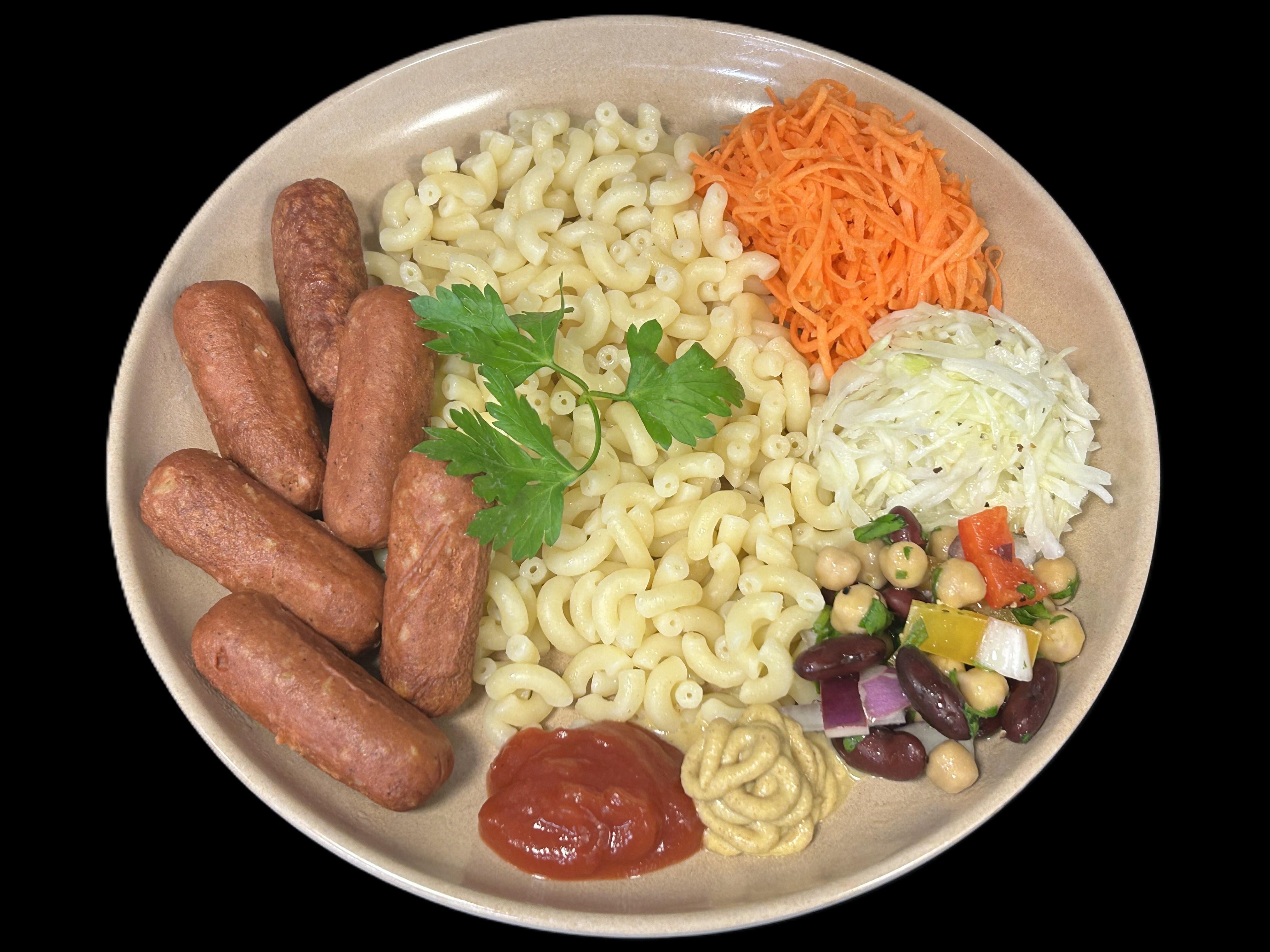 Vegoprinskorv serveras med senap & ketchup samt makaroner