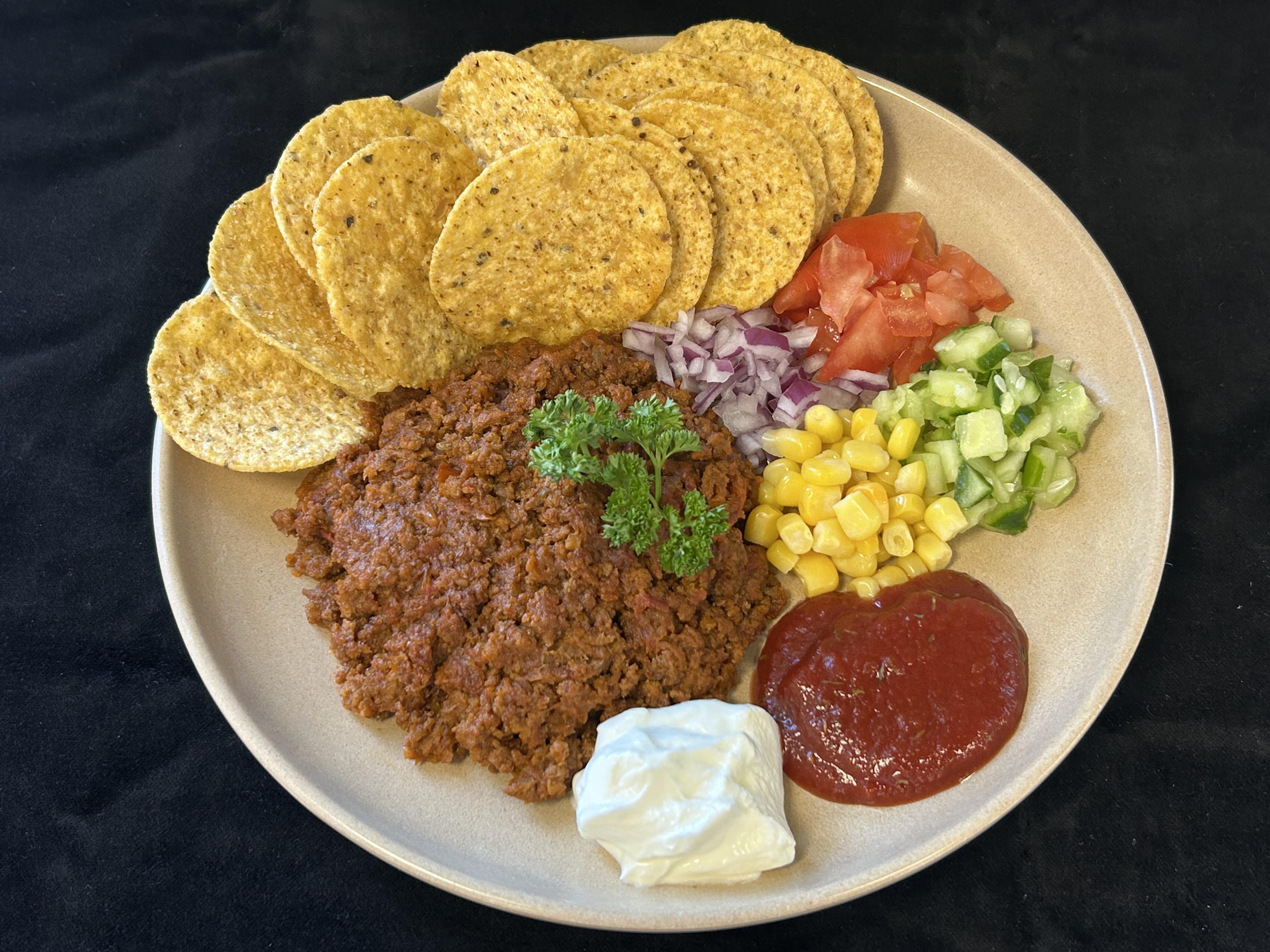 Tacoröra på sojafärs serveras med klassiska tacotillbehör