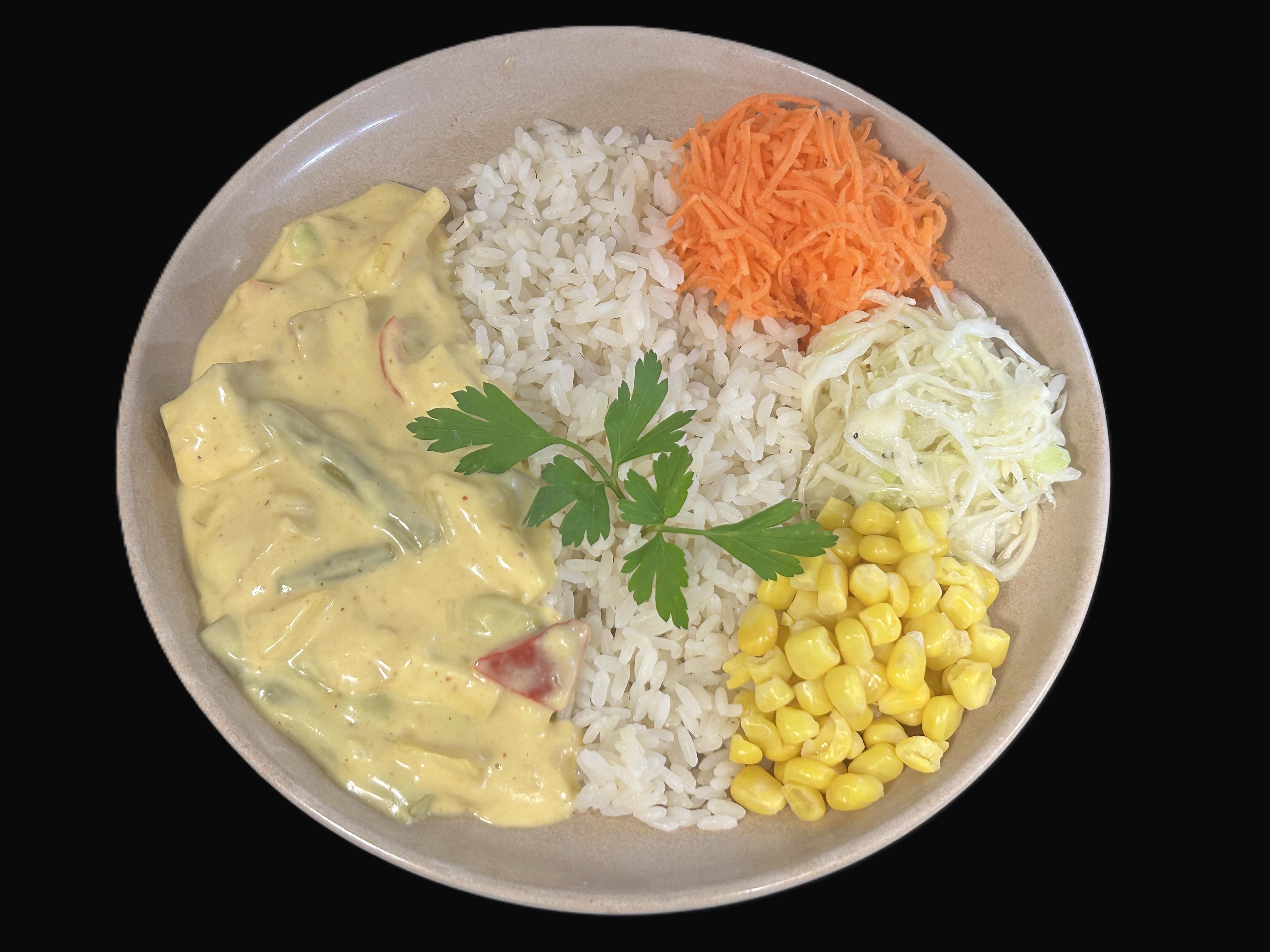 Thailändsk grönsaksgryta serveras med ris