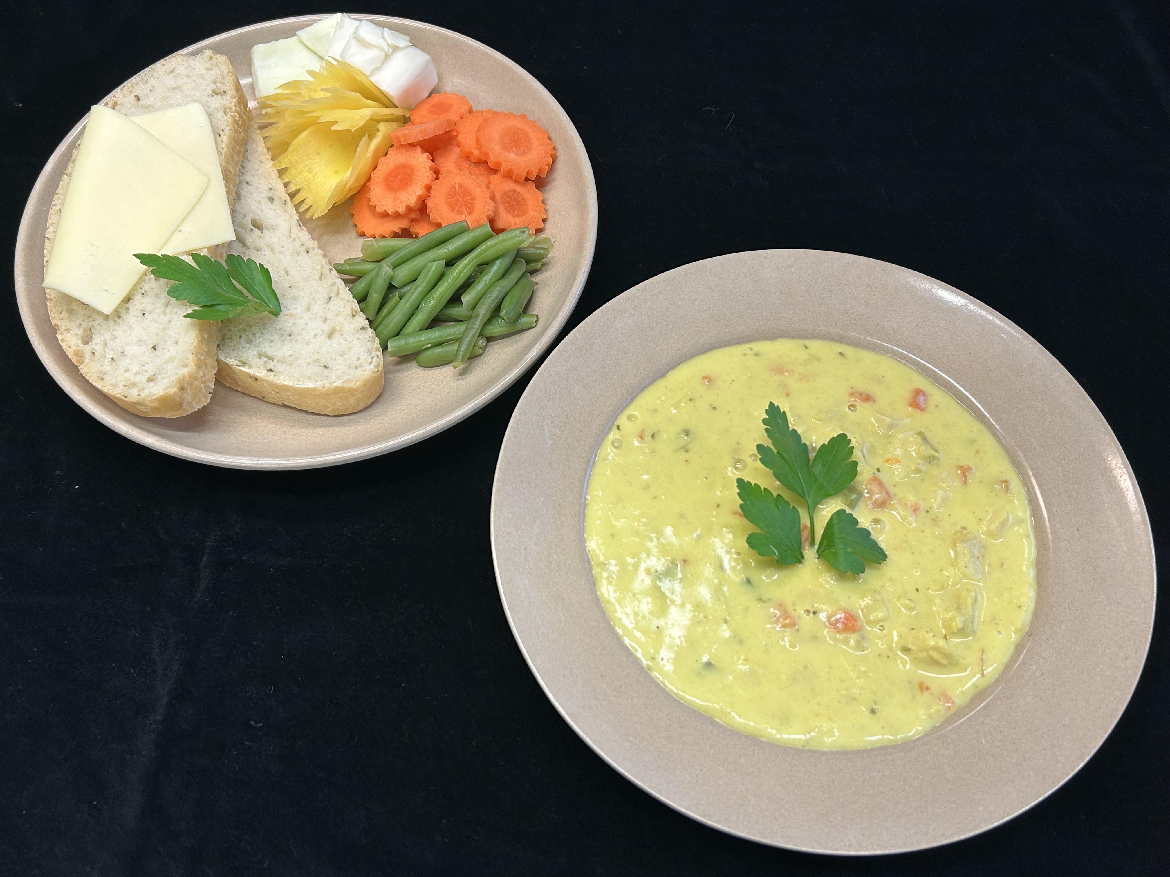 Minestronesoppa (växtbaserad) serveras med mjukt bröd samt pålägg