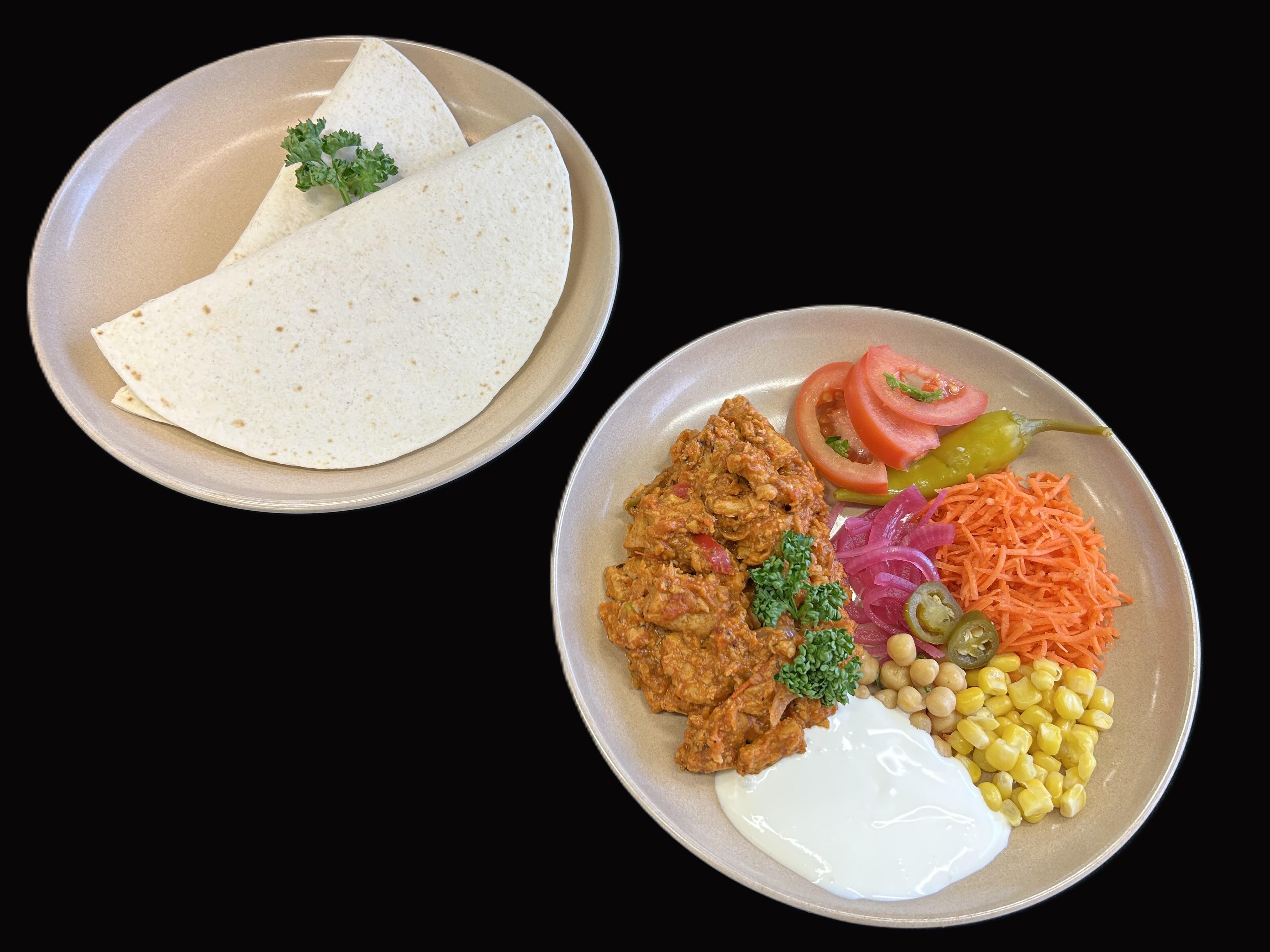 Bondbönsfajitas serveras med vitlökssås samt tortillabröd