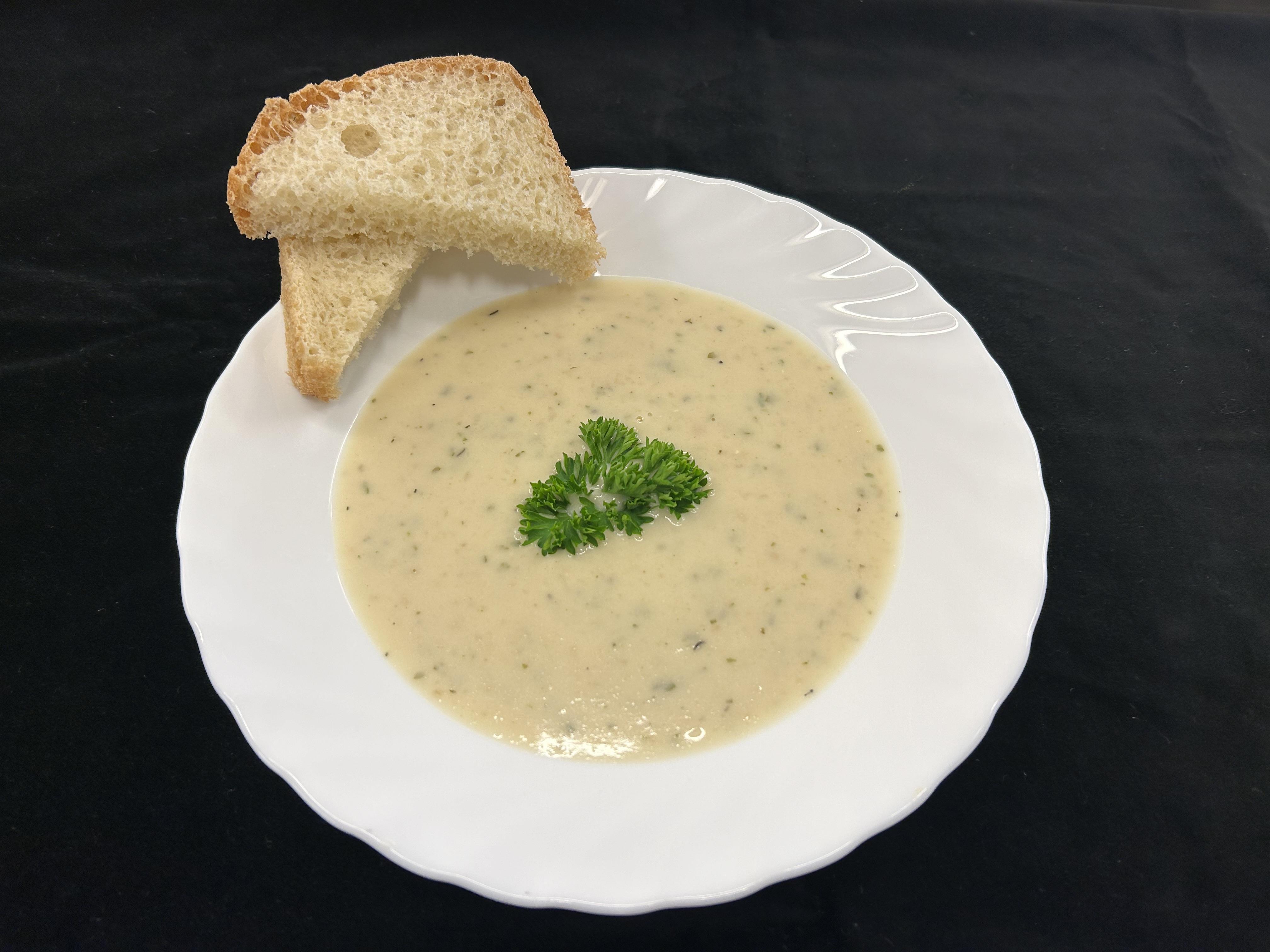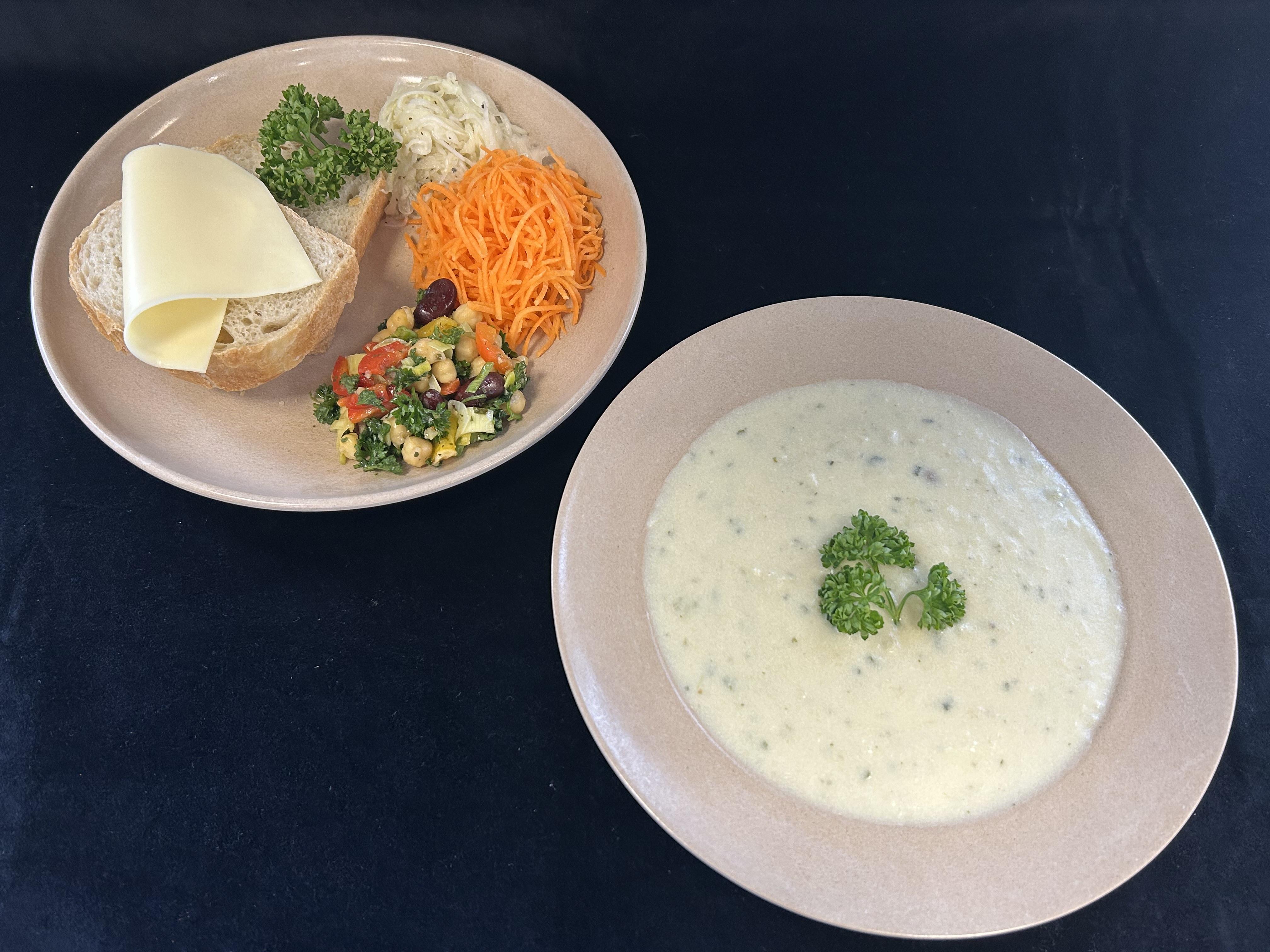 Potatis- och purjolökssoppa serveras med mjukt bröd samt pålägg