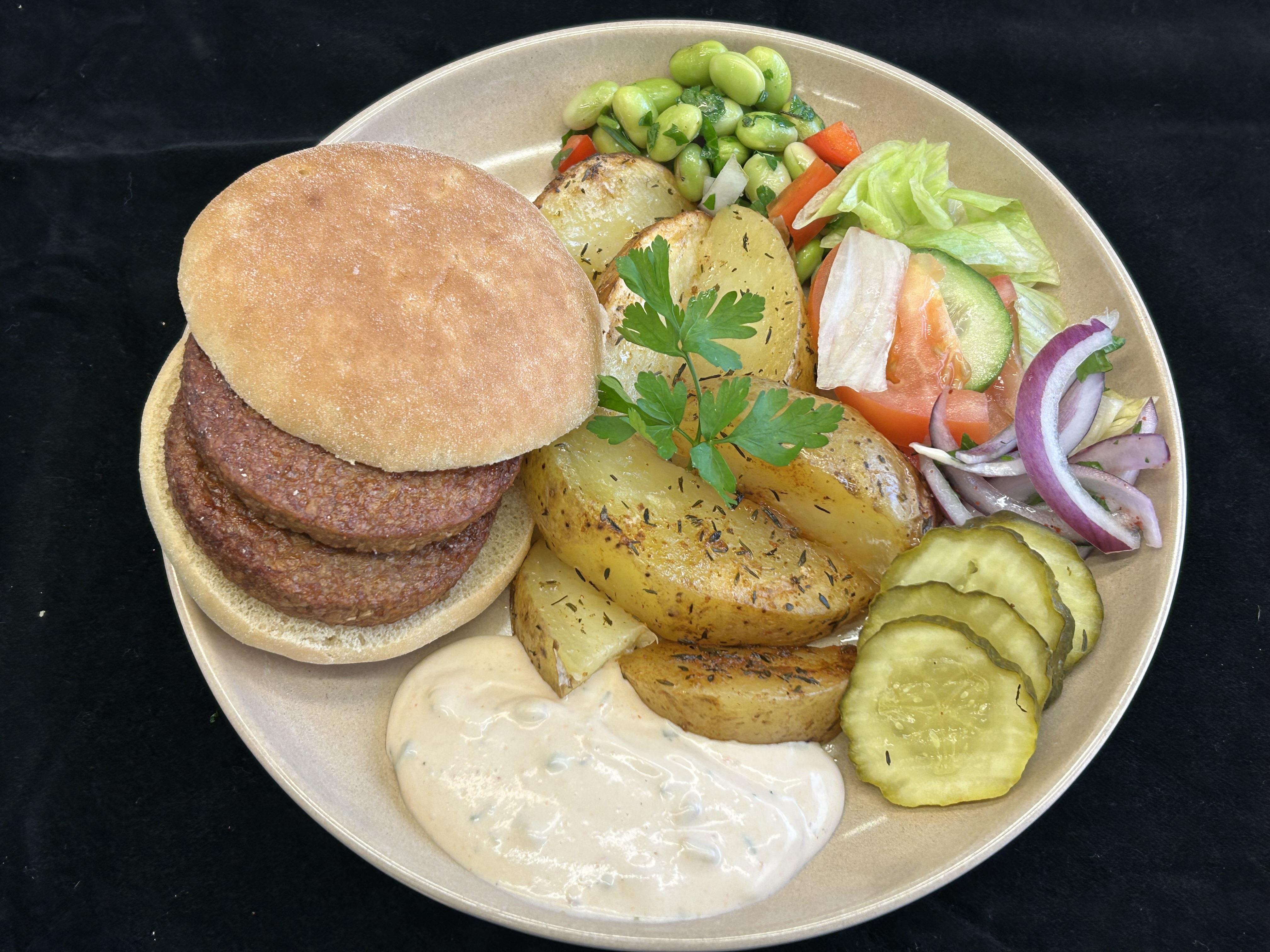 Vegoburgare serveras med dressing, bröd samt rostad potatis