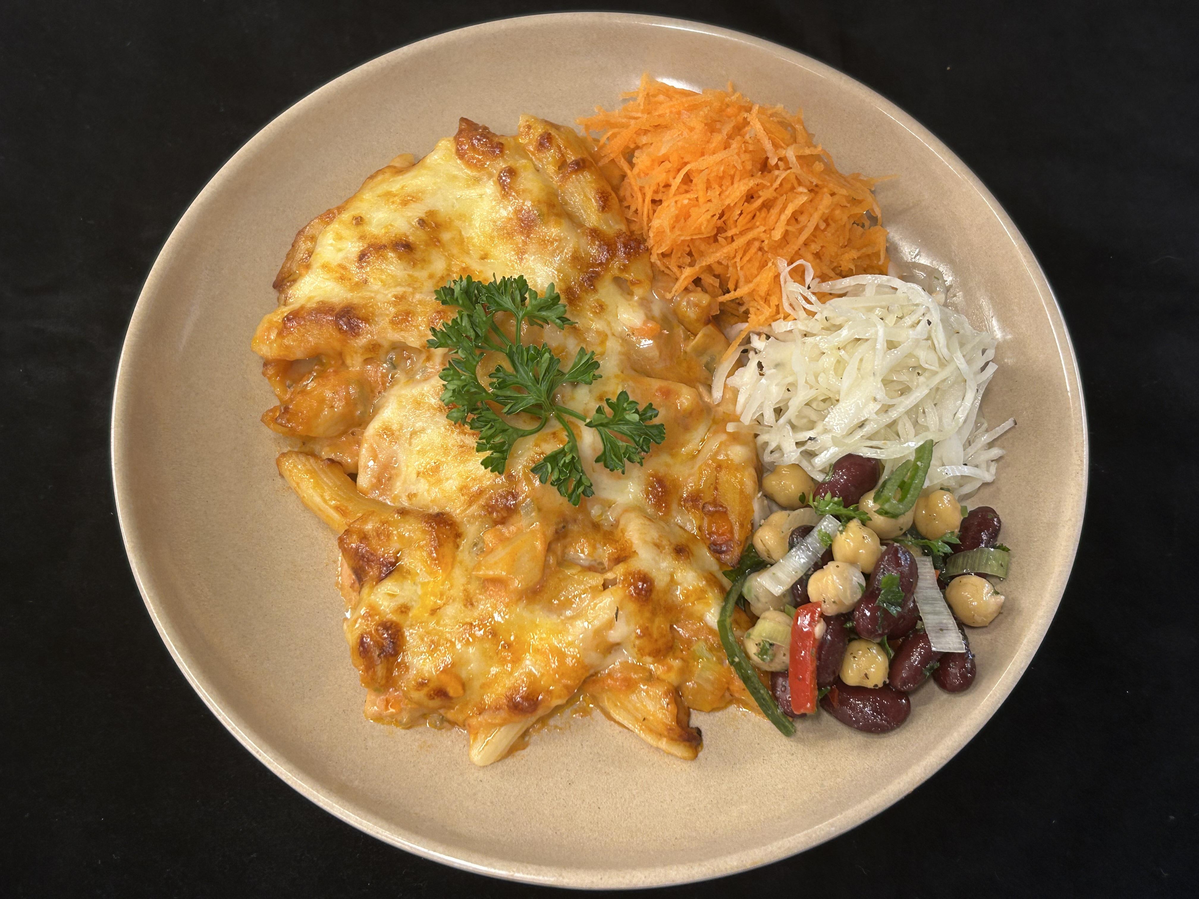 Oumphbollar serveras med kryddig tomatsås samt kokt makaroner